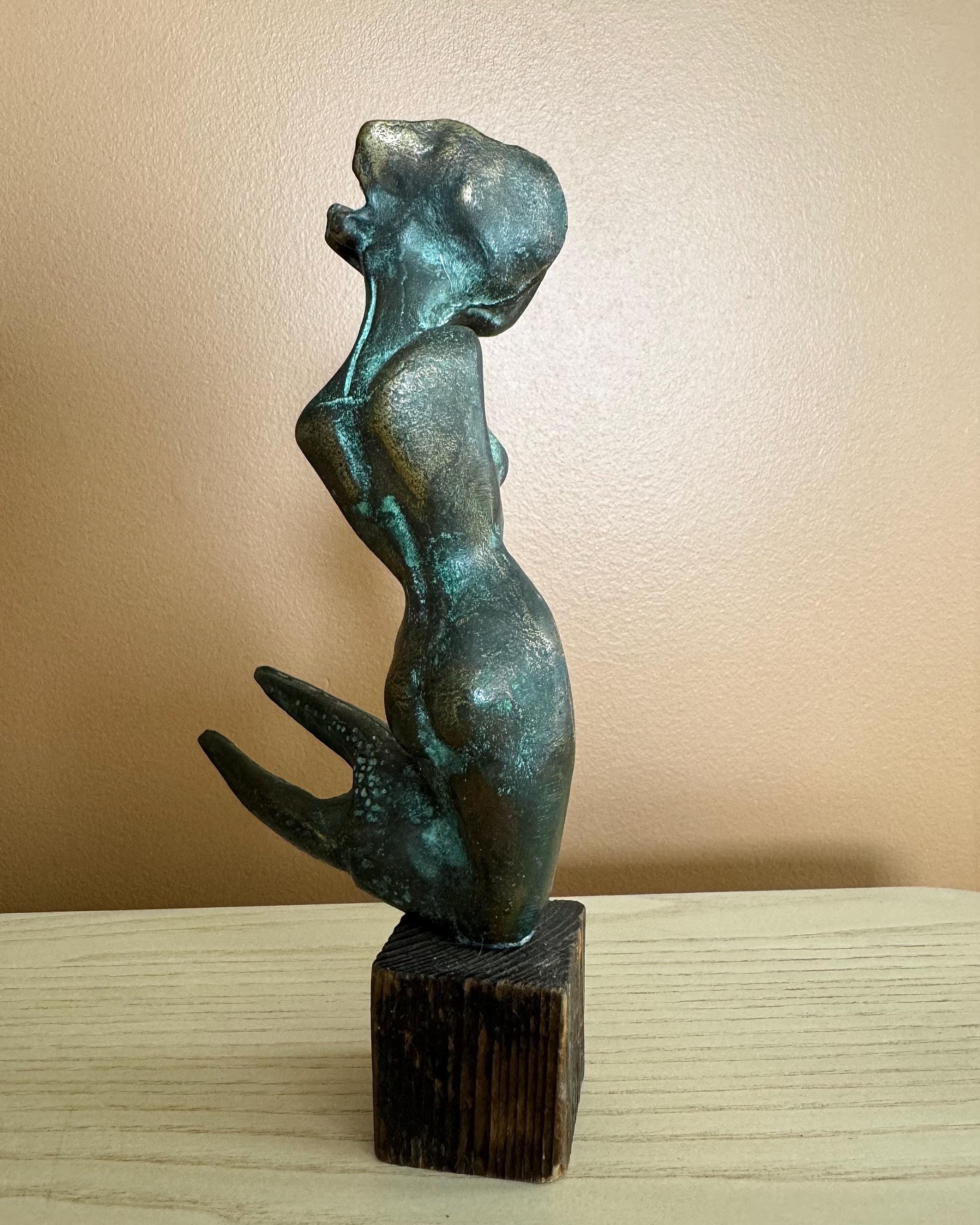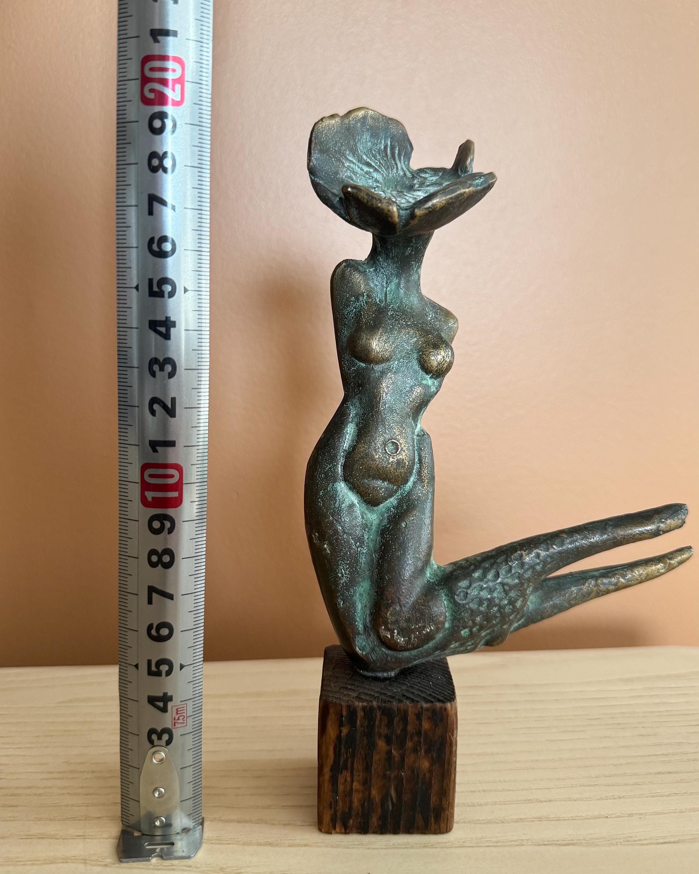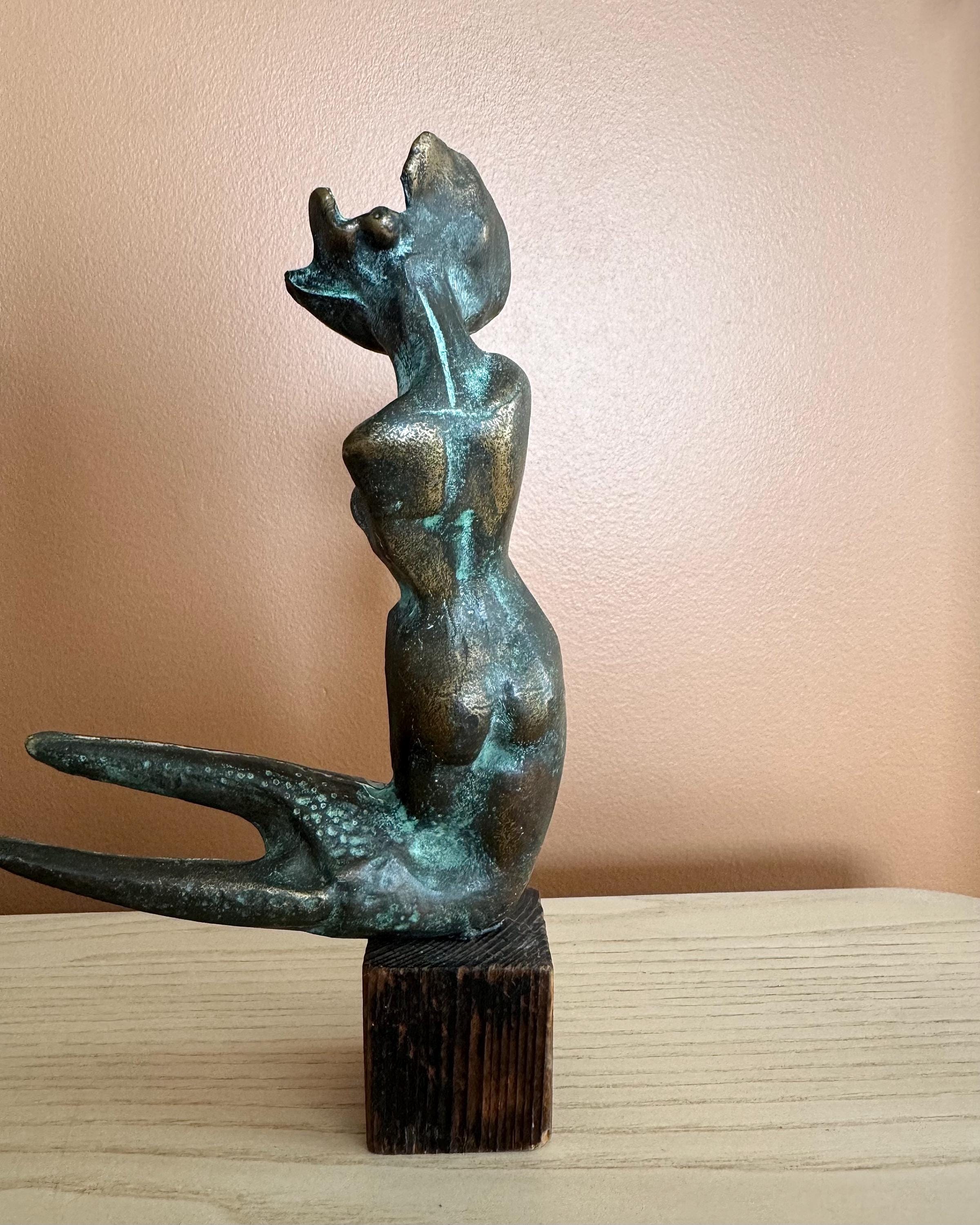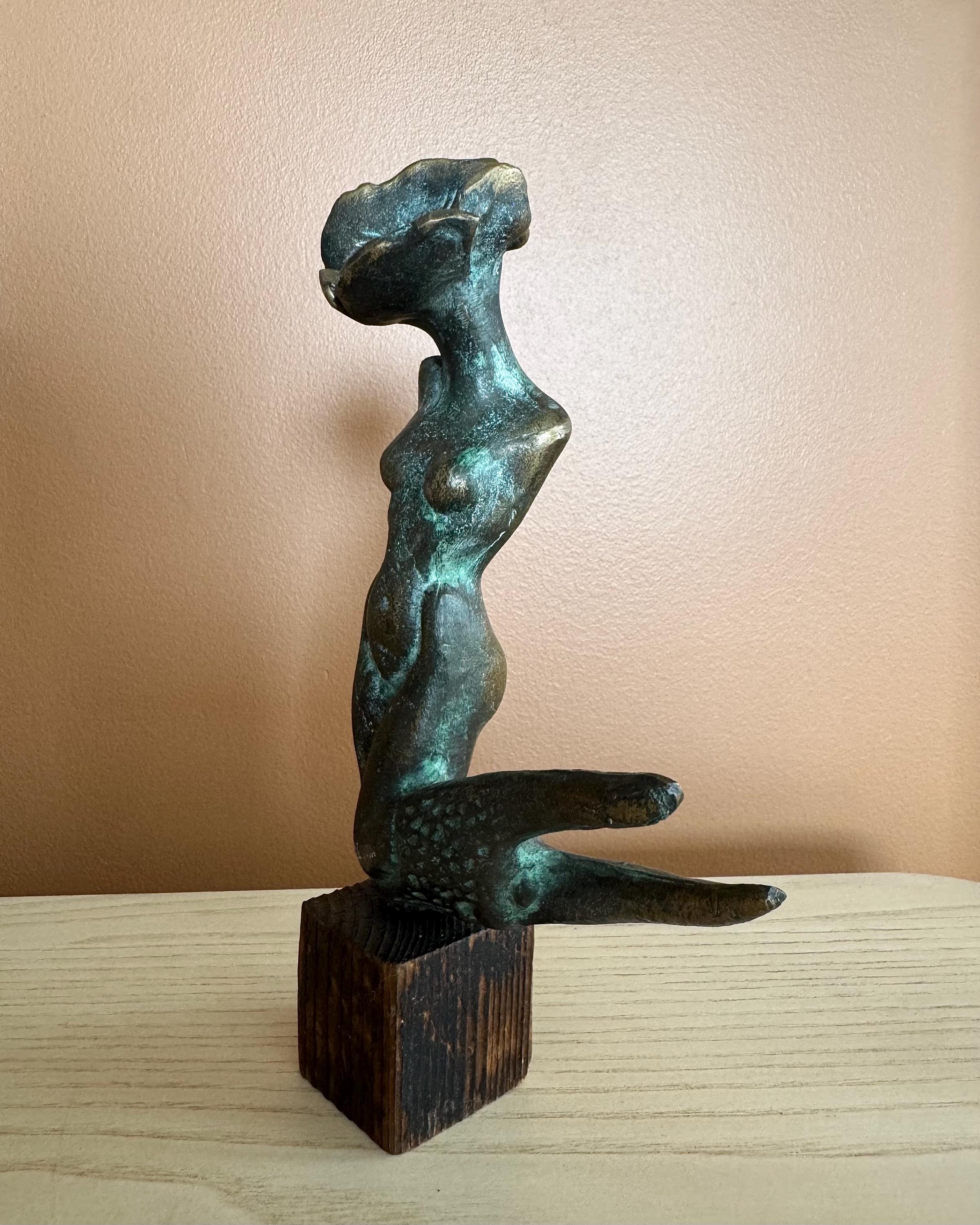 Small bronze figure with an unusual, slightly surreal form. The head opens like a poppy flower and the tail finishes in a claw shape. It sits somewhere between mermaid, creature, and symbol. The style aligns with mid-century Brutalism and small studio sculpture from the 1960s and 1970s. Textural surface. Warm, even patina.