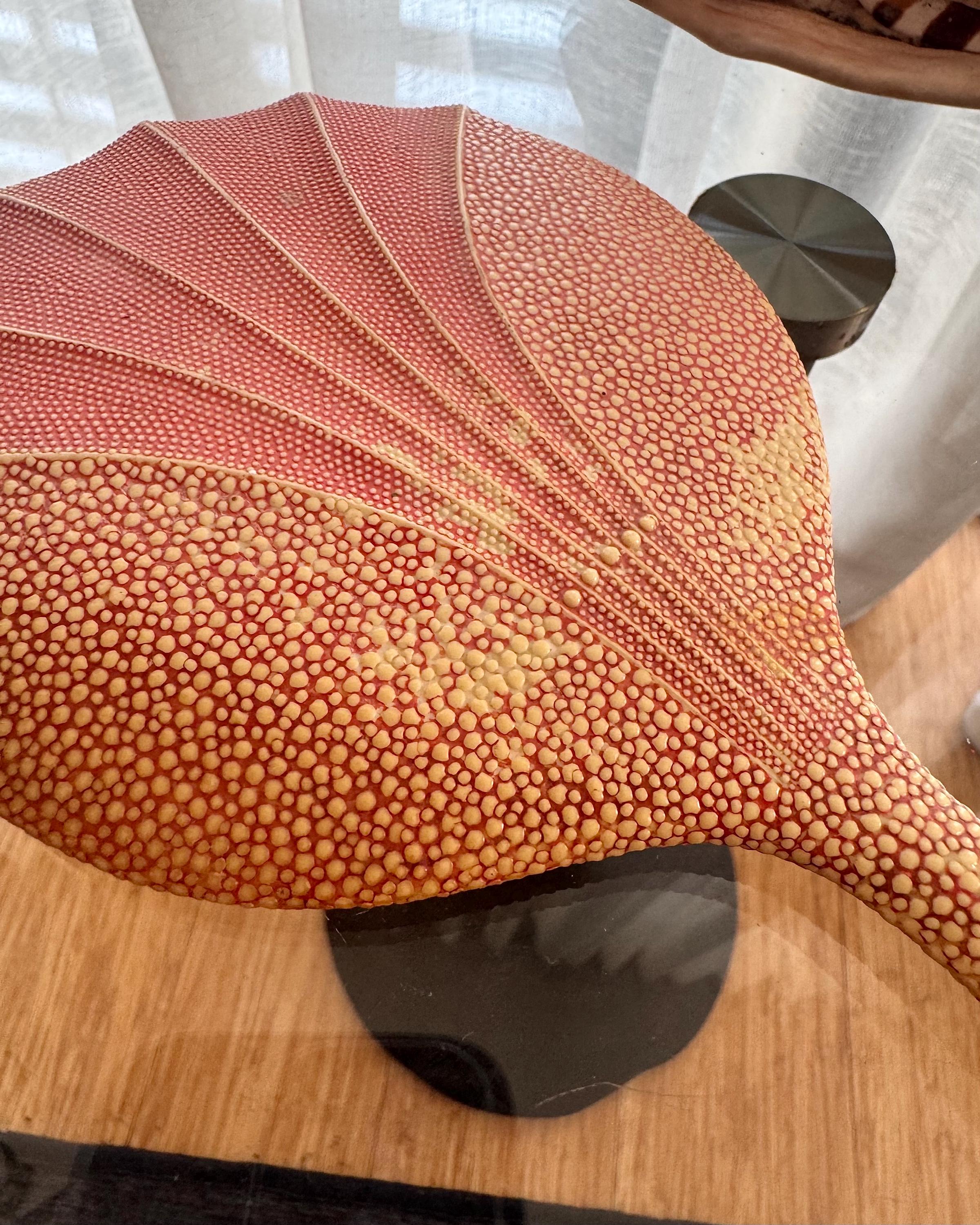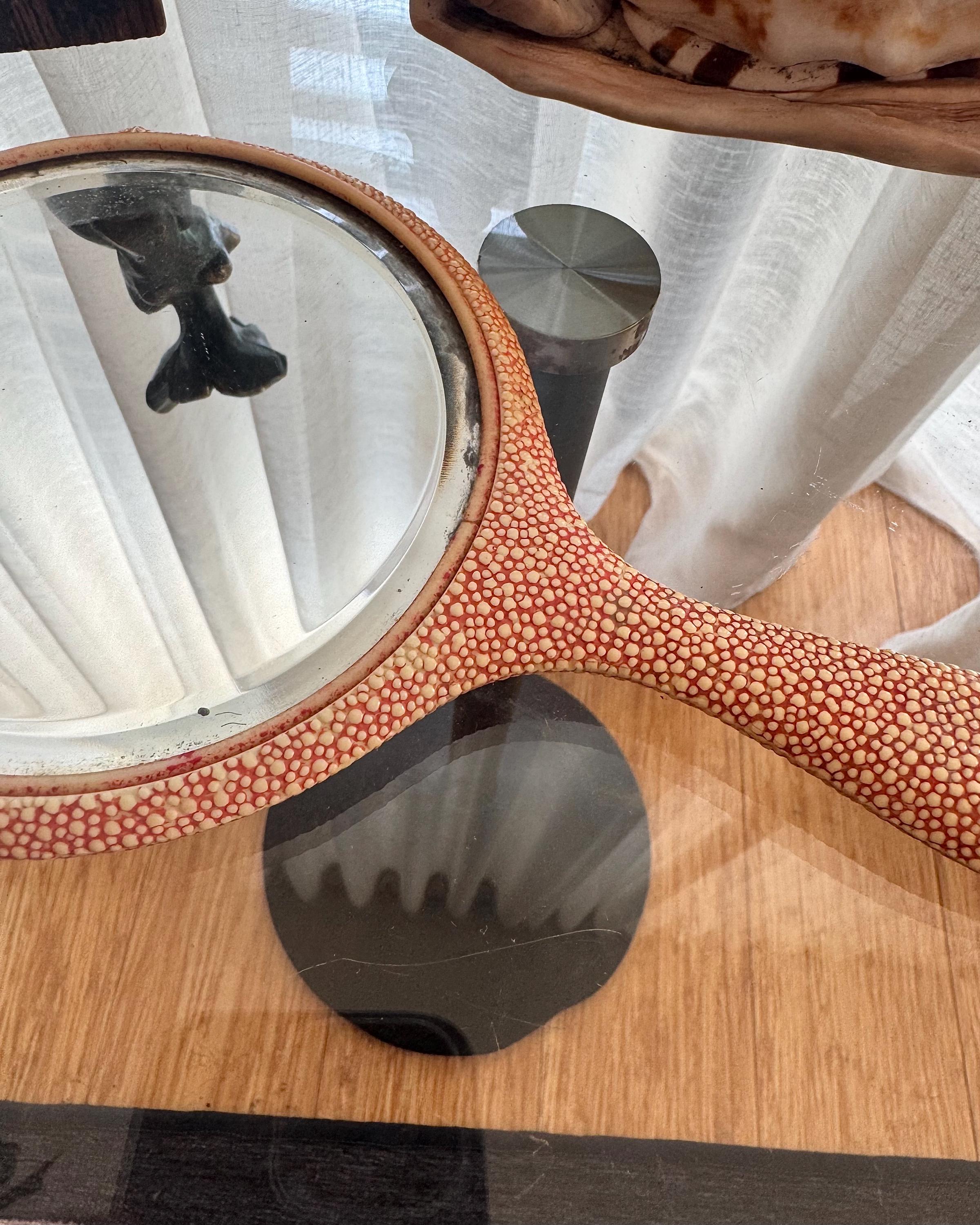 Vintage Bakelite hand mirror in a soft coral tone with a textured, shagreen-like surface. Warm and comfortable to hold. The colour and wear give it a gentle, lived-in quality rather than something polished or new.