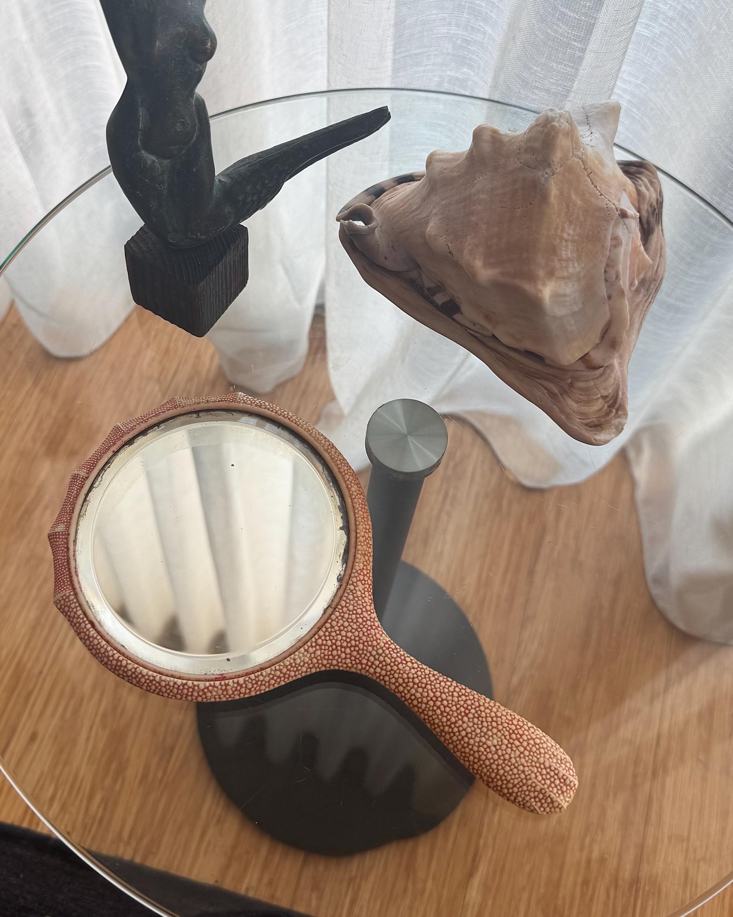 The mirror has some natural aging and soft clouding near the edge, which suits the piece. The surface texture gives it presence without feeling showy. A simple, characterful object for a bedside or dressing table.