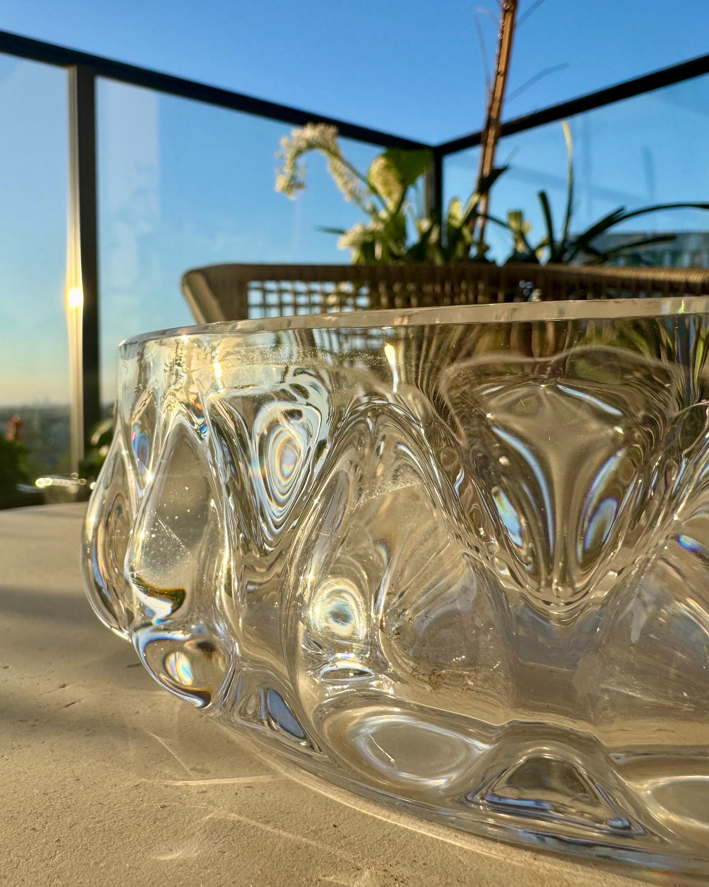 This sculptural piece features undulating, bubble-like reliefs that refract light beautifully, creating shifting reflections across its thick clear glass.