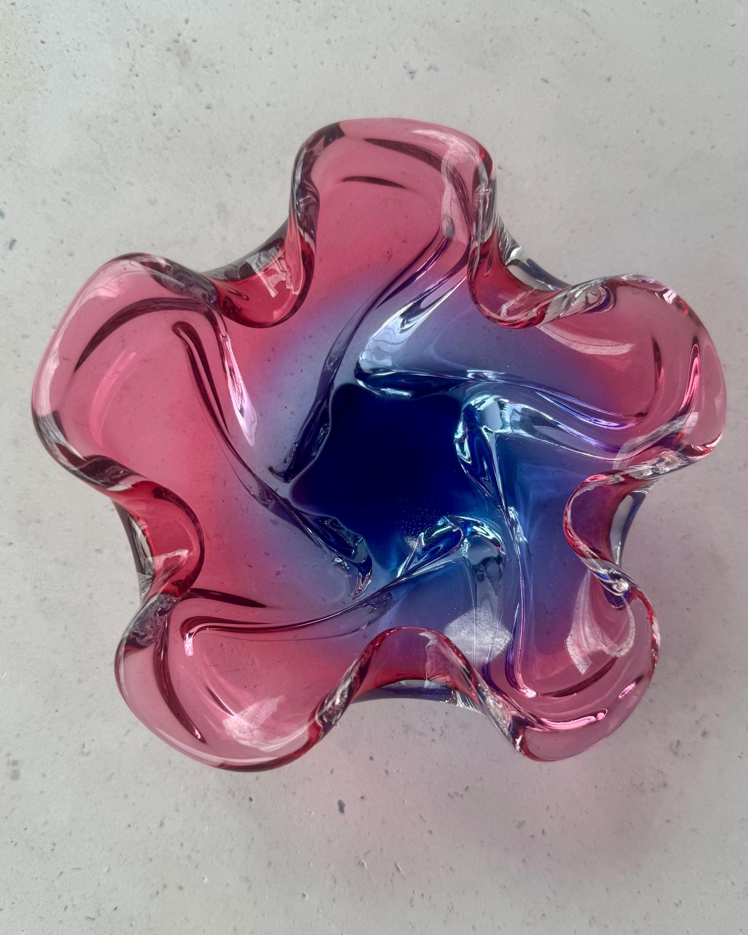 A beautiful vintage Murano-style sommerso art glass bowl featuring a rich blend of pink and blue encased in thick, clear glass. The organic ruffled form catches the light from every angle, making it a standout decorative piece.