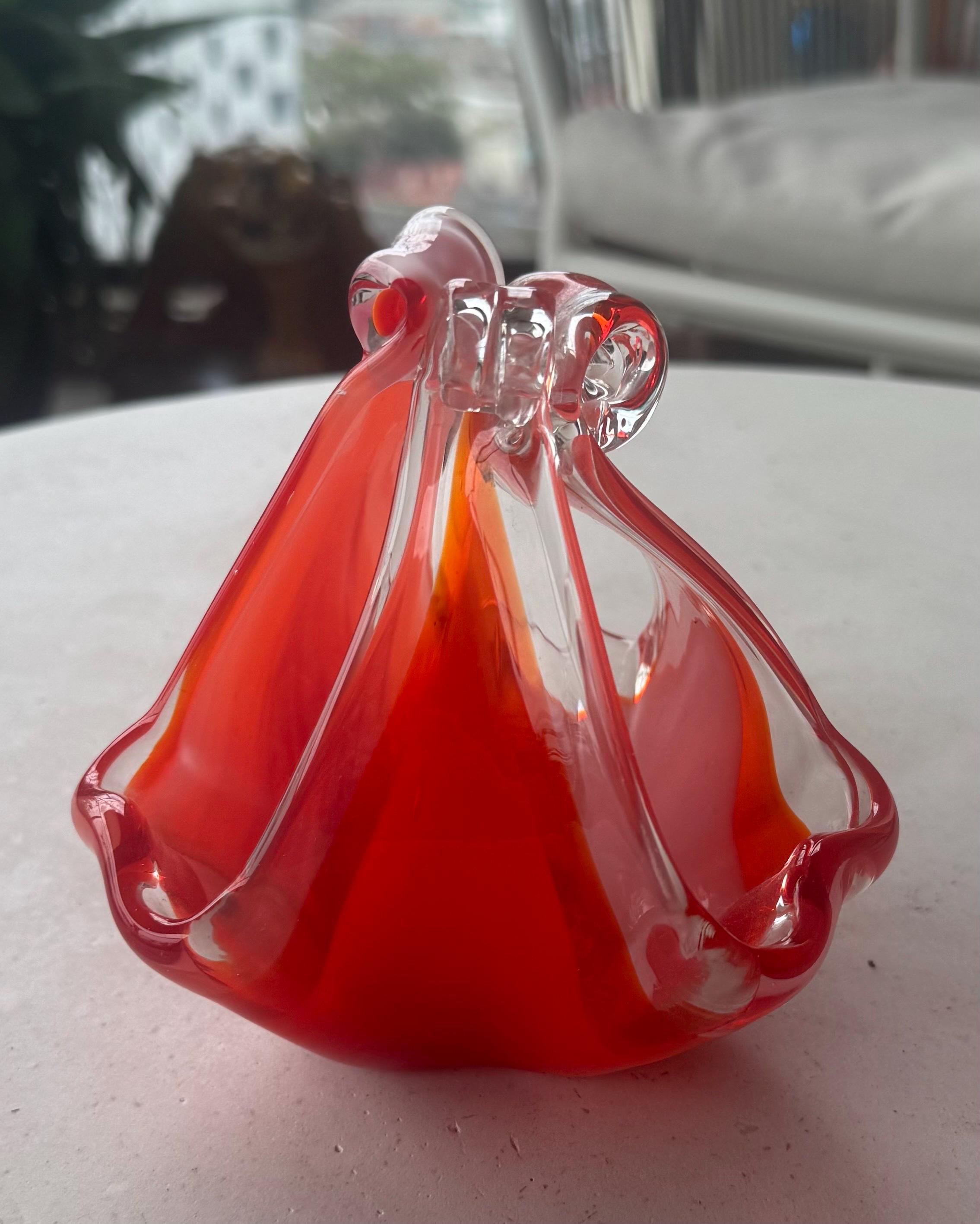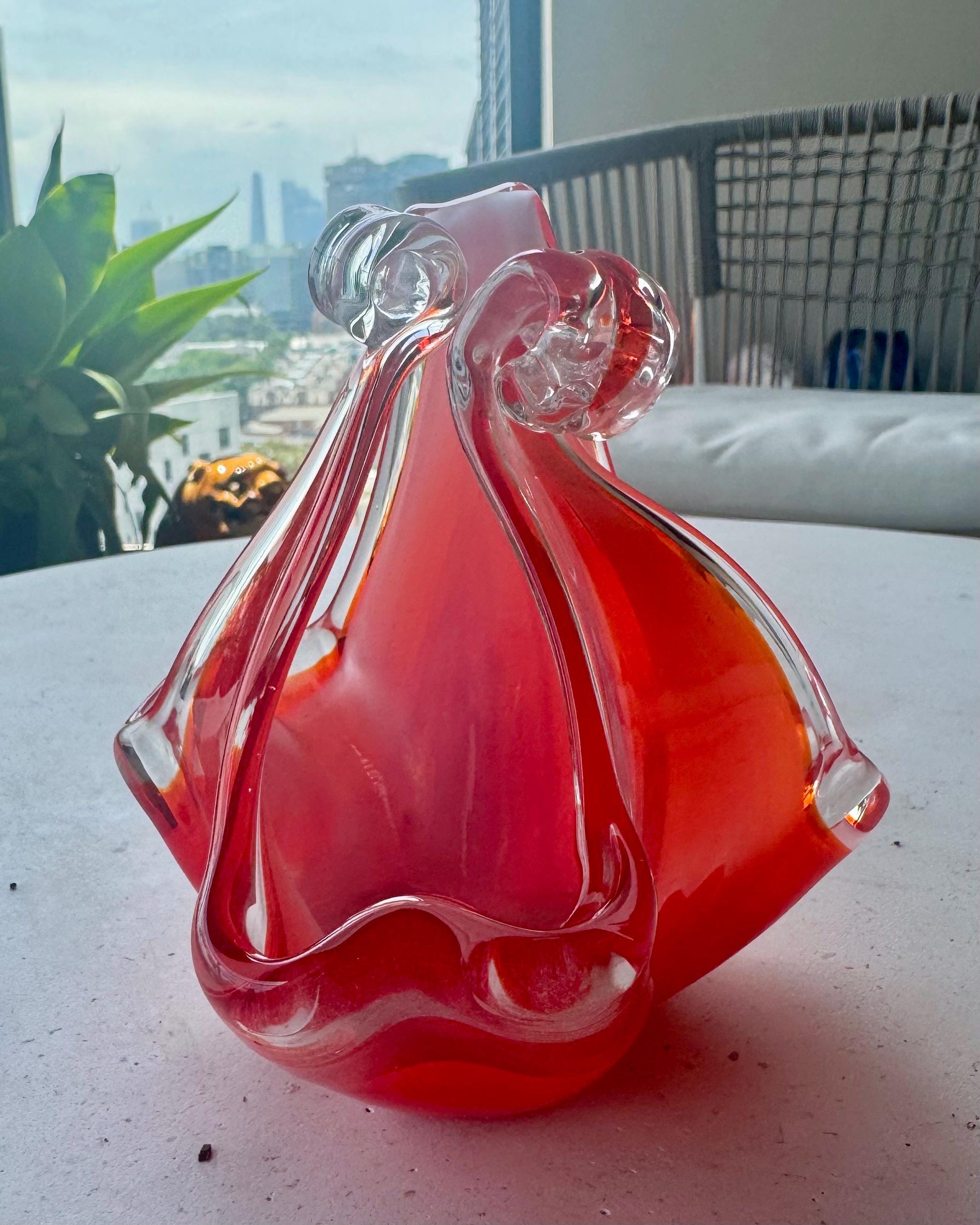 A striking vintage Murano-style sommerso art glass sculpture, featuring a deep red core encased in clear glass. The freeform, flame-like shape flows upward in smooth pulled folds, catching the light beautifully from all angles.