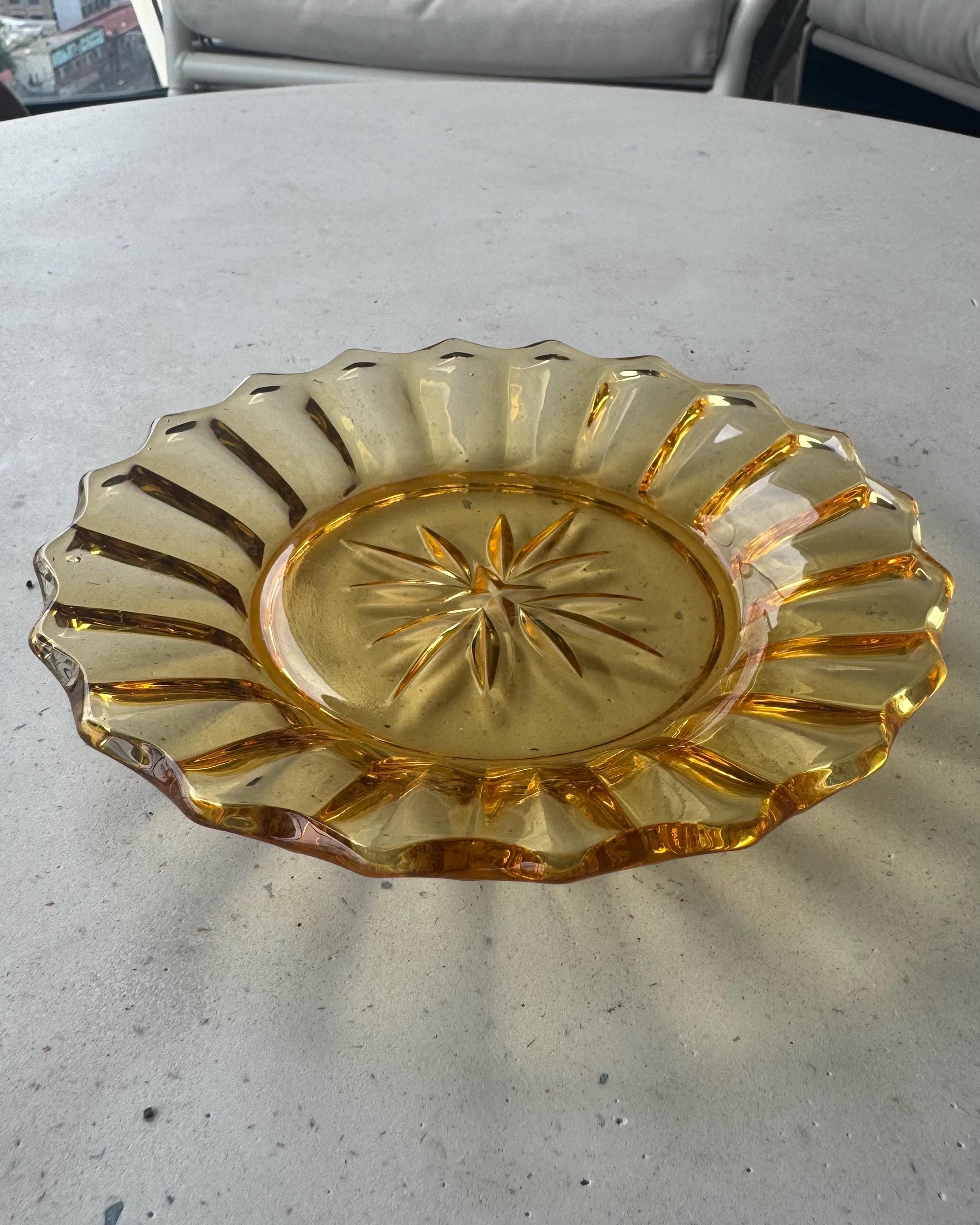 A charming vintage amber glass dish featuring a ruffled edge and a starburst design to the base. Made from mid-century pressed glass in a warm honey-amber colour, this piece adds instant retro charm to any room.