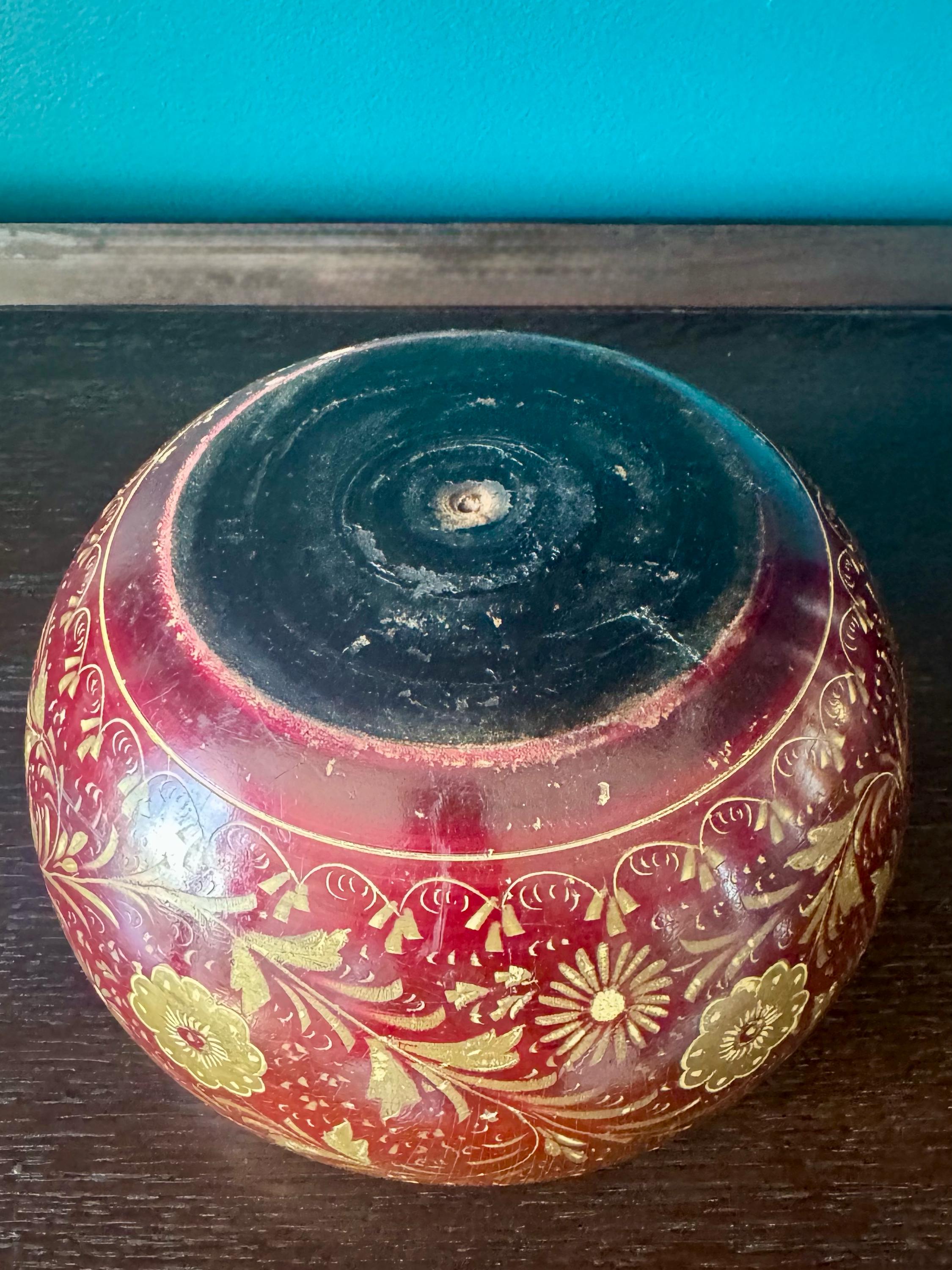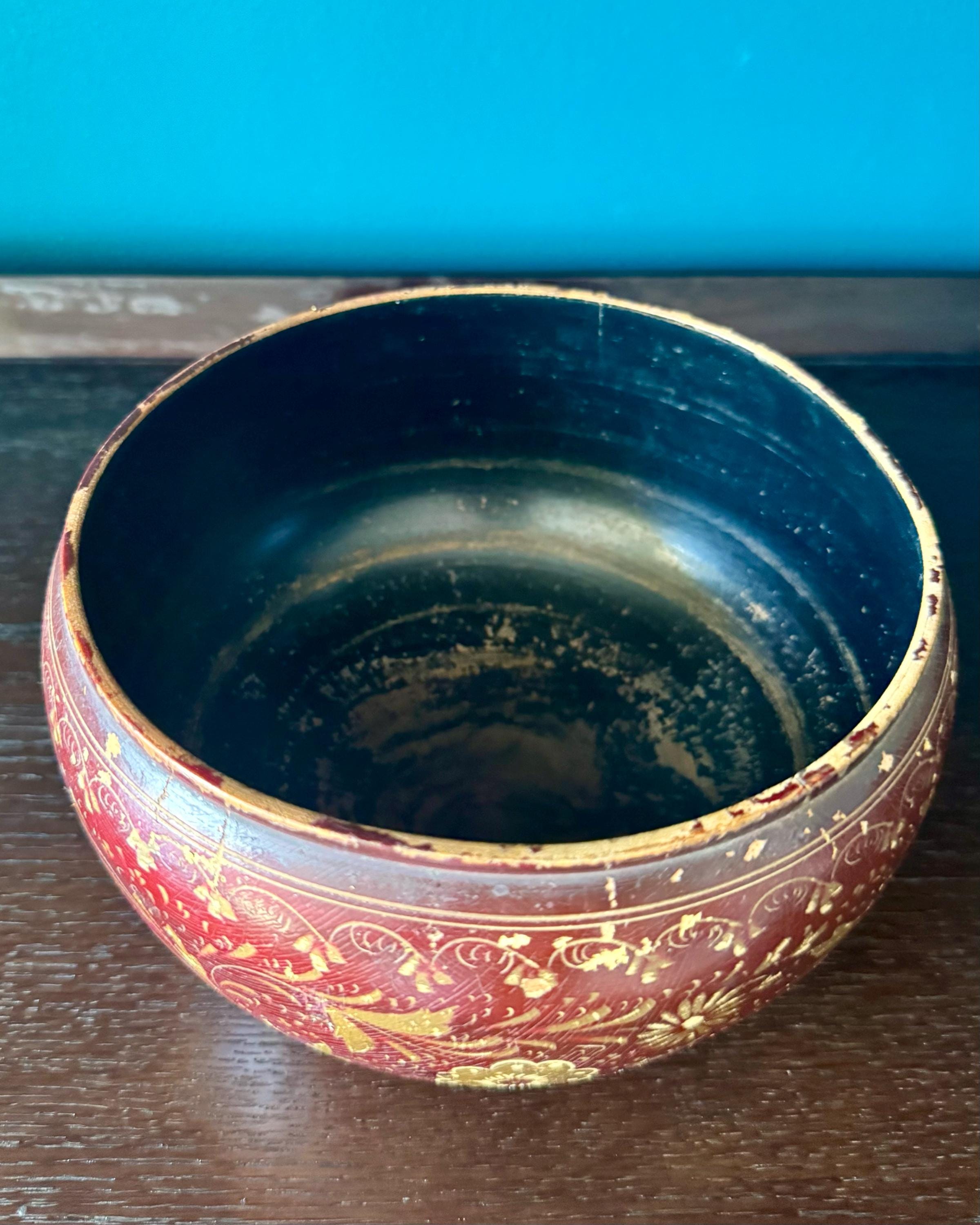 Vintage Burmese lacquerware bowl hand-painted in red and gold with traditional floral and scroll motifs.