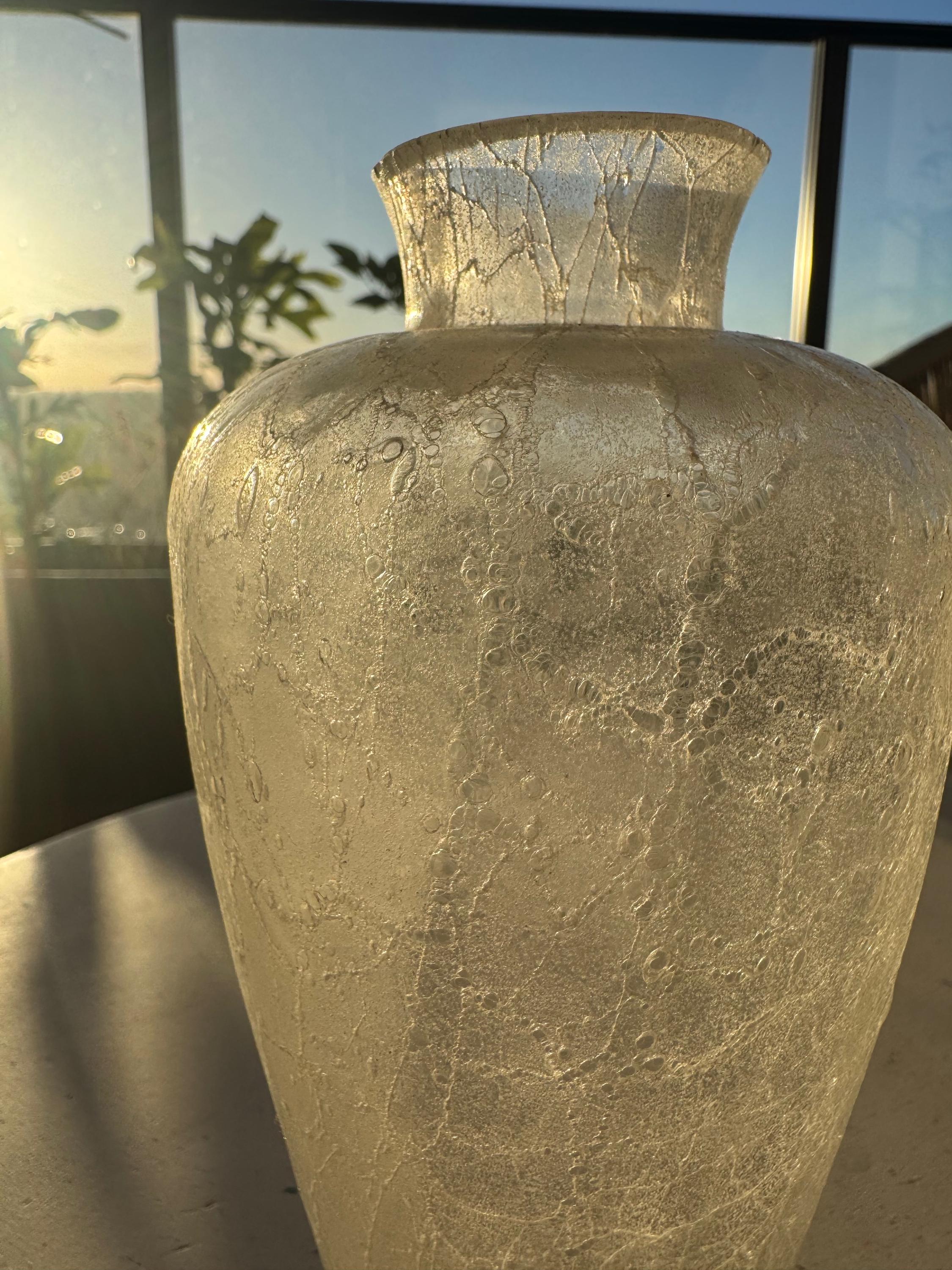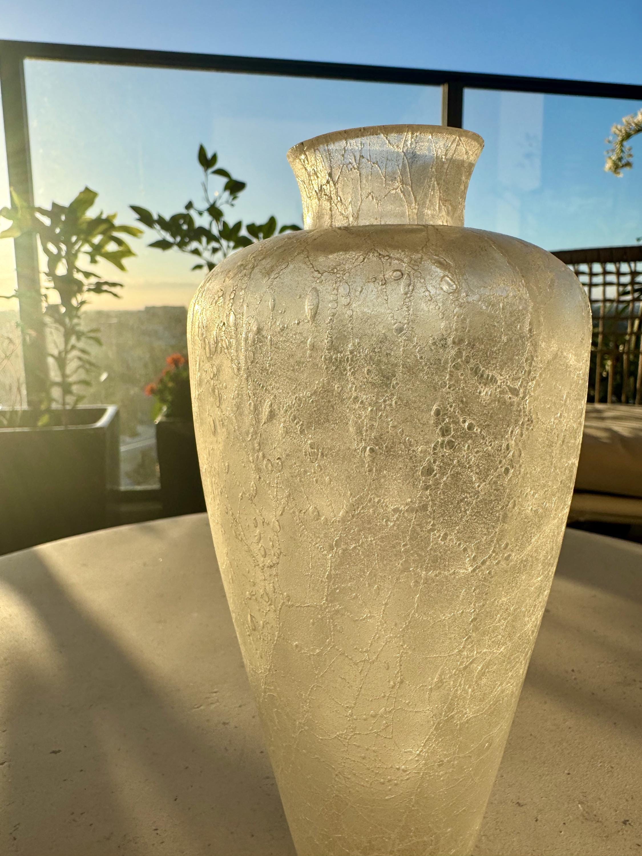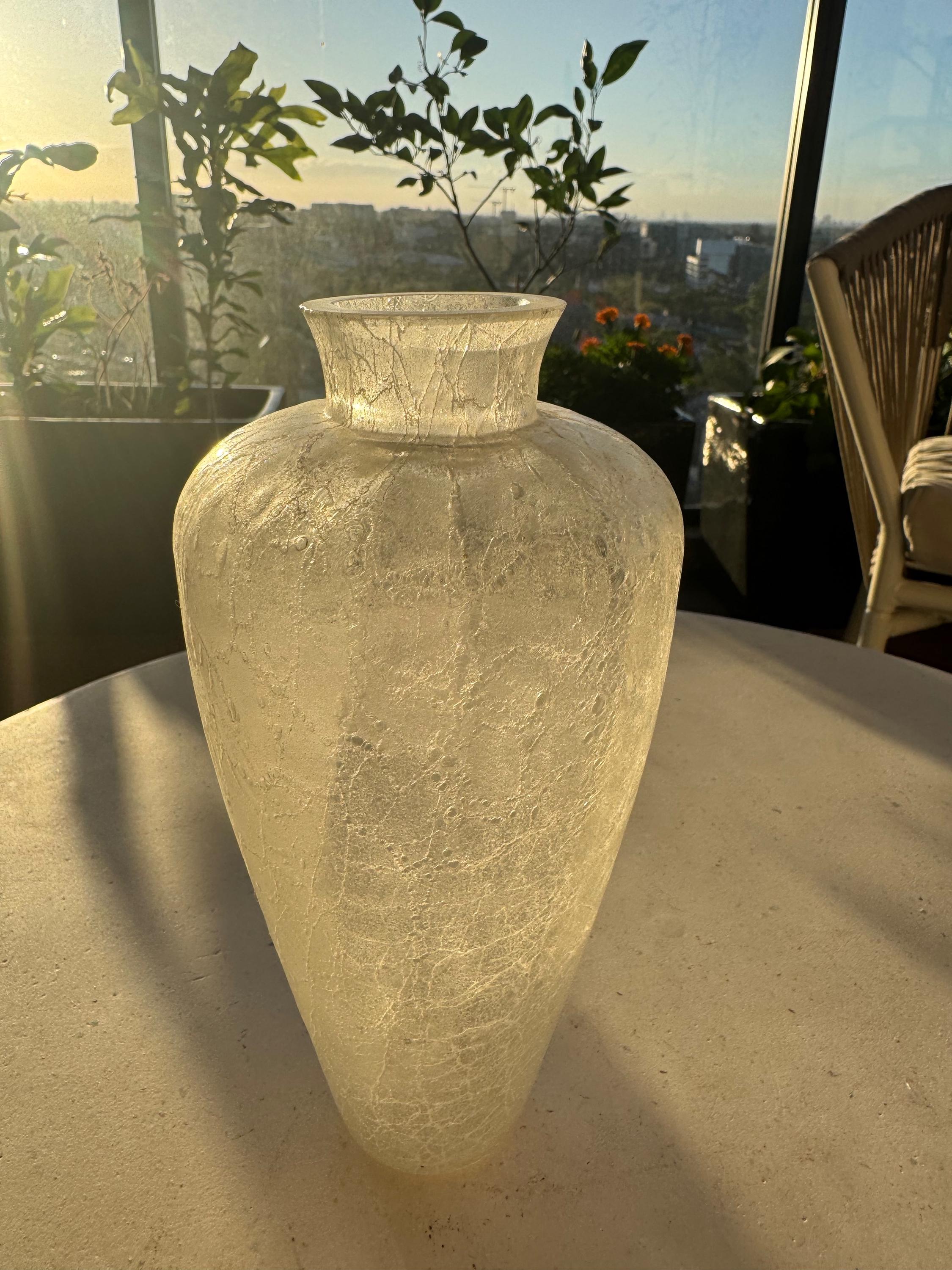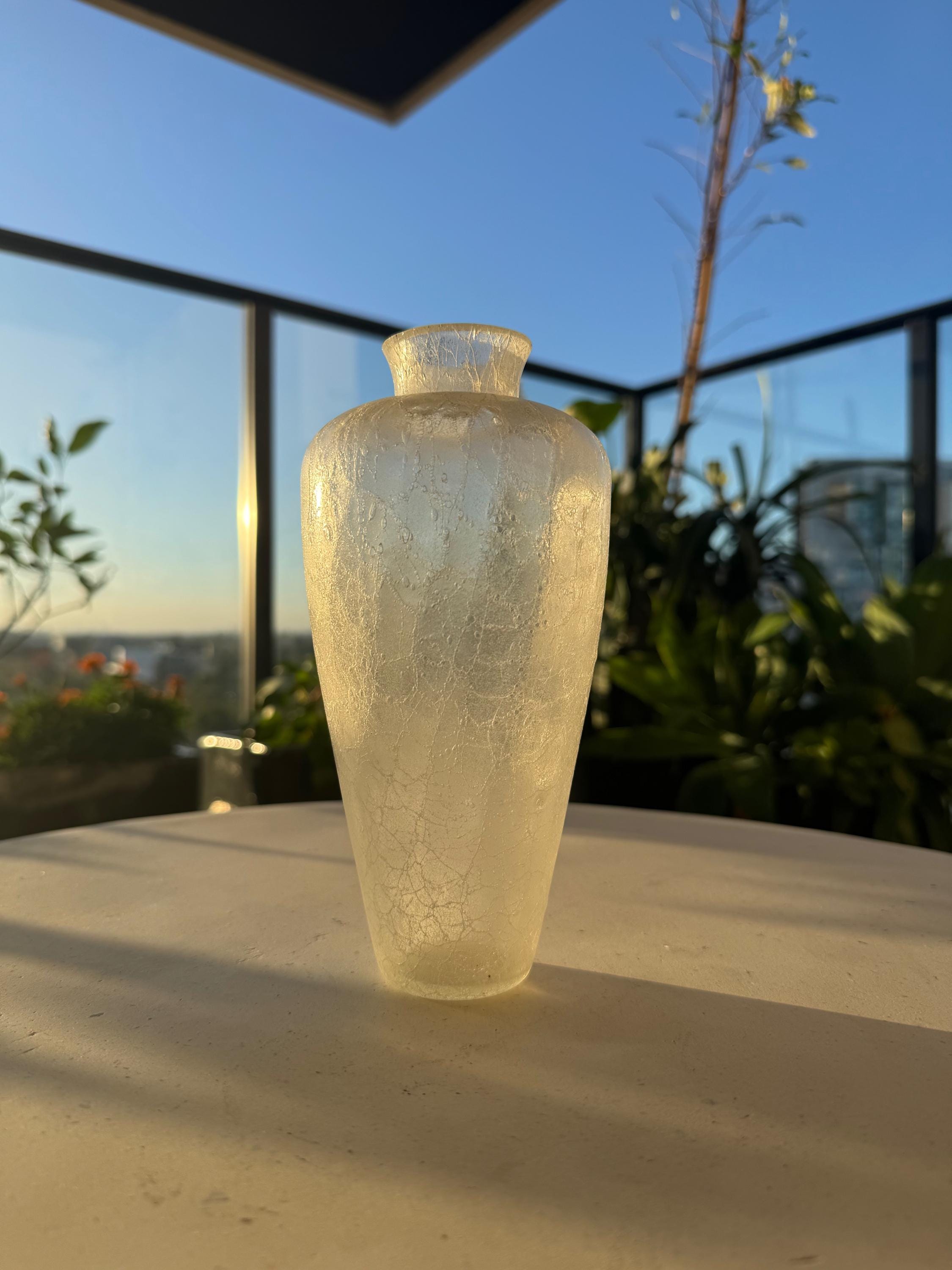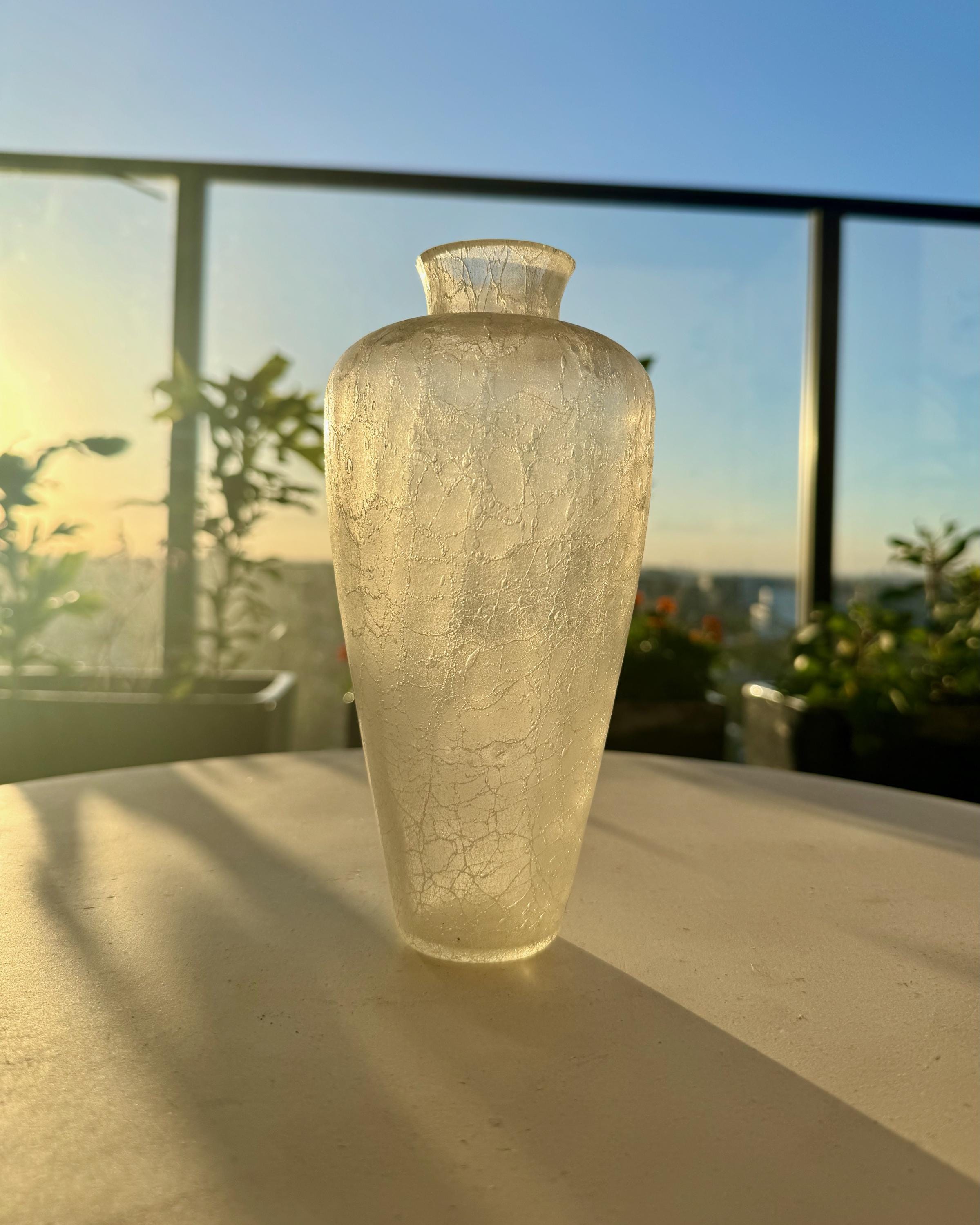 A tall frosted crackle-glass vase with a soft ice-etched surface and a tapered form. The subtle translucency gives it a warm glow in sunlight, while the textured finish adds depth and character. Beautiful as a standalone sculptural piece or for displaying a minimal stem arrangement.