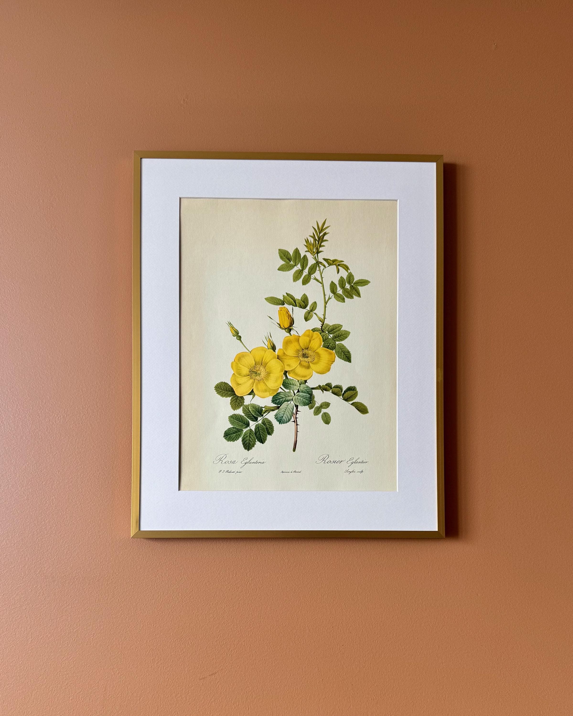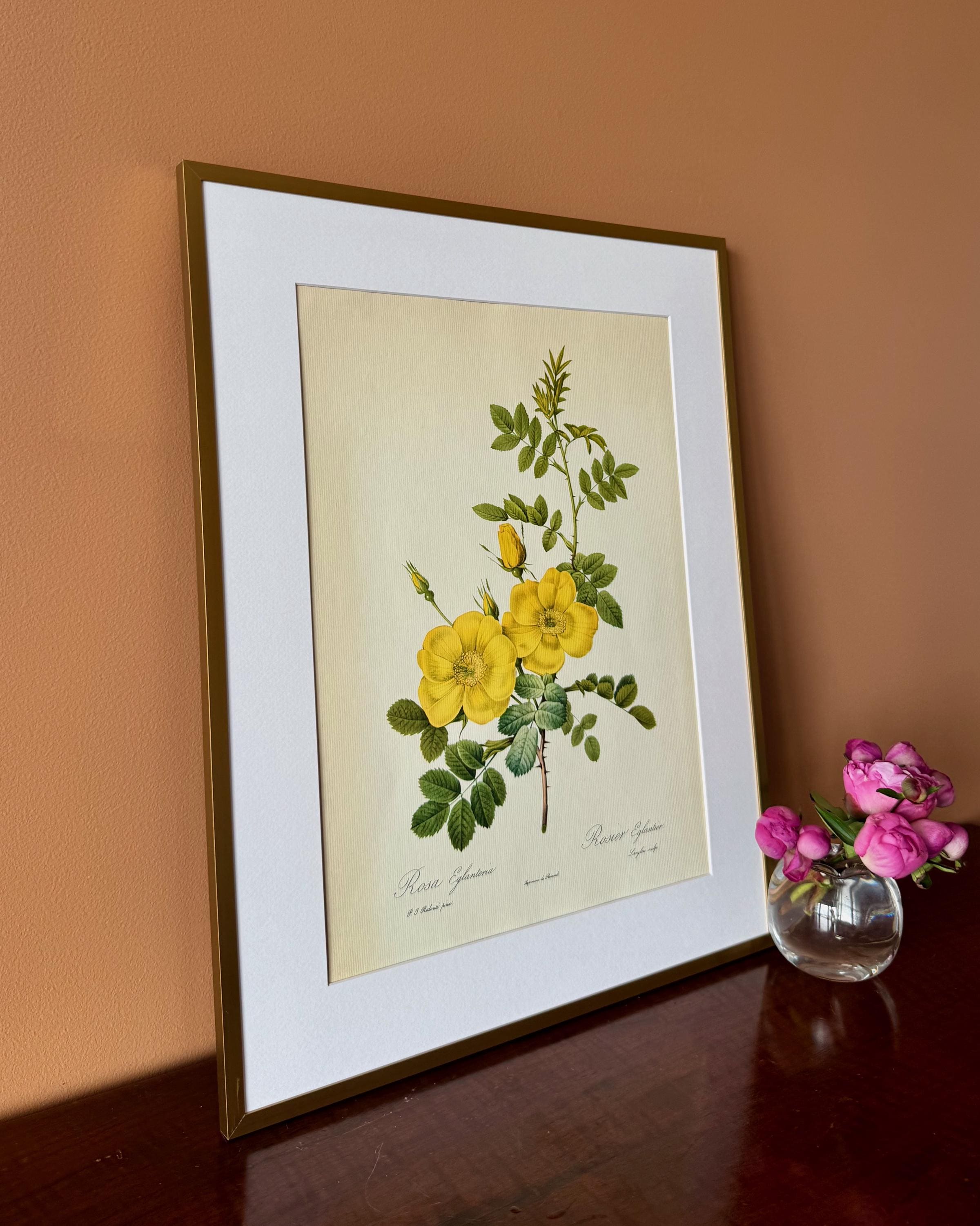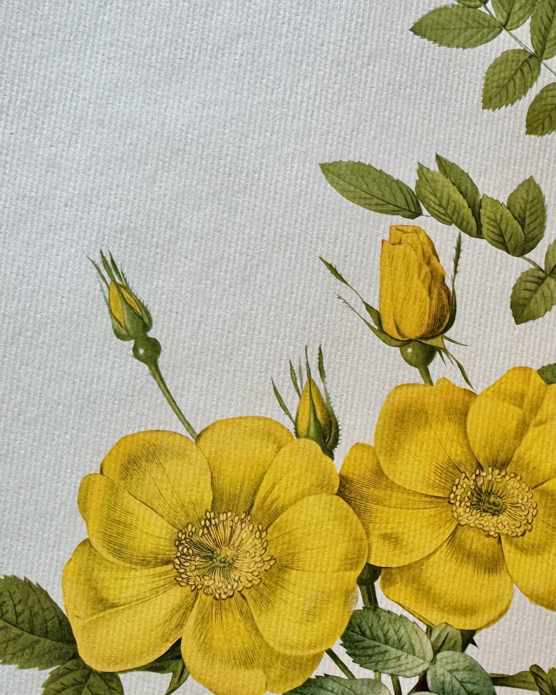 A vintage botanical rose print featuring Rosa eglanteria, illustrated with bright yellow blooms and fresh green foliage, captured with crisp detail and a light, open composition.