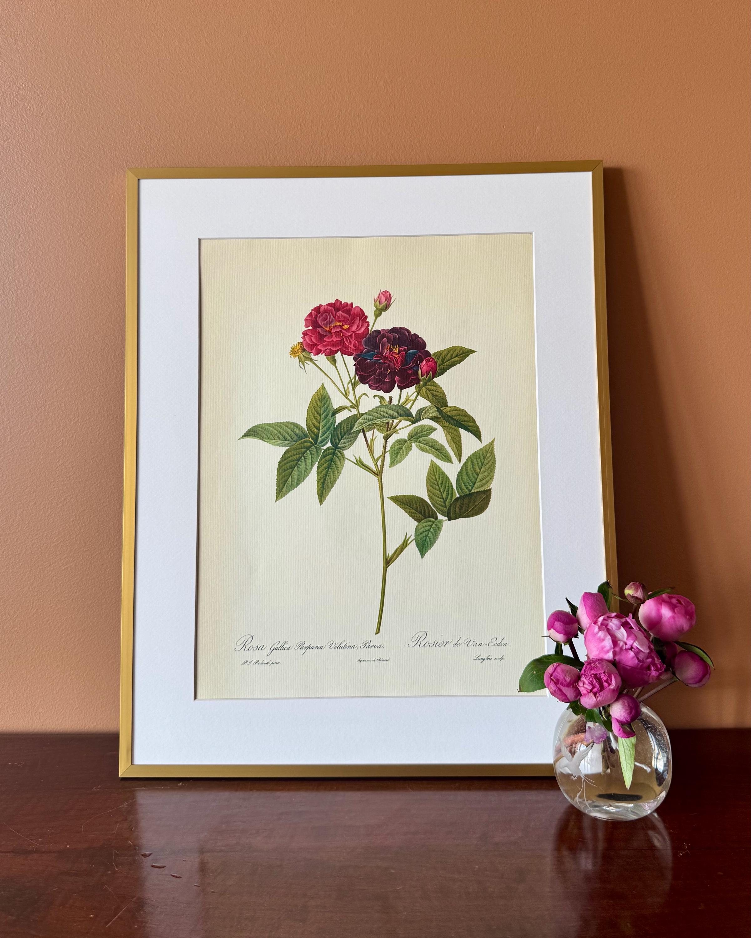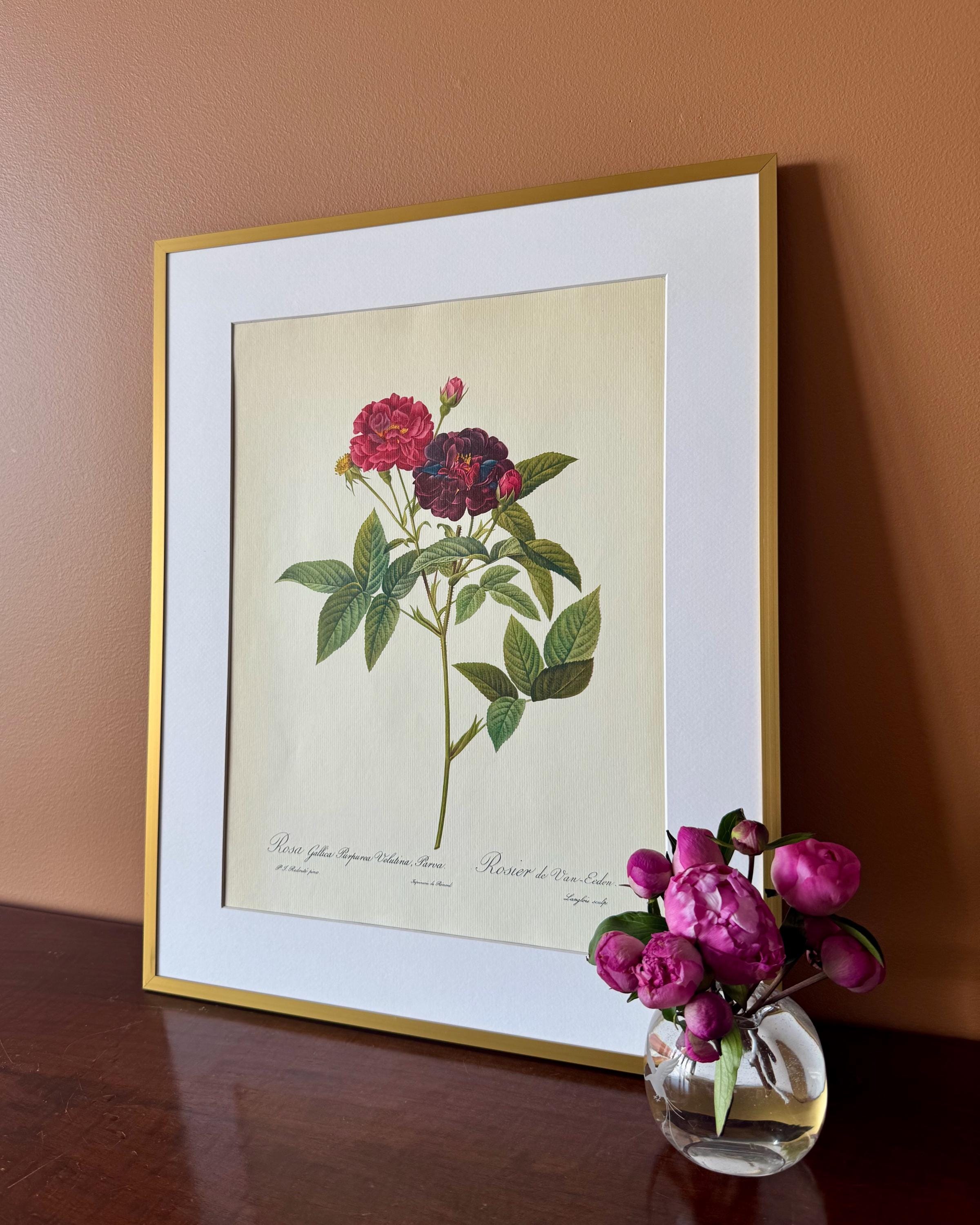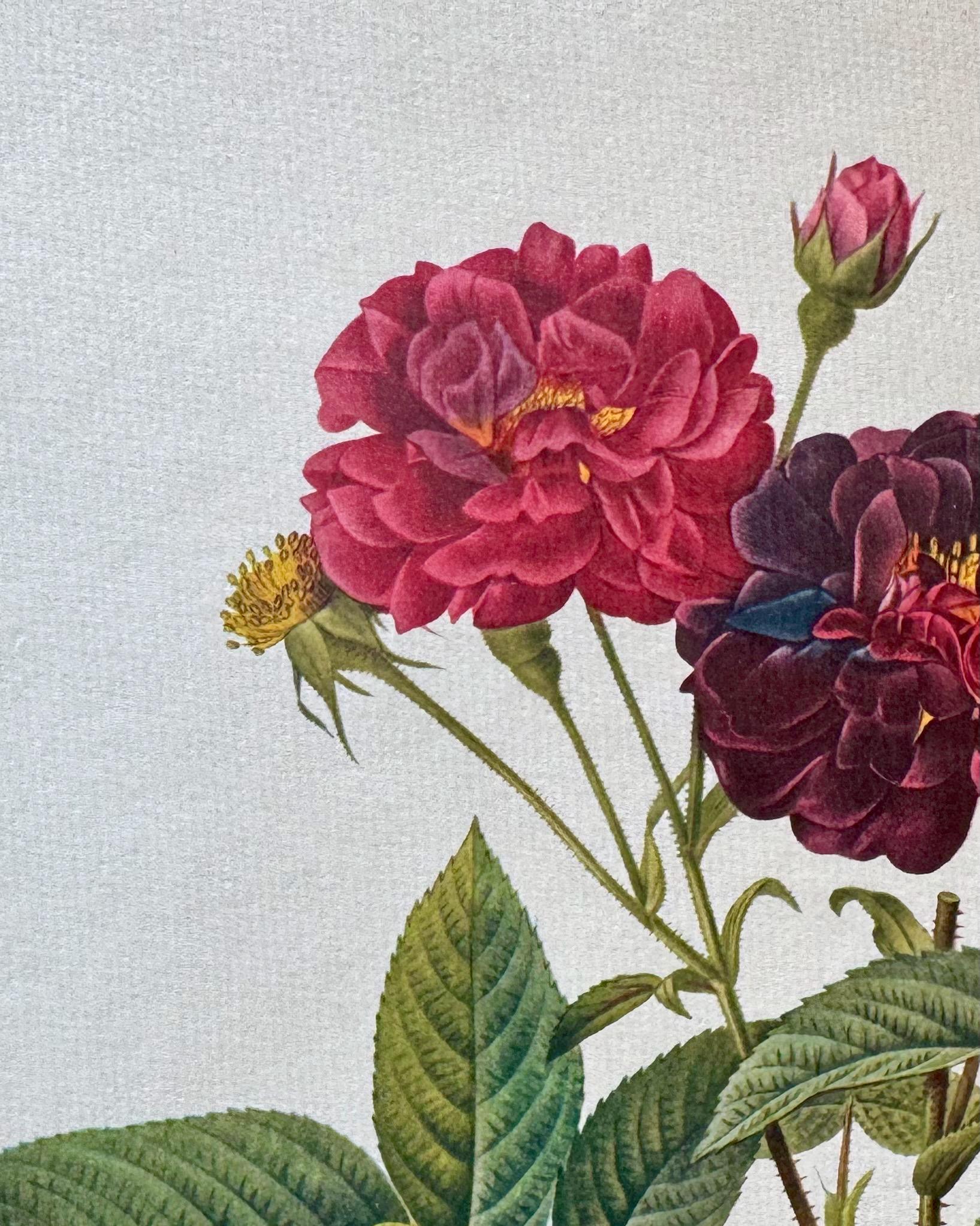 This striking illustration comes from a traditional botanical study and showcases the dramatic colour variation prized in historic gallica roses. The contrast between the two blossoms and the elegant vertical stem gives the composition a strong, painterly presence, making it an excellent statement piece within a classic interior or gallery wall arrangement.