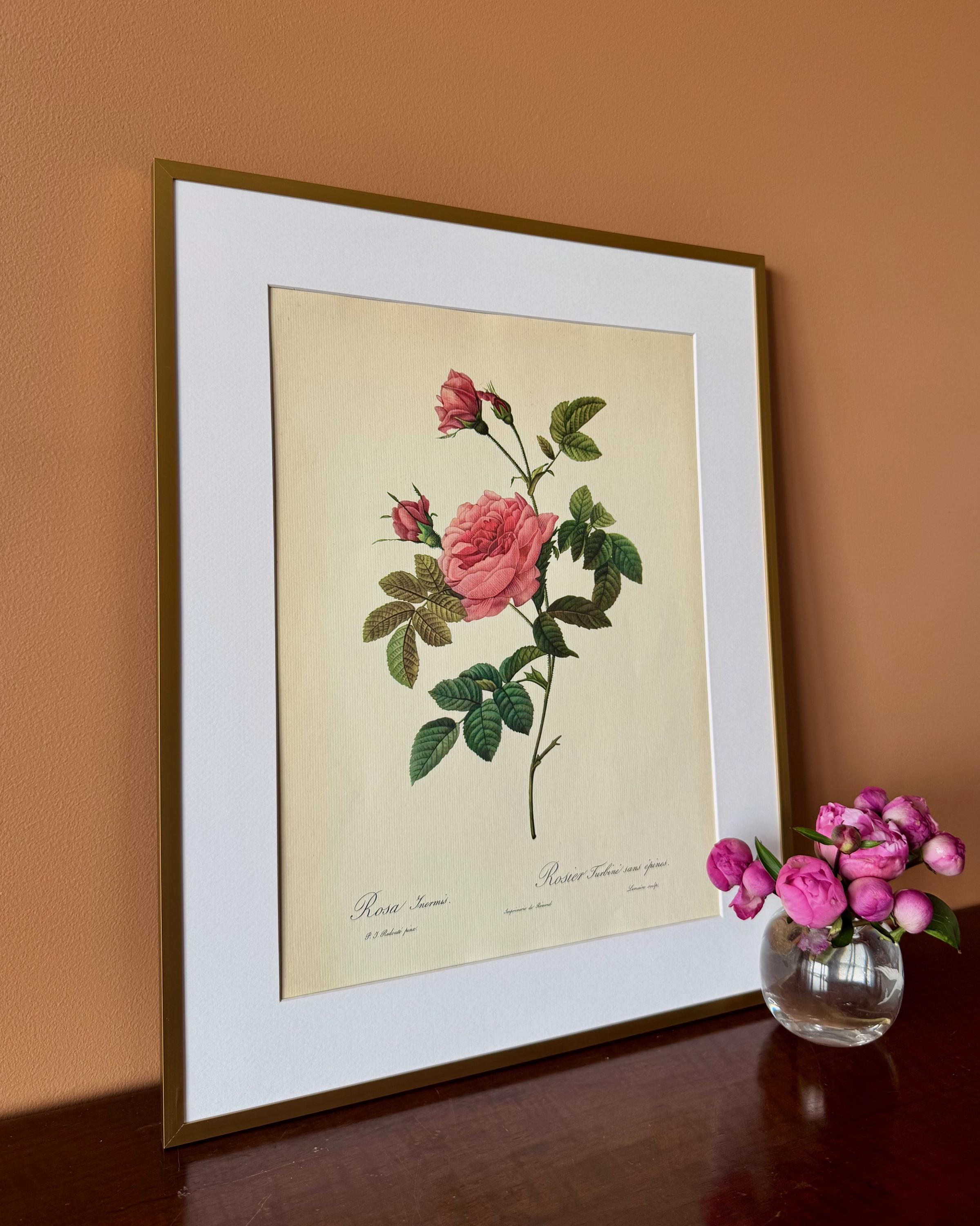 A vintage botanical rose print featuring Rosa turbinata, illustrated with a richly layered pink bloom, accompanying buds, and finely detailed foliage arranged along a slender, gently curved stem.