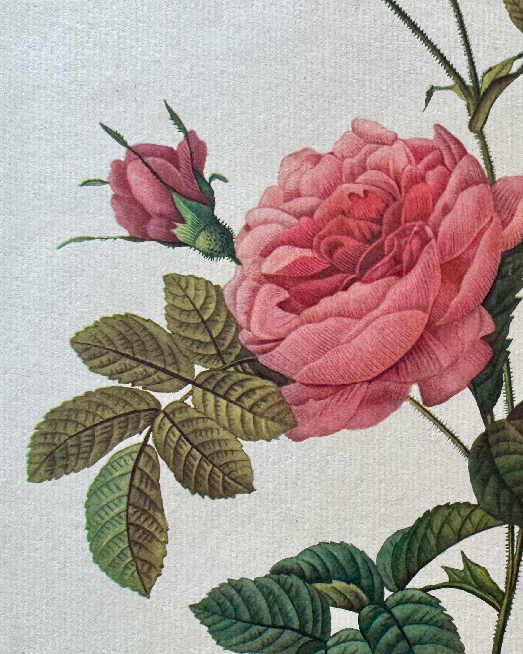 This illustration comes from a traditional botanical study and captures the sculptural quality and balance typical of early 20th-century rose illustration. The composition highlights the fullness of the central flower while allowing space around the stem and leaves, giving the piece a calm, elegant presence well suited to both classic and contemporary interiors.
