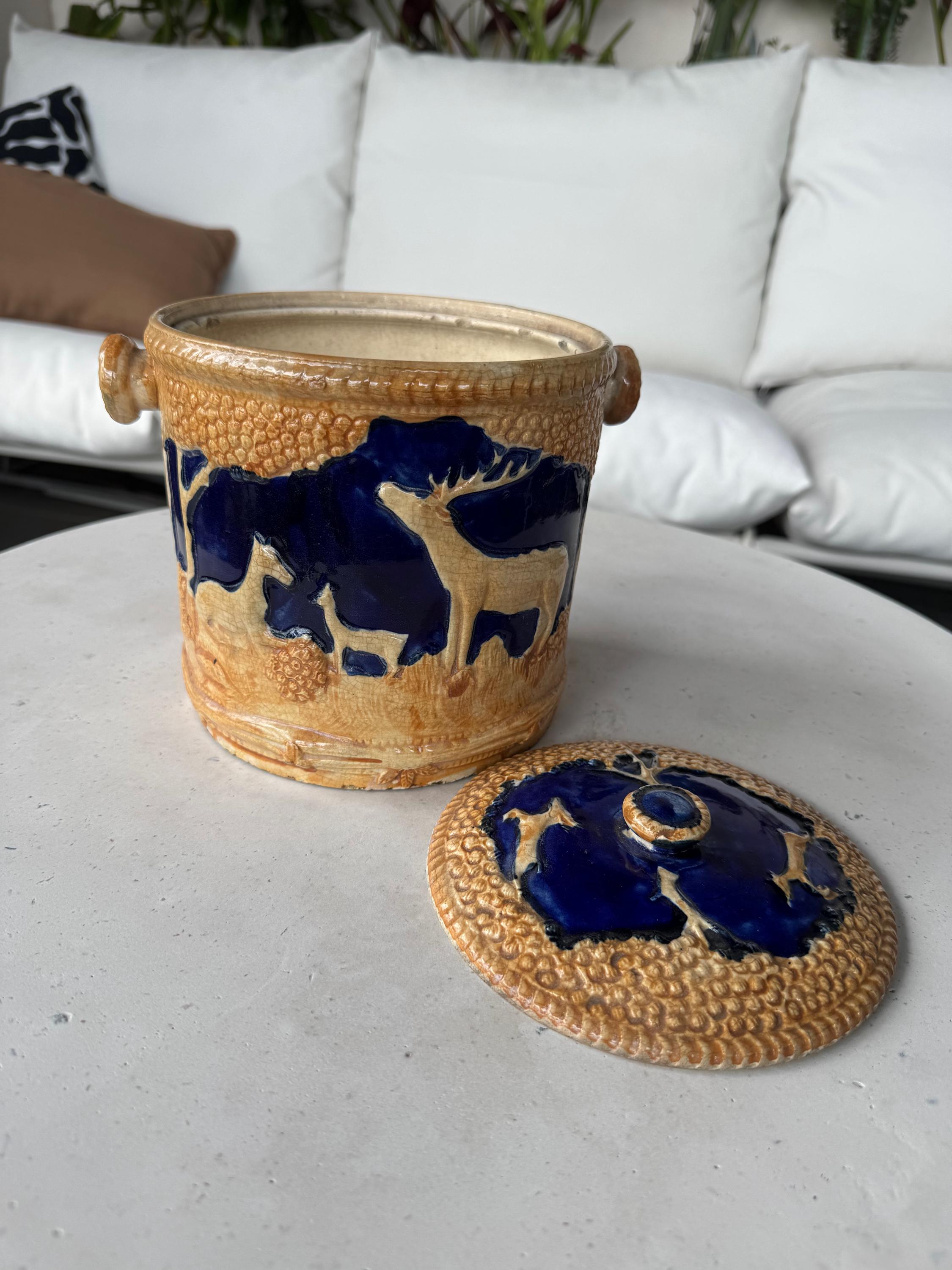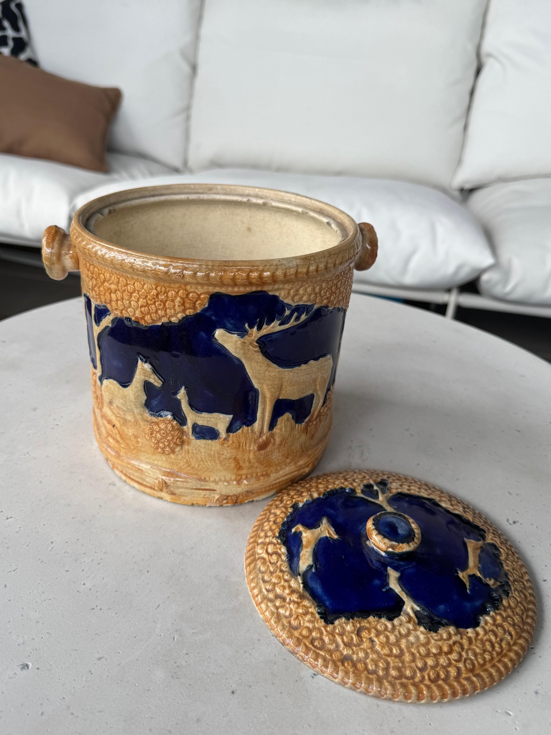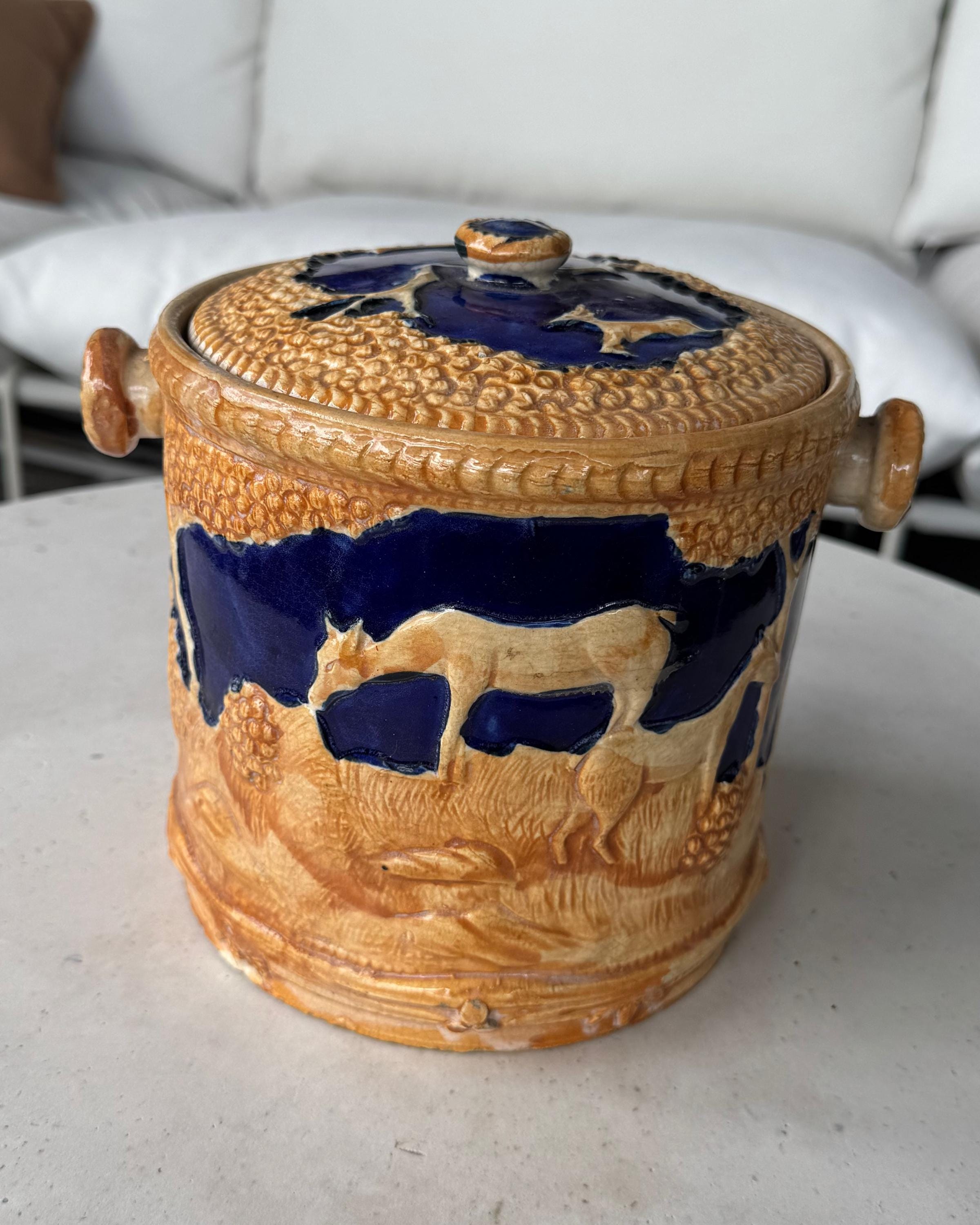 A beautifully detailed vintage biscuit barrel, hand painted and made in Japan, featuring raised relief scenes of deer in a wooded landscape. Finished in a rich cobalt blue against warm honey and tan tones, with a textured glaze and matching lid.