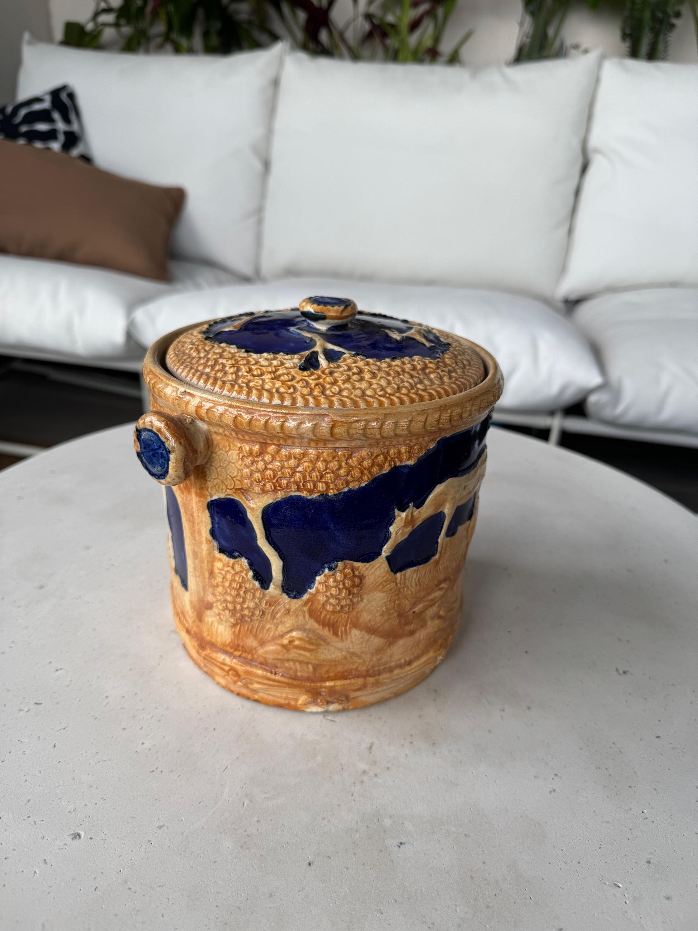 This is a substantial, sculptural piece with lovely weight and presence. The relief work wraps fully around the barrel, and the lid echoes the same motif, making it as decorative as it is functional. Ideal as a statement storage piece, kitchen display object, or standalone decorative vessel.