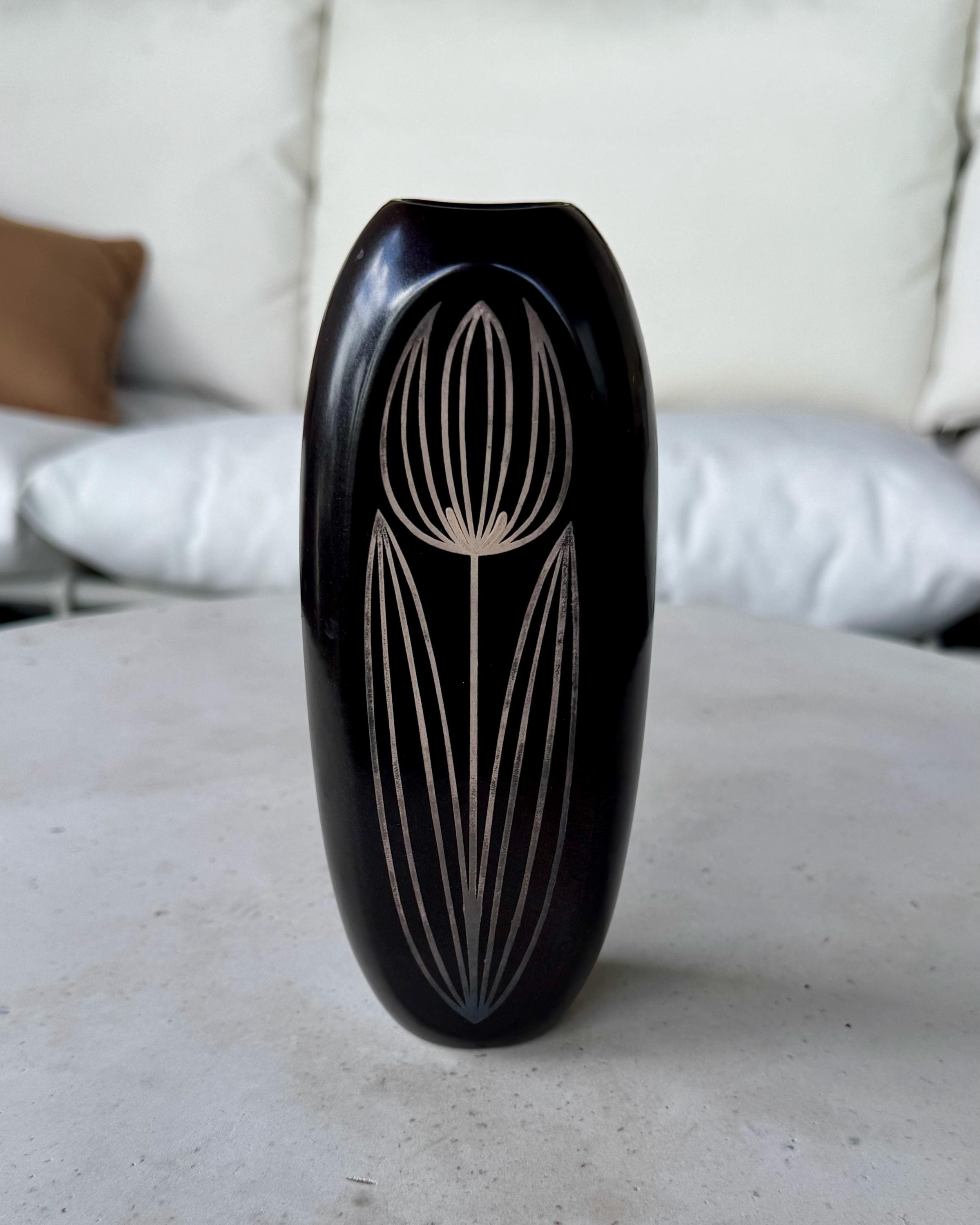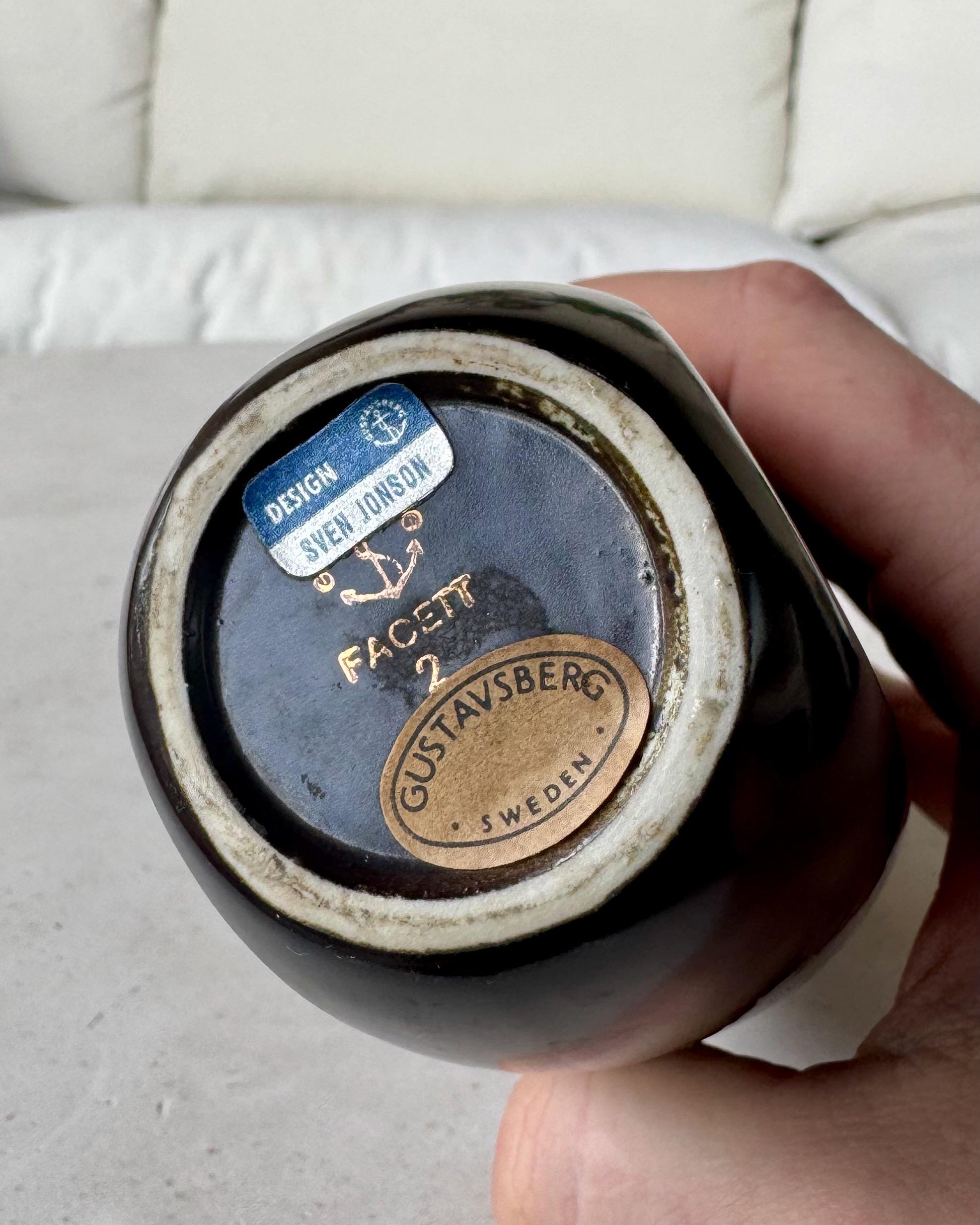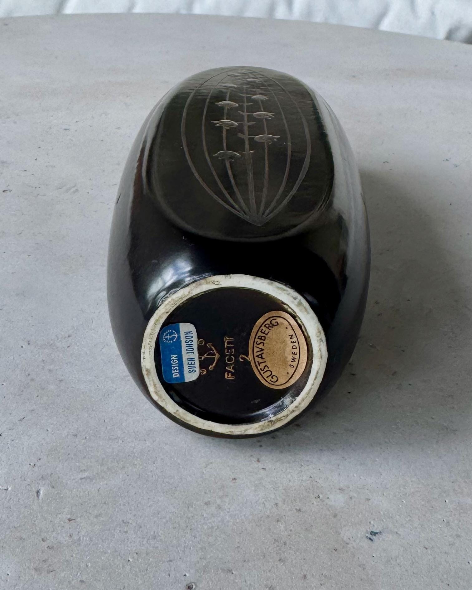 A striking mid-century Scandinavian vase designed by Sven Jonson for Gustavsberg, Sweden. From the Facett series, this sculptural form is finished in a deep black glaze with delicately incised linear and floral motifs, creating a subtle contrast and strong graphic presence.