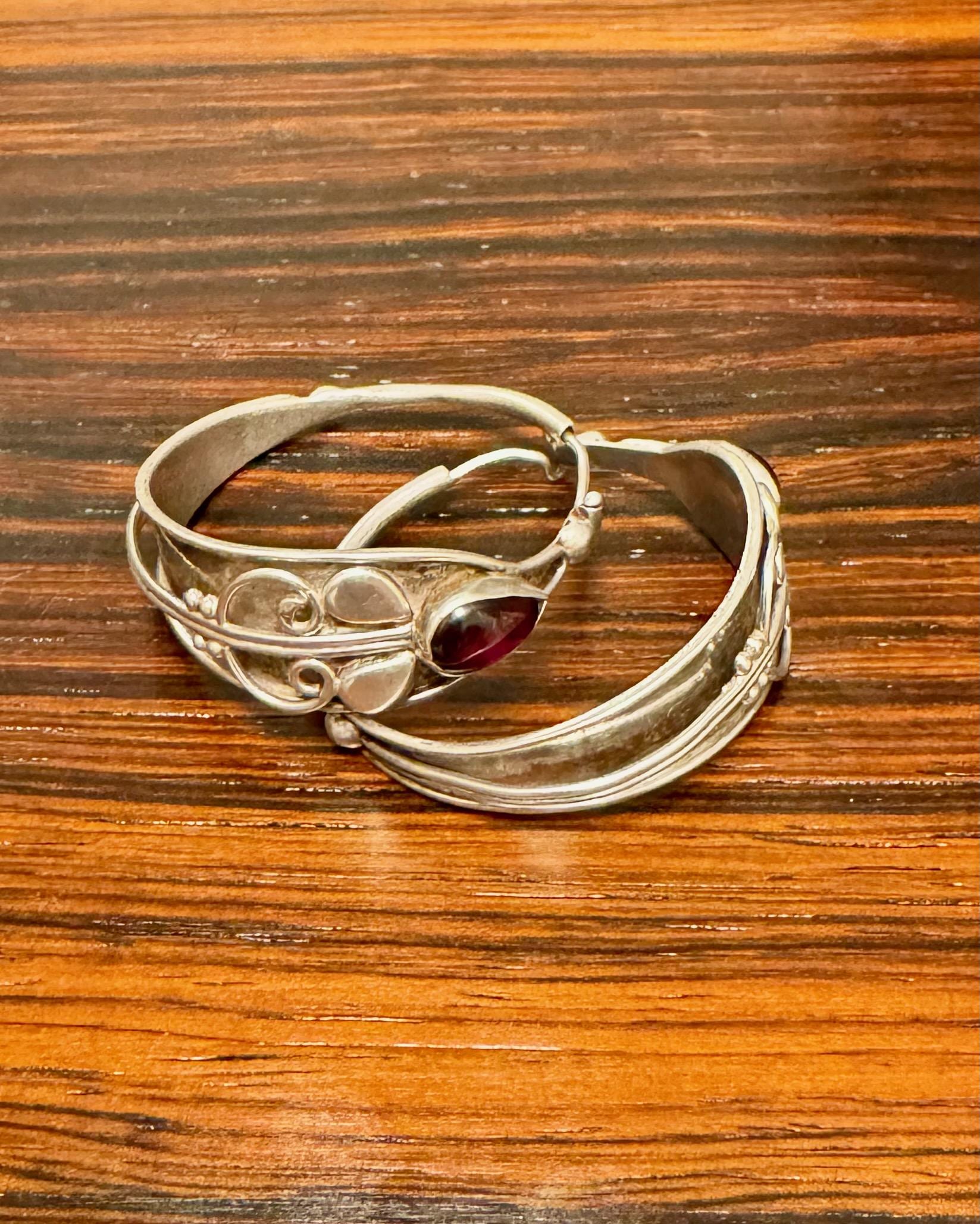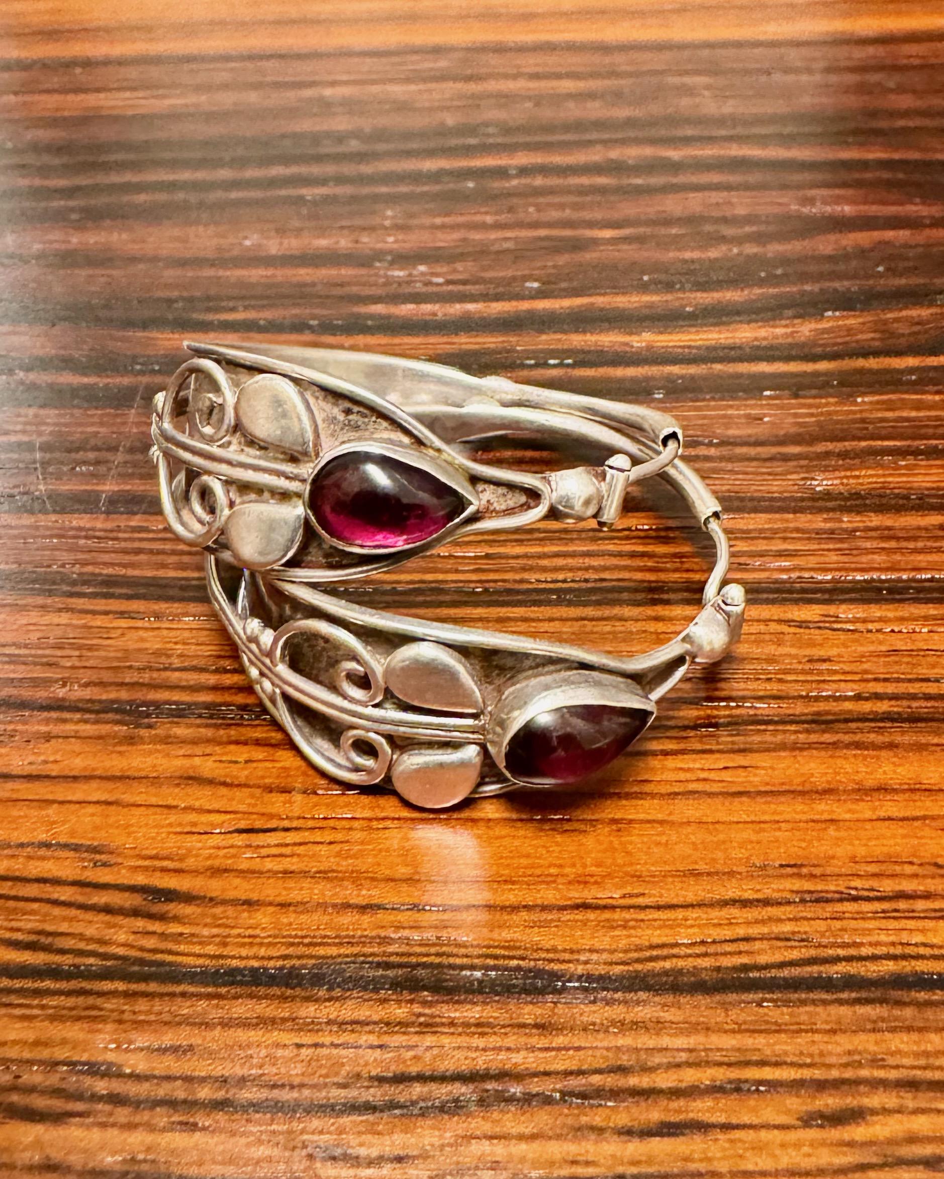 The garnets have a rich wine-red tone that catches the light beautifully, set into softly contoured silver bezels. The silver shows a gentle patina consistent with age, highlighting the hand-worked construction and adding character rather than wear.
