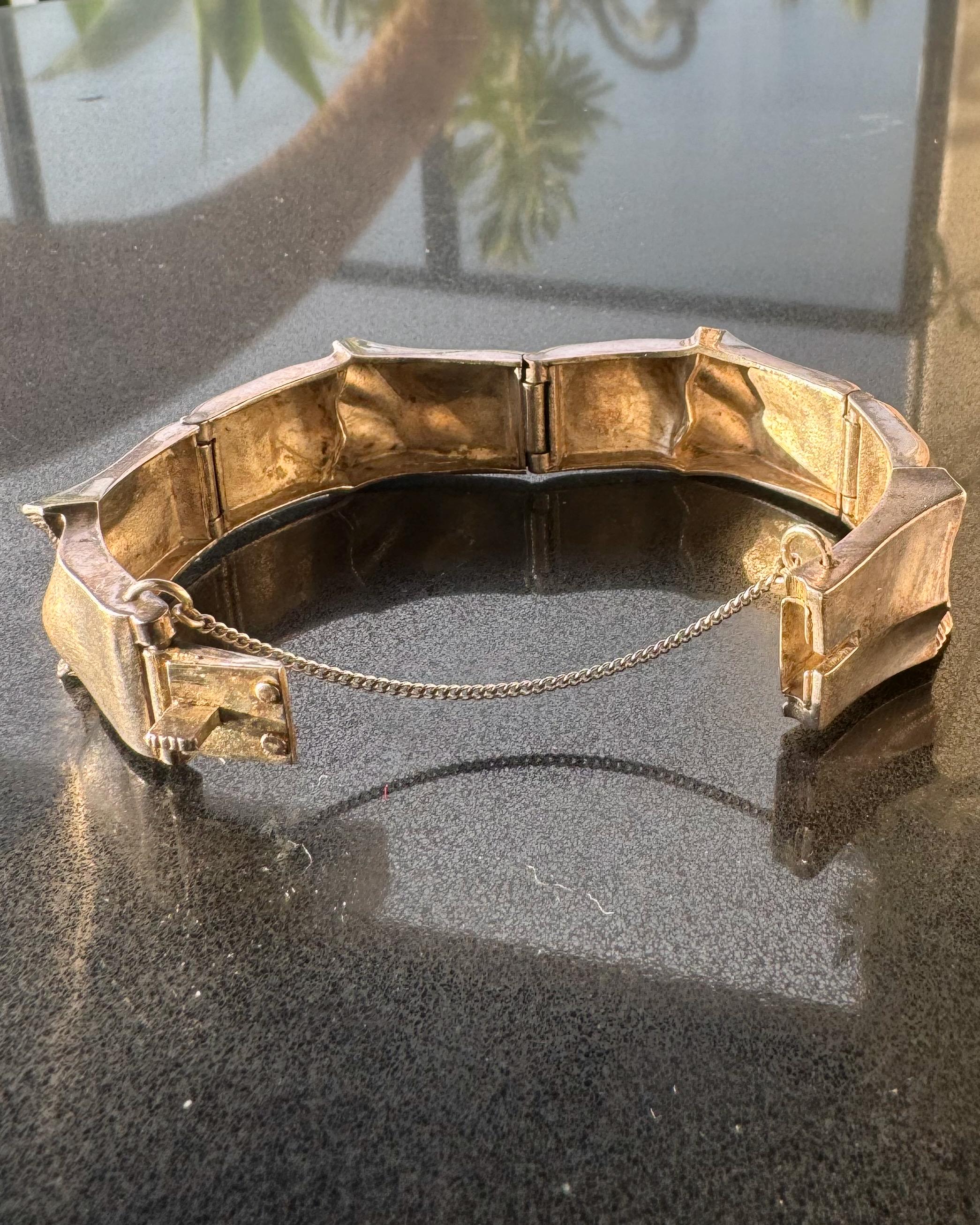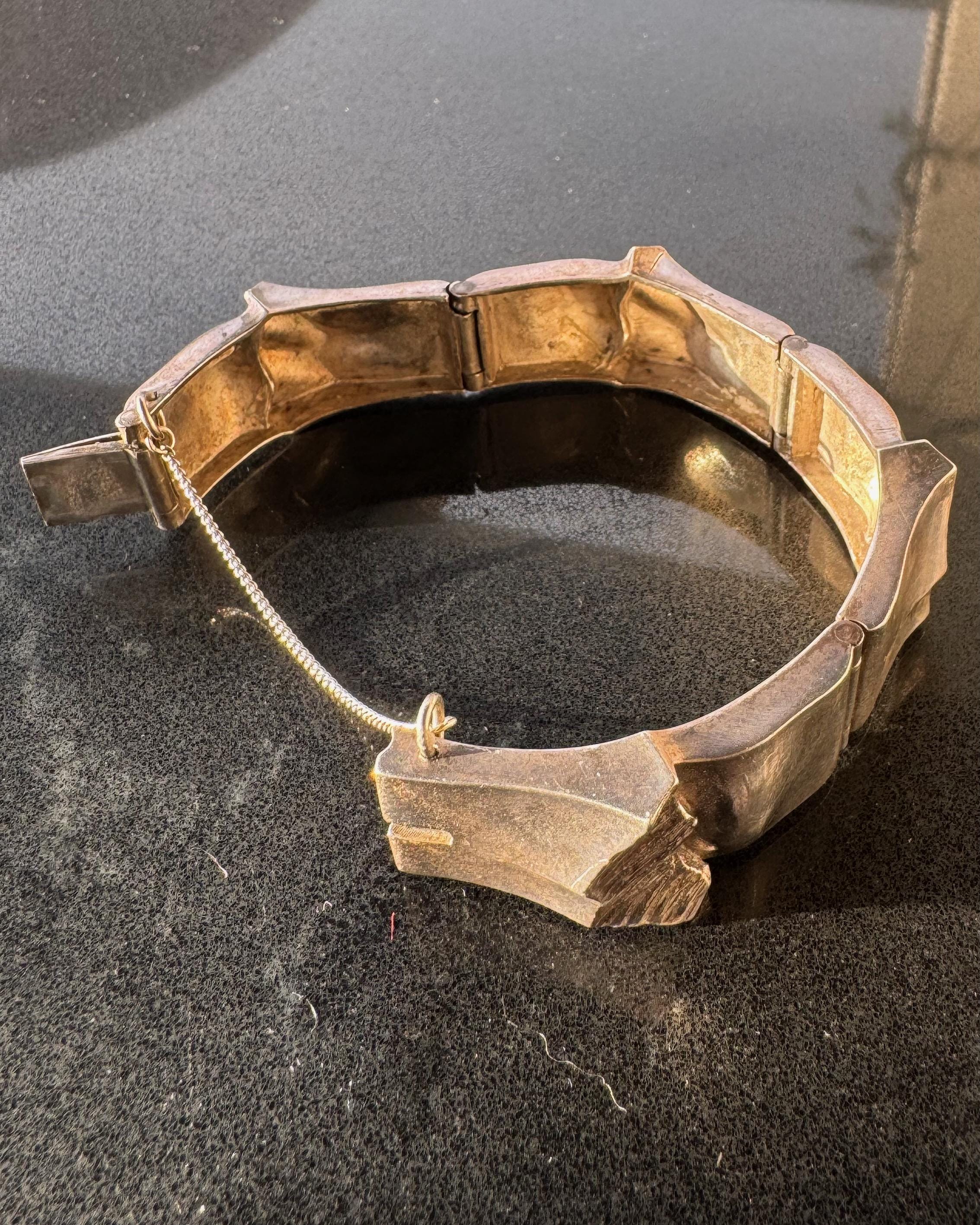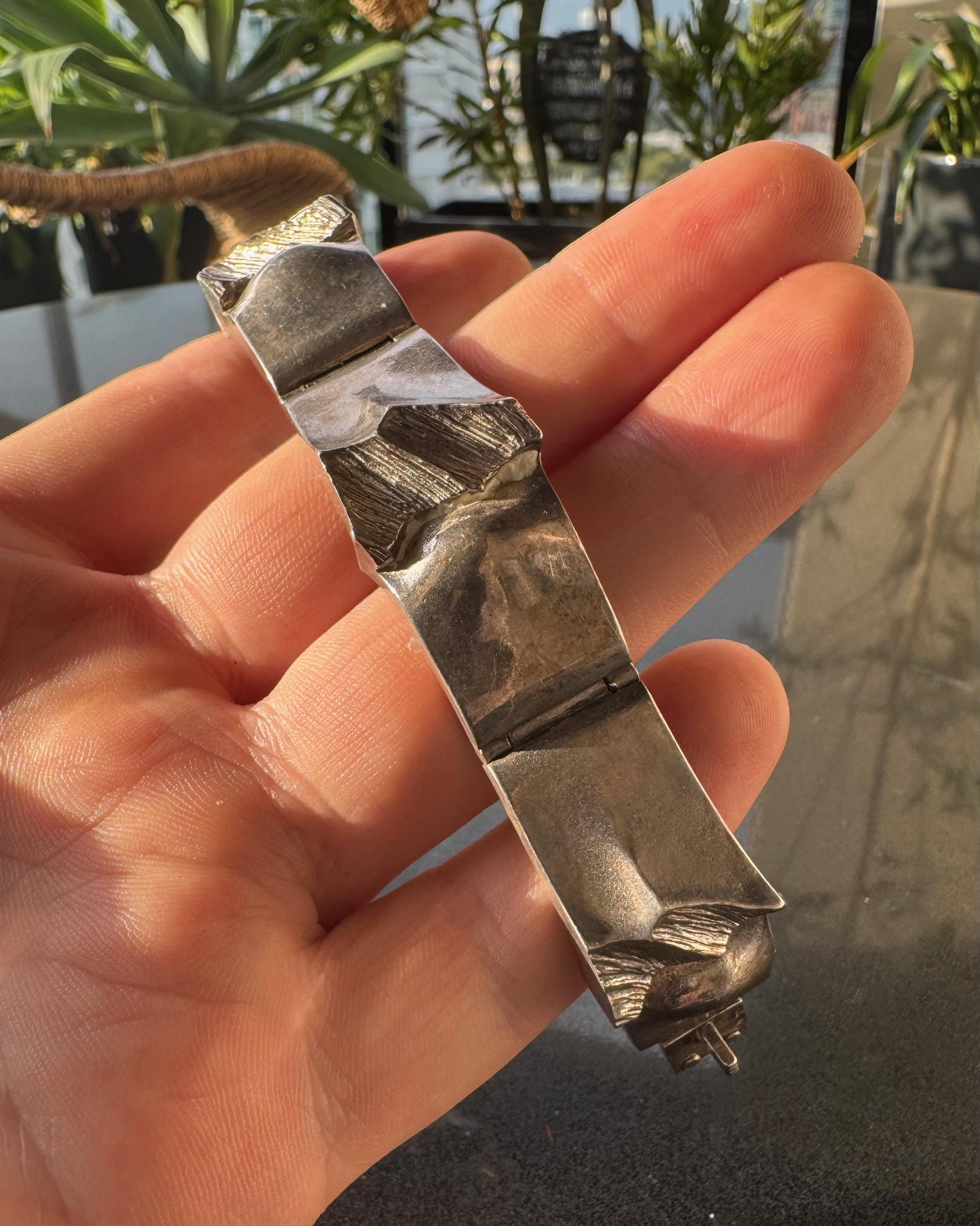 Substantial yet wearable, the bracelet curves comfortably around the wrist and secures with a concealed hinge and safety chain. The contrast between polished planes and rough, striated textures gives it strong visual presence without feeling overly heavy.