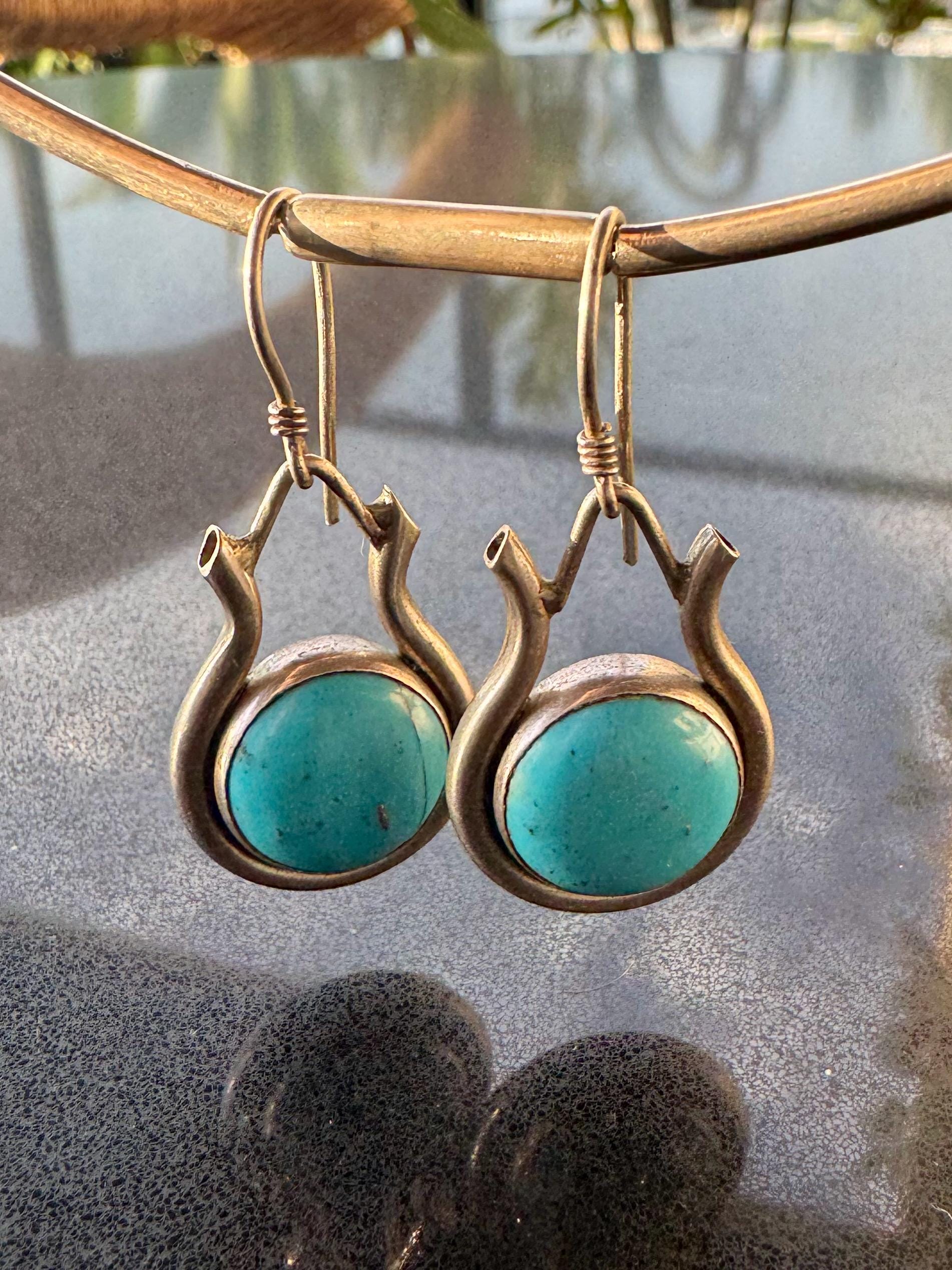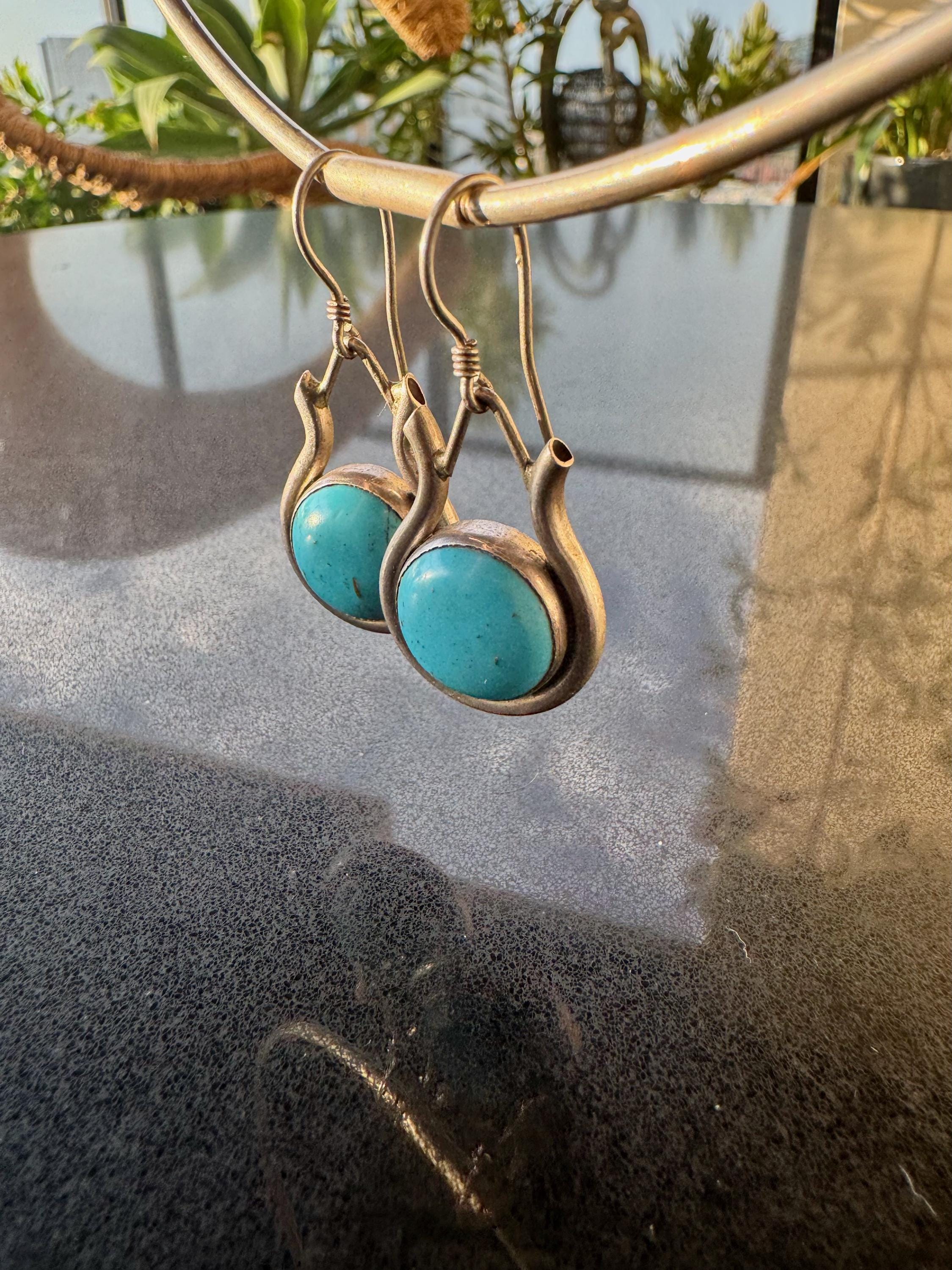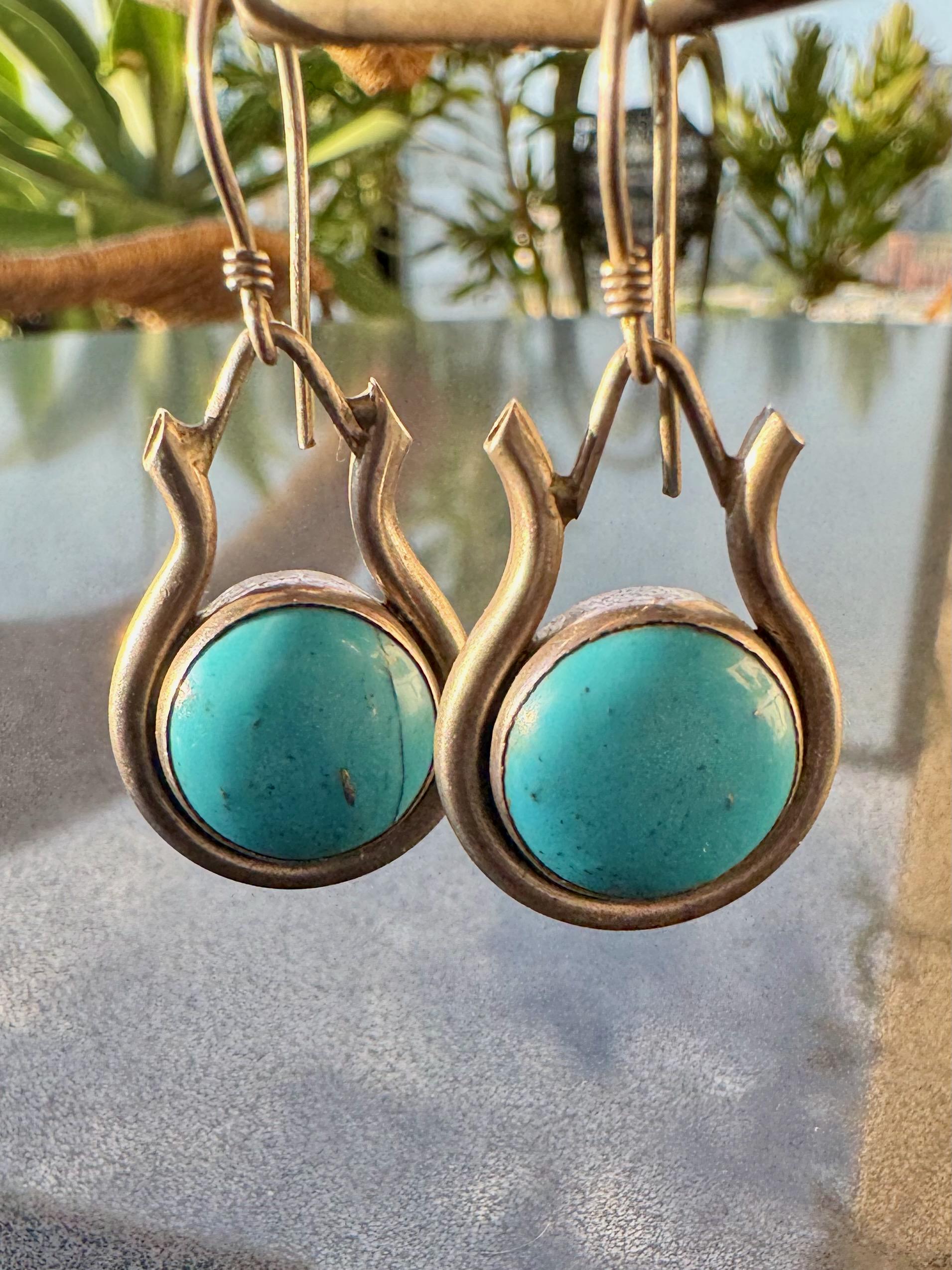 A beautiful pair of vintage silver drop earrings featuring round turquoise cabochons set within sculptural organic silver frames.