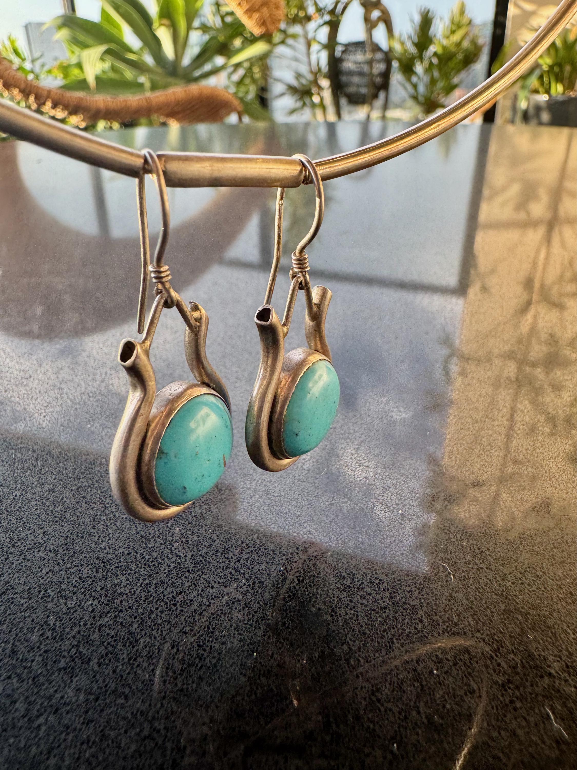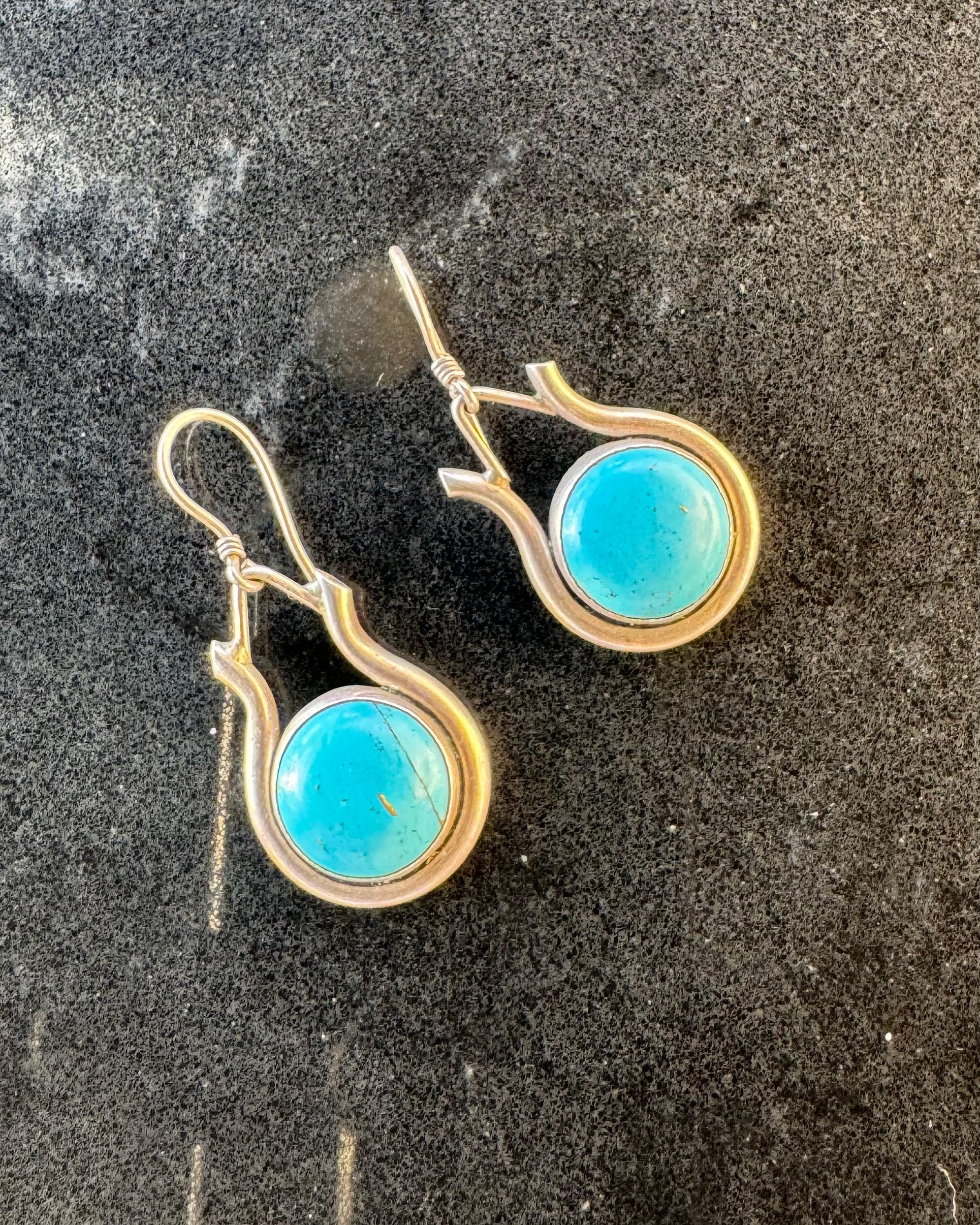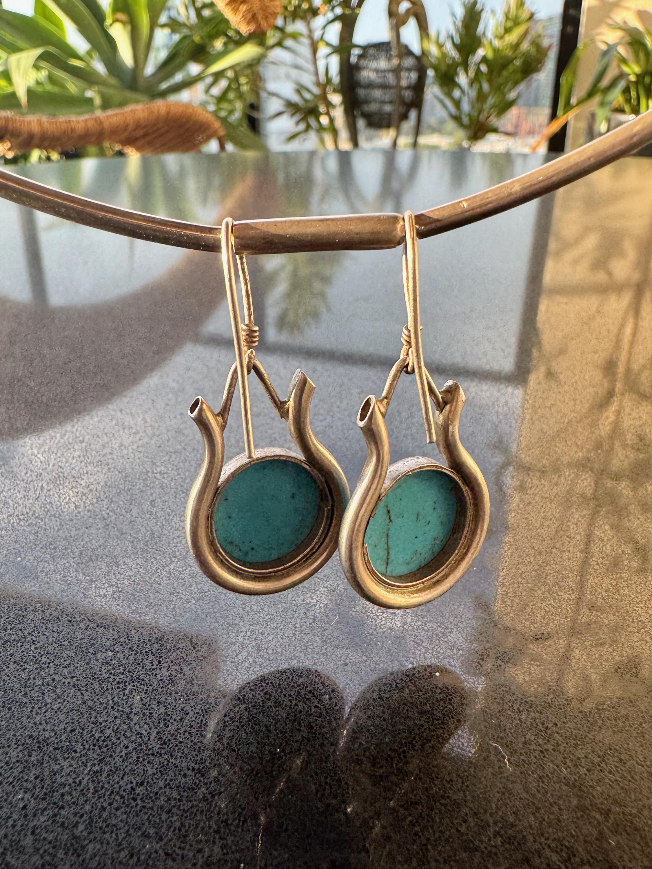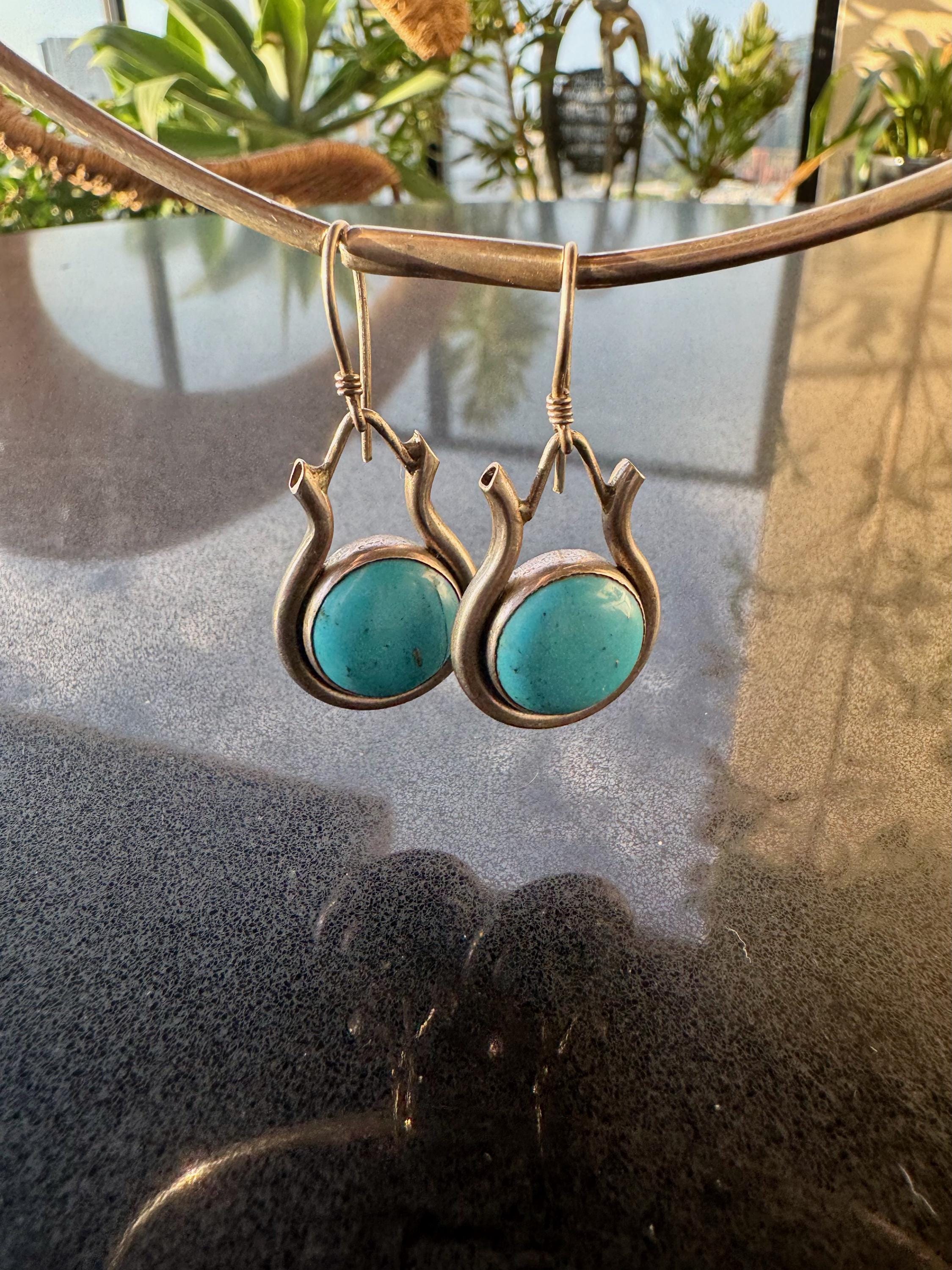A beautiful pair of vintage silver drop earrings featuring round turquoise cabochons set within sculptural organic silver frames.