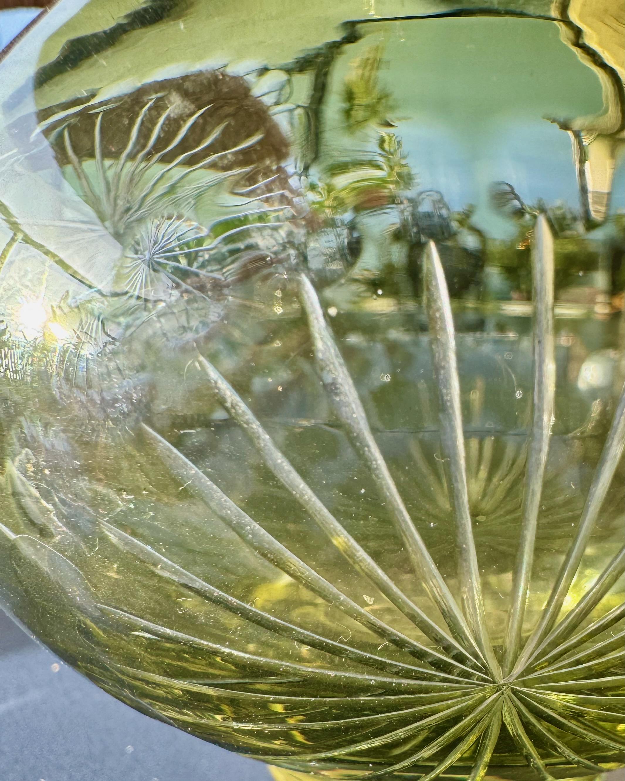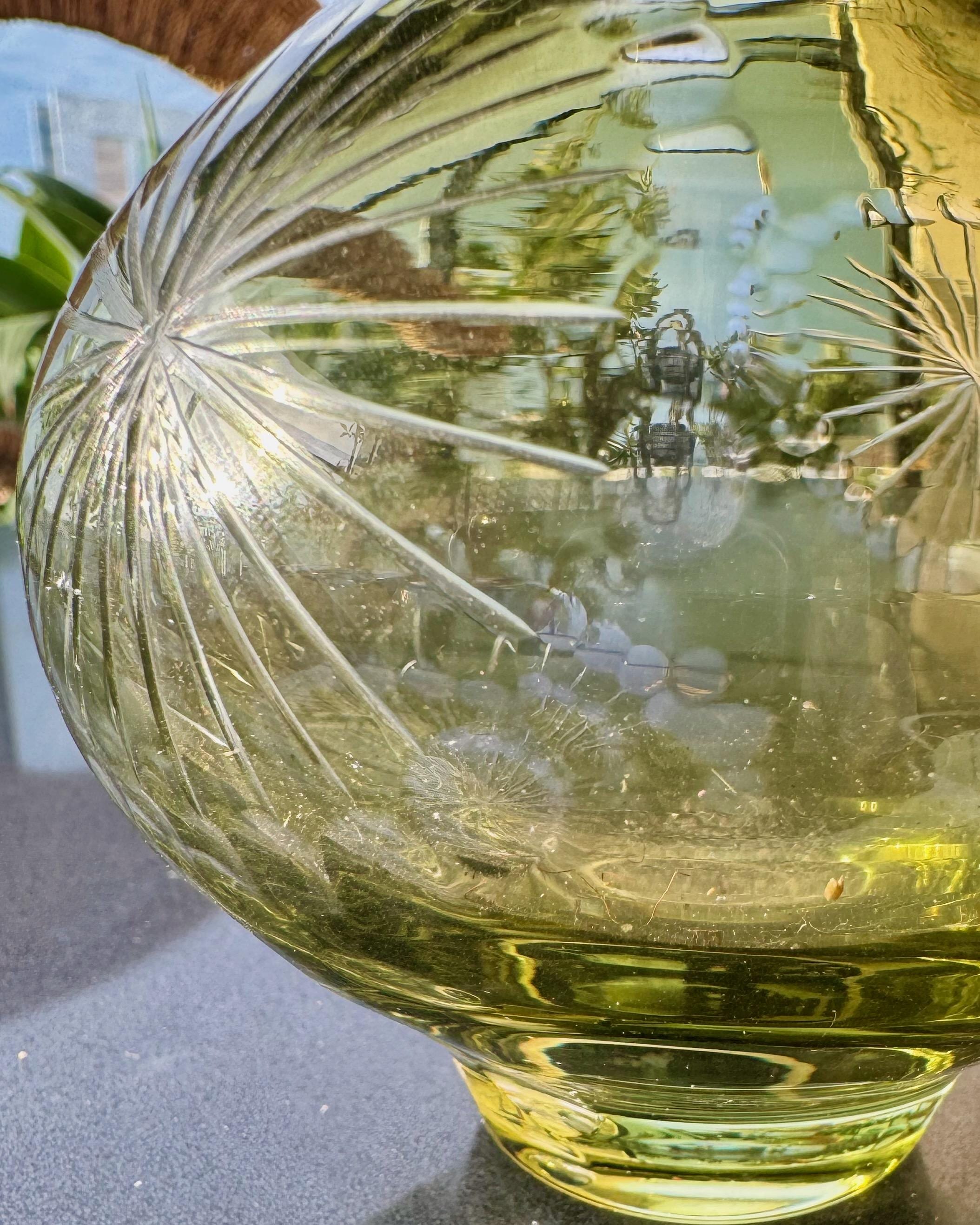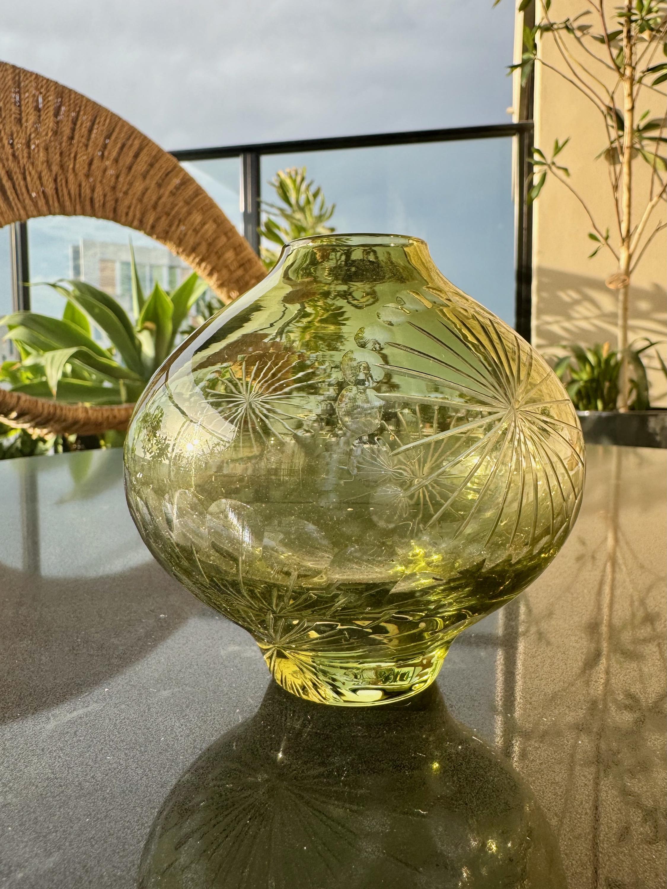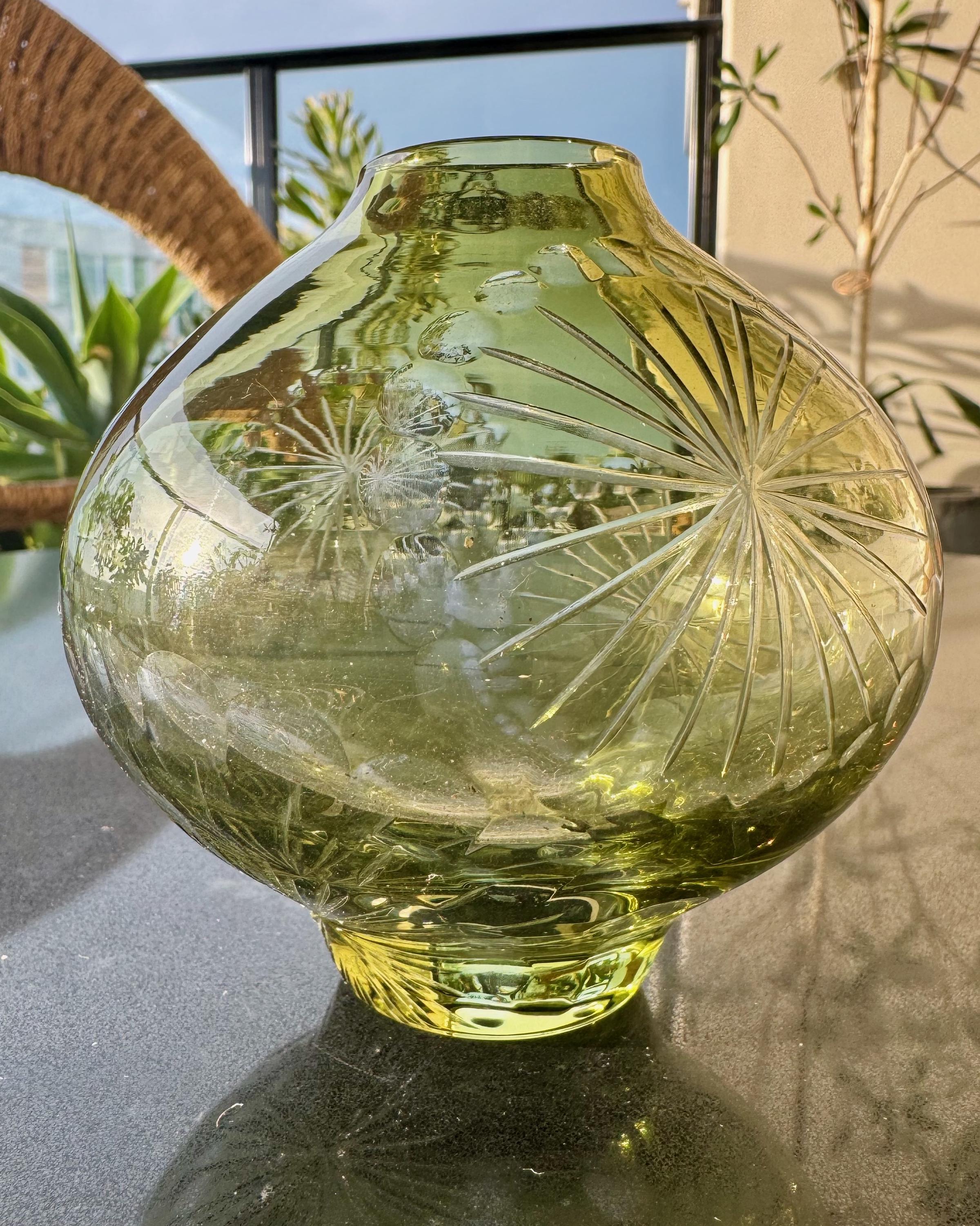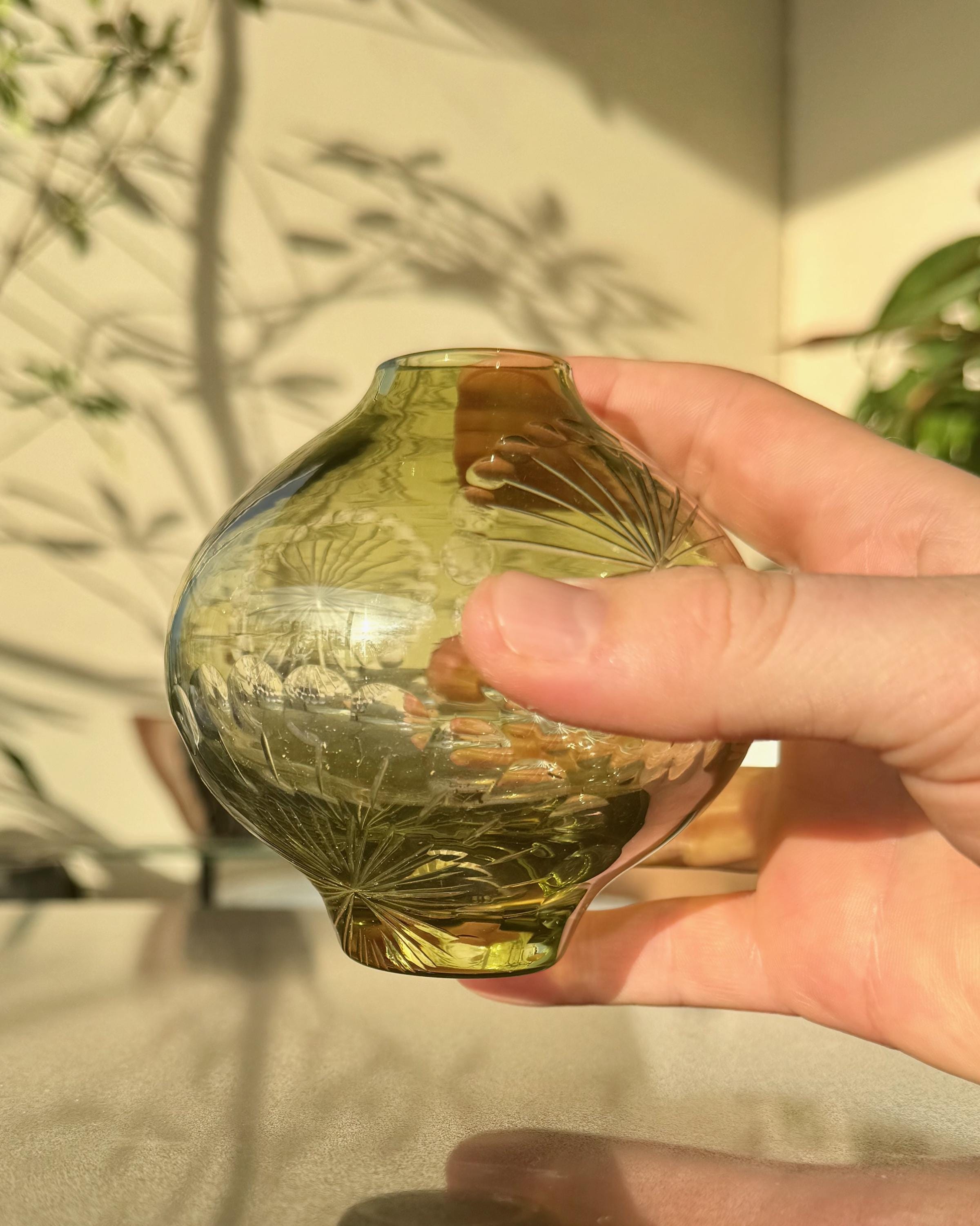 This piece features radial sunburst motifs around the body with a softly rounded silhouette and narrow opening, perfect for a single stem or small arrangement. The olive tone catches light beautifully and gives a warm mid century inspired feel while remaining contemporary.