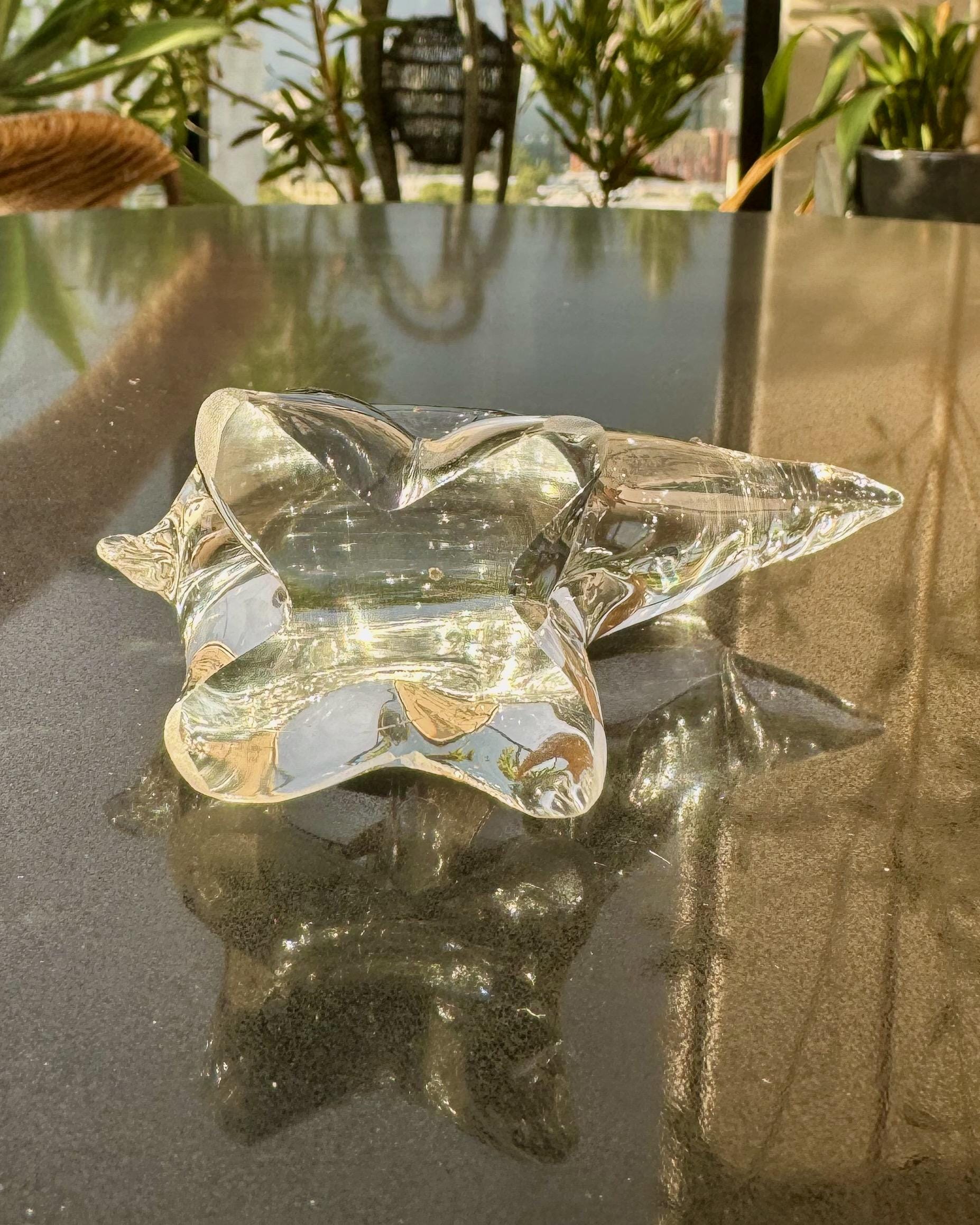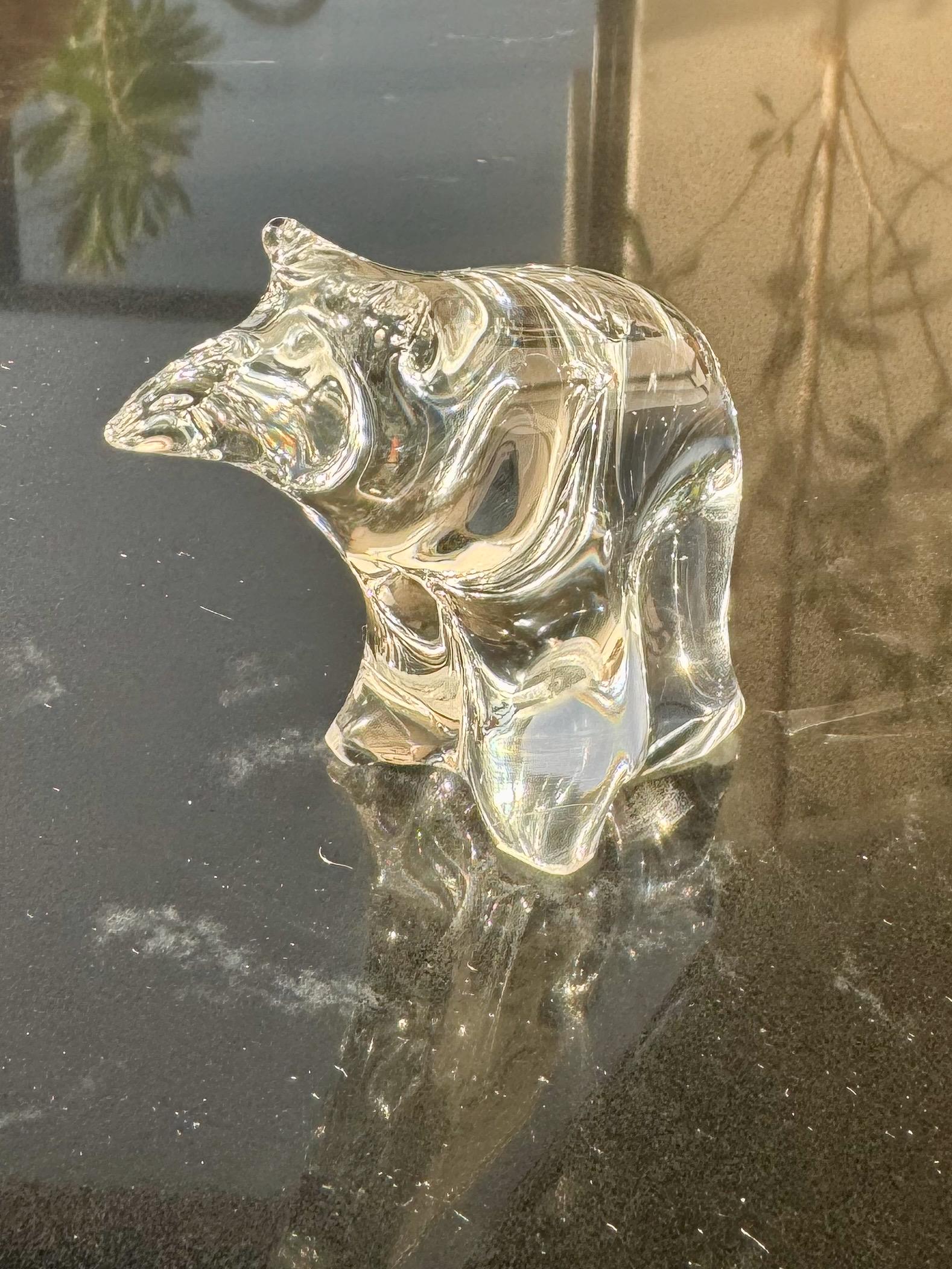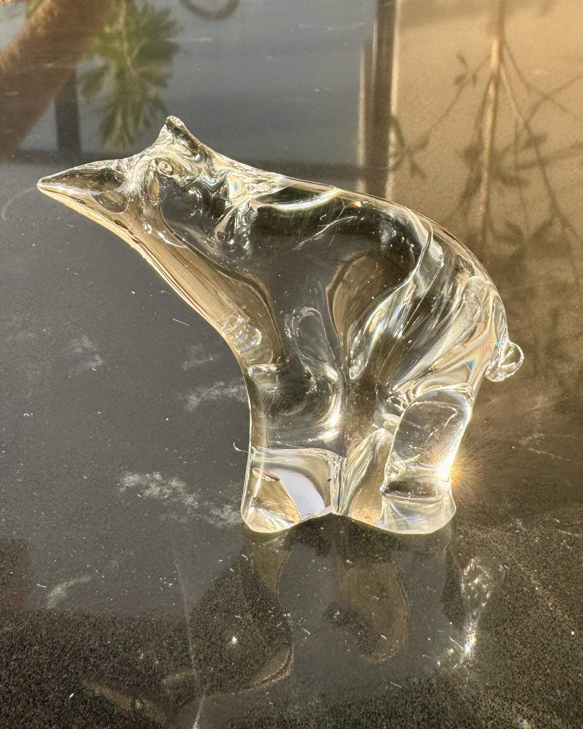 This solid glass piece captures the quiet strength of a standing bear through clean lines and subtle curvature. The thick clear glass catches and refracts light beautifully, creating soft reflections and prism effects depending on placement.