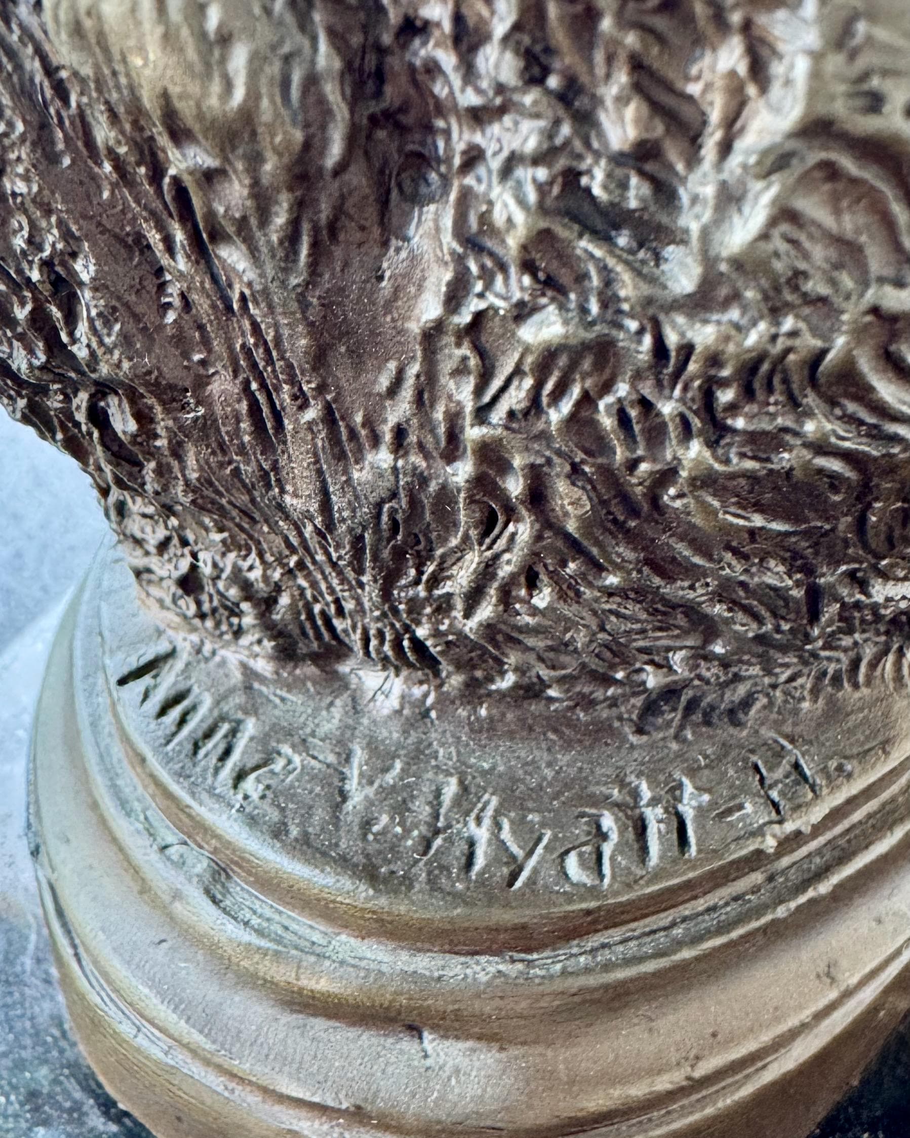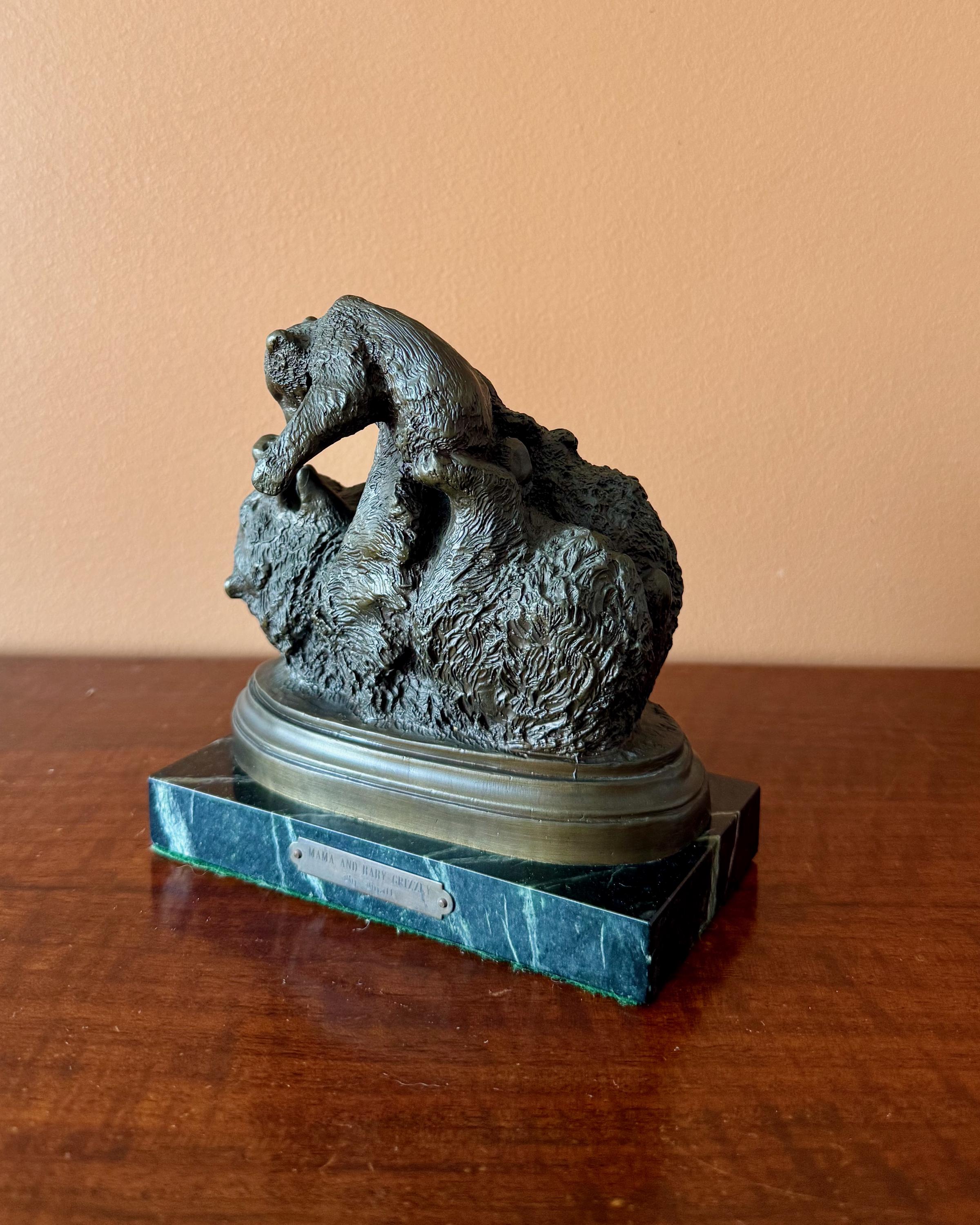 The bronze bears an incised signature “Anna V. Hyatt-H.” to the oval terrace and is mounted on a green marble base with artist plaque reading “Mama and Baby Grizzly by Hyatt.”