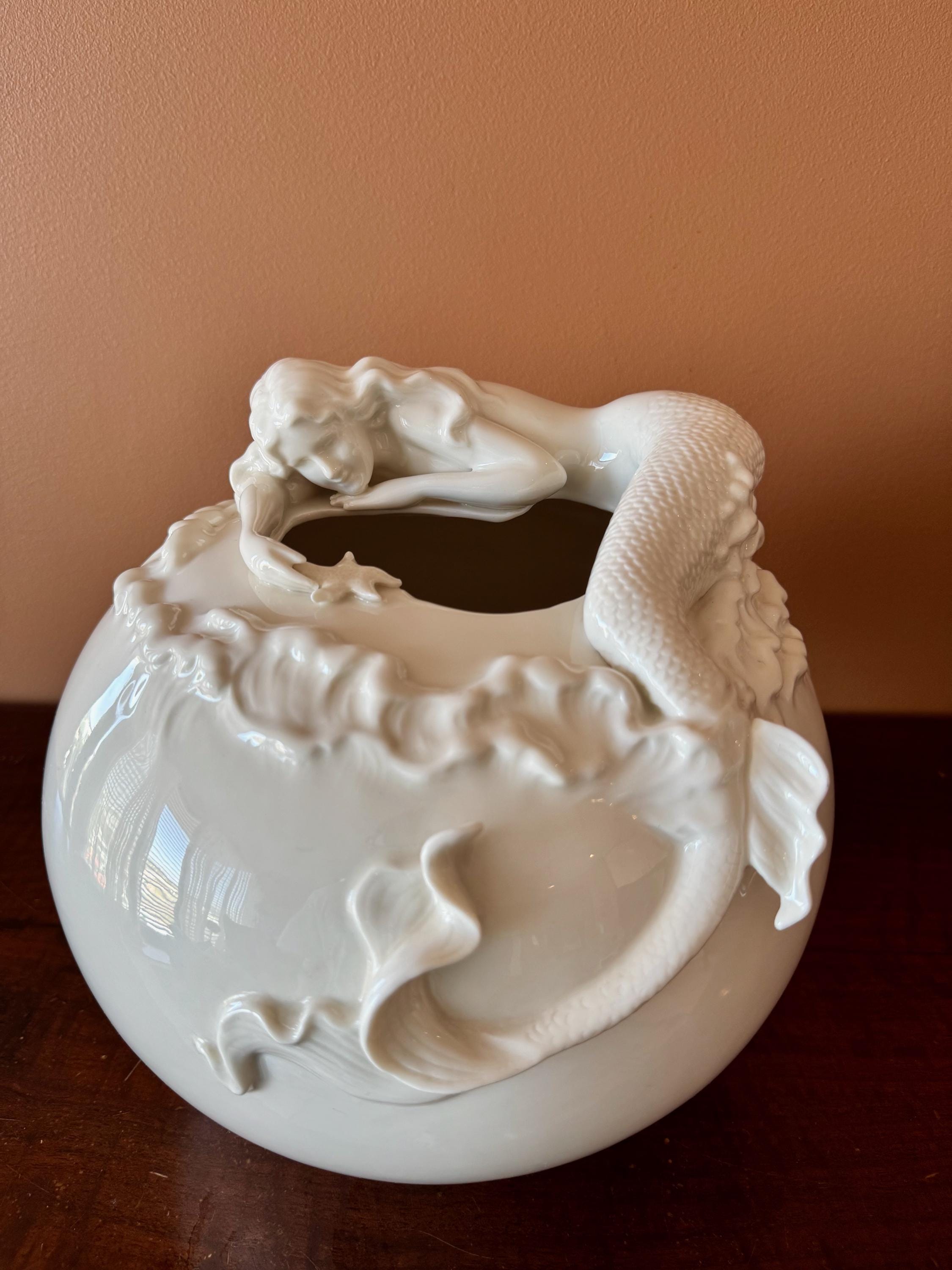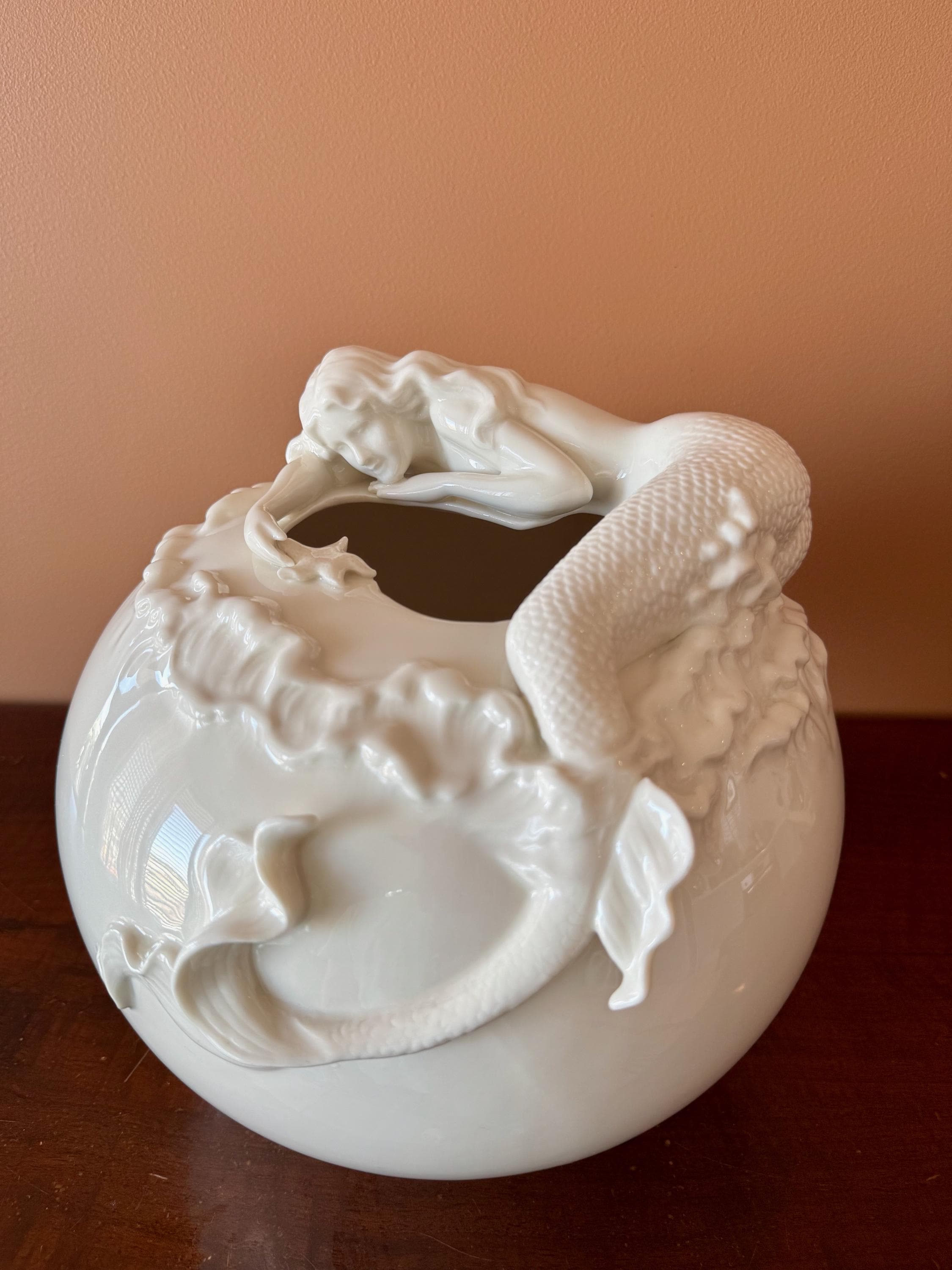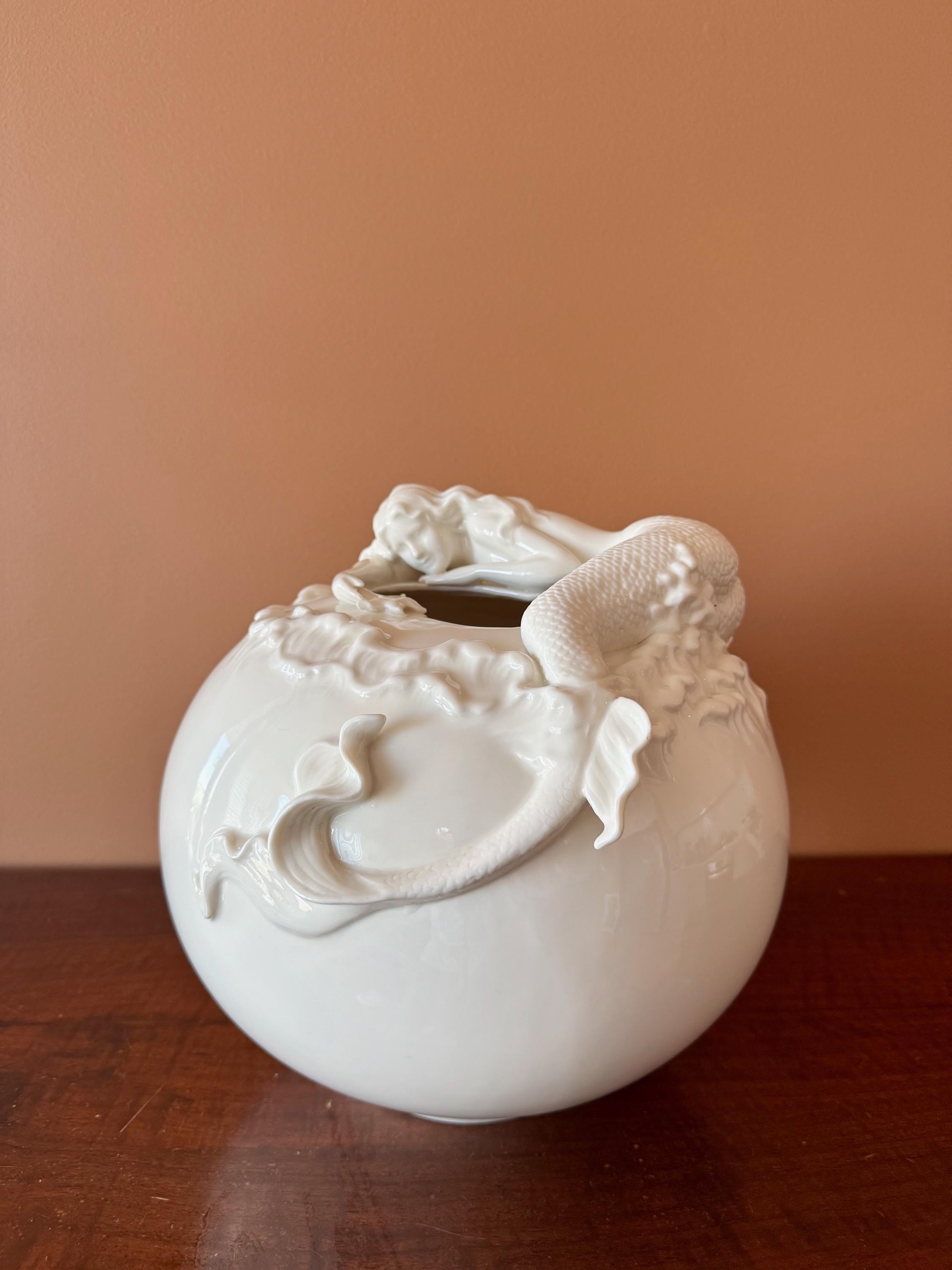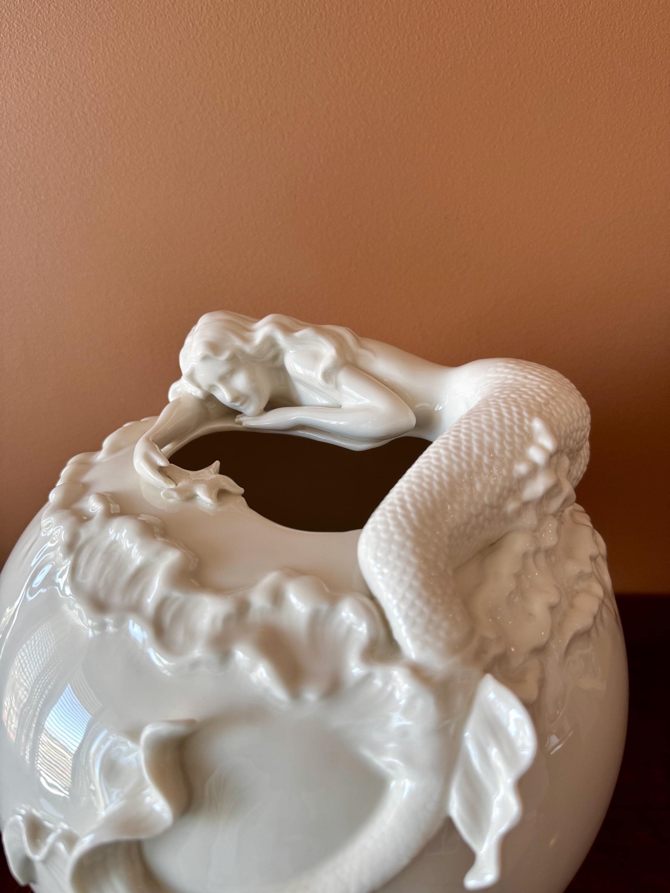 The piece is finished in glossy white glaze and depicts a reclining mermaid resting against textured waves, her tail wrapping fluidly around the body of the vase. The scale and sculptural detailing give it strong decorative presence.