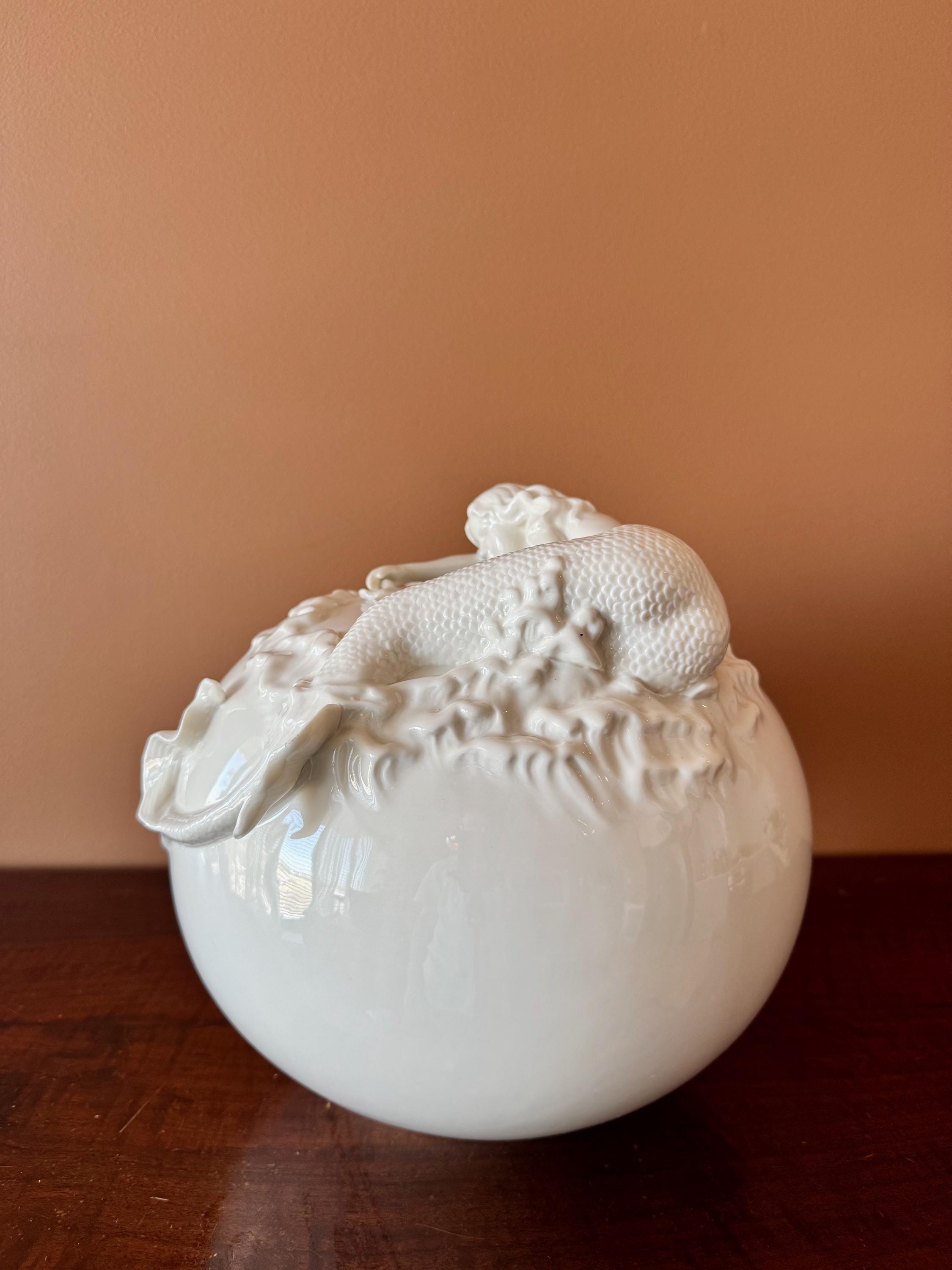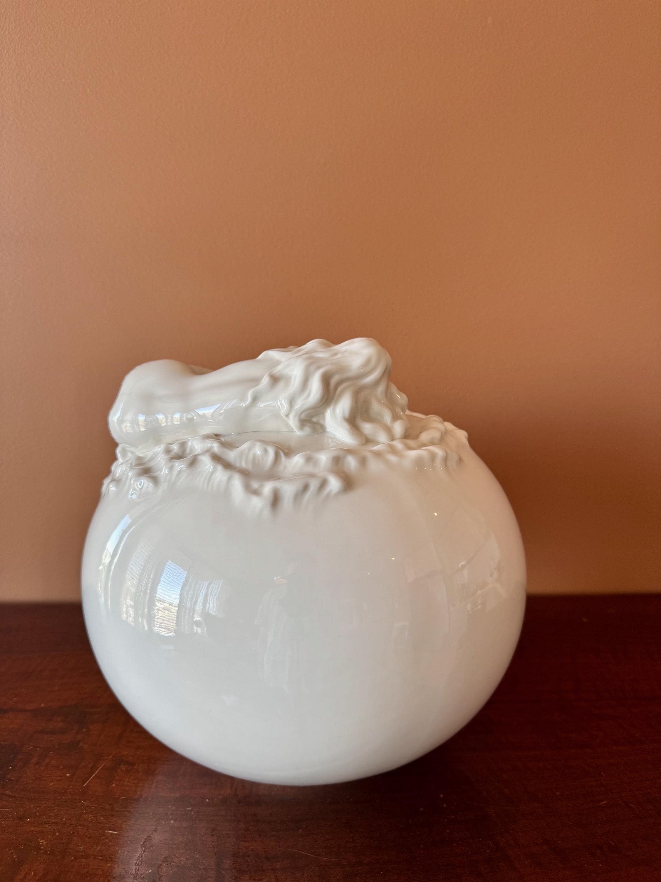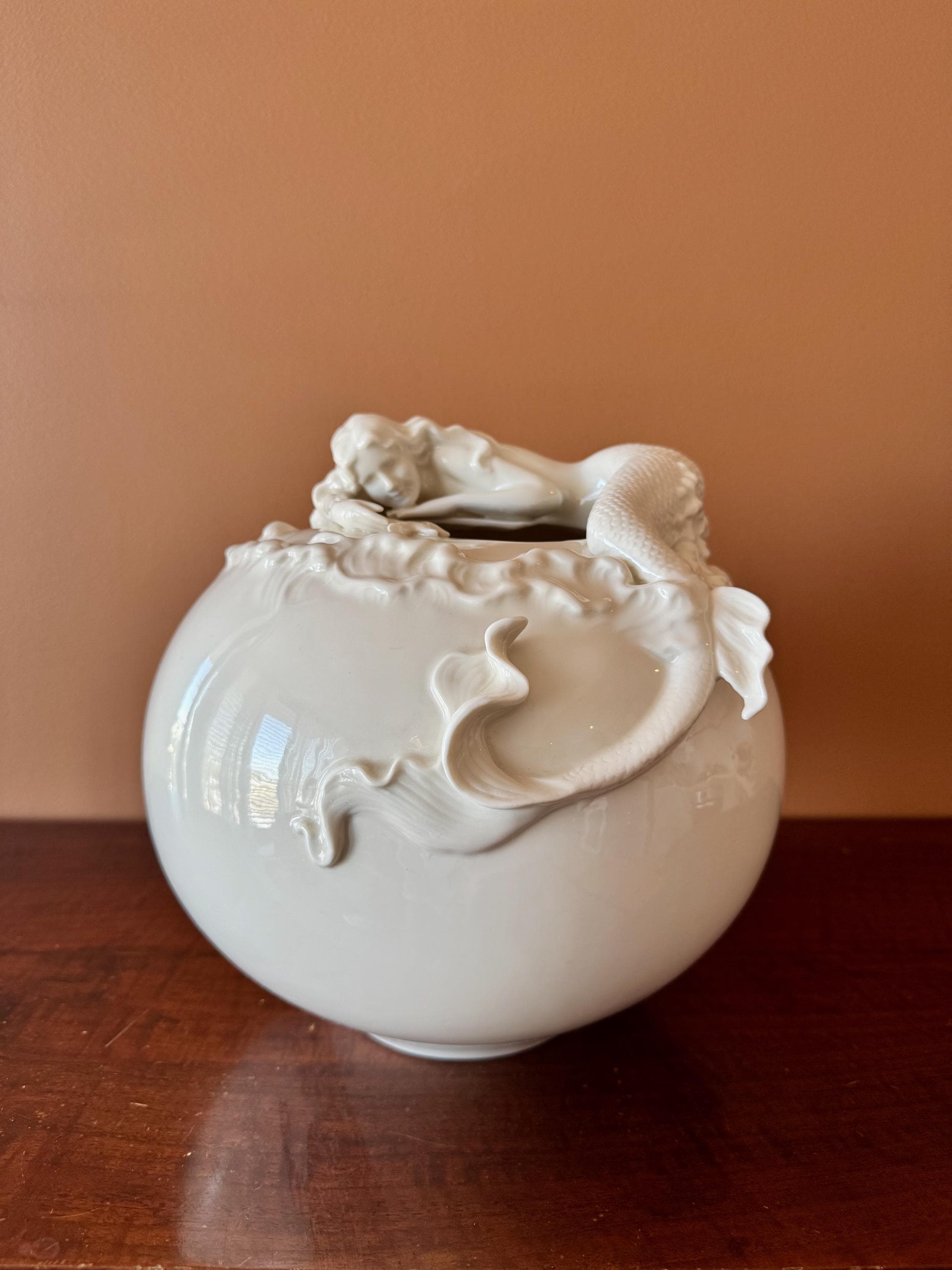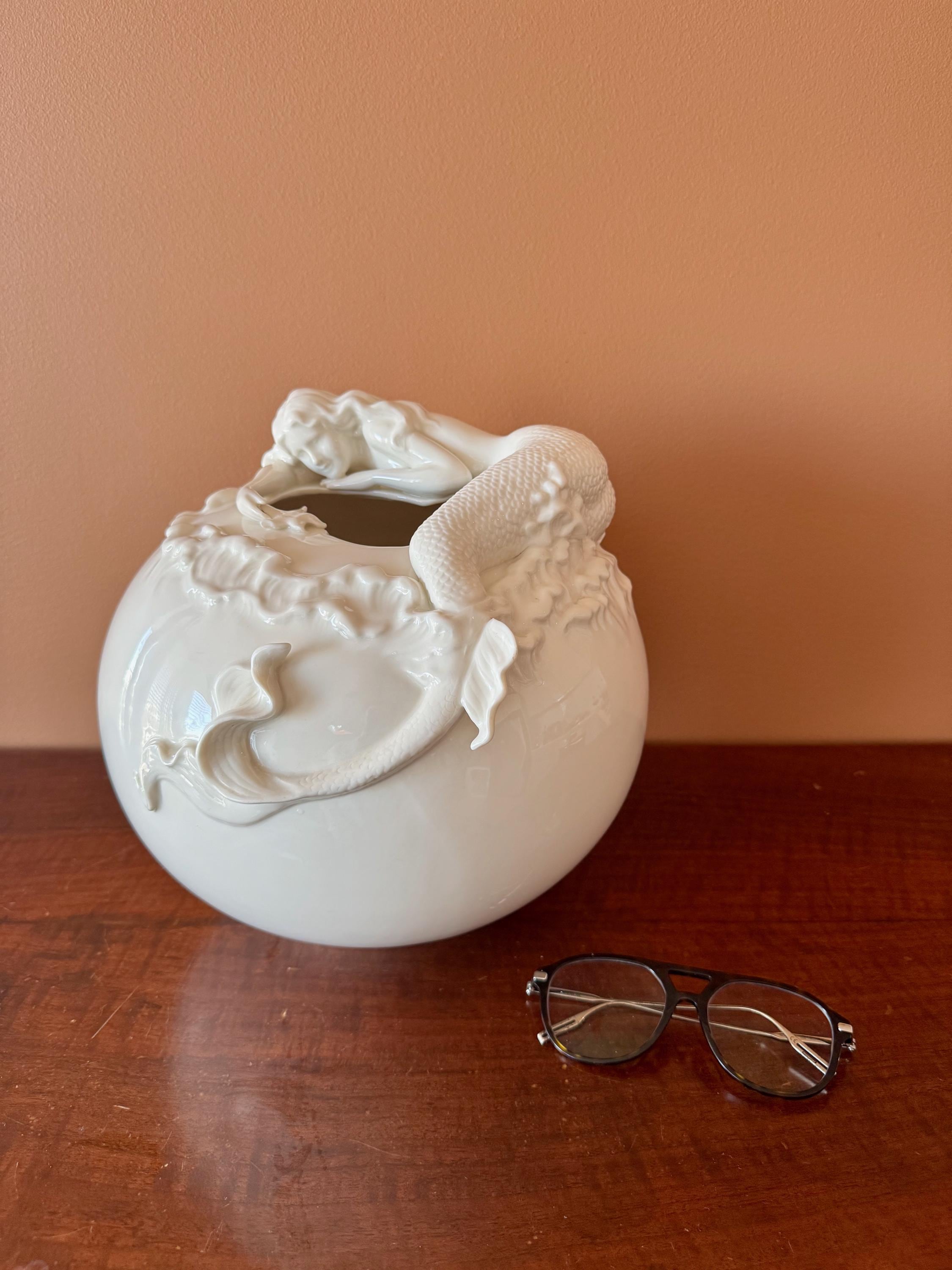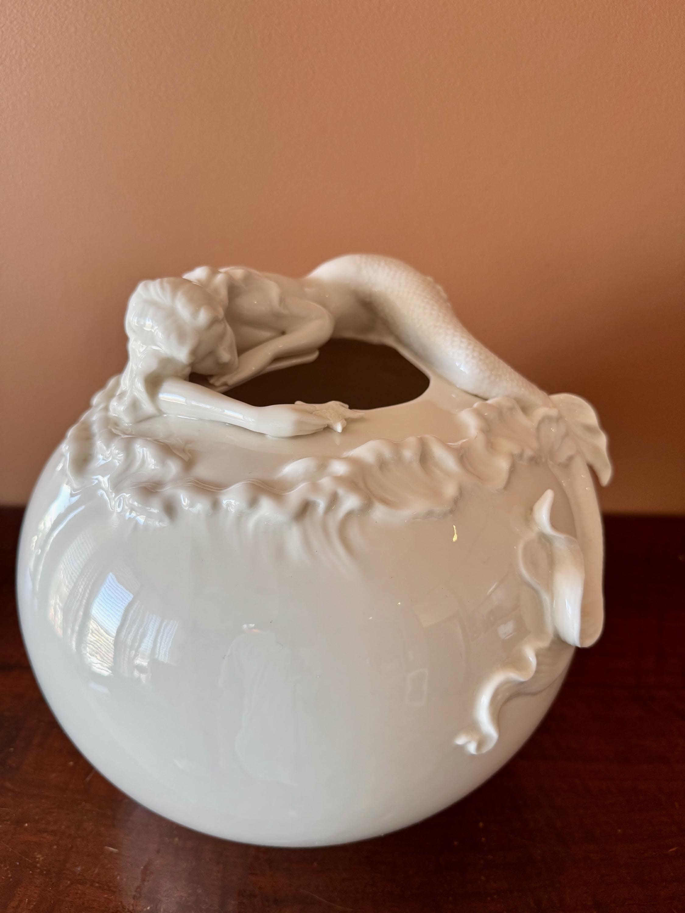 The piece is finished in glossy white glaze and depicts a reclining mermaid resting against textured waves, her tail wrapping fluidly around the body of the vase. The scale and sculptural detailing give it strong decorative presence.