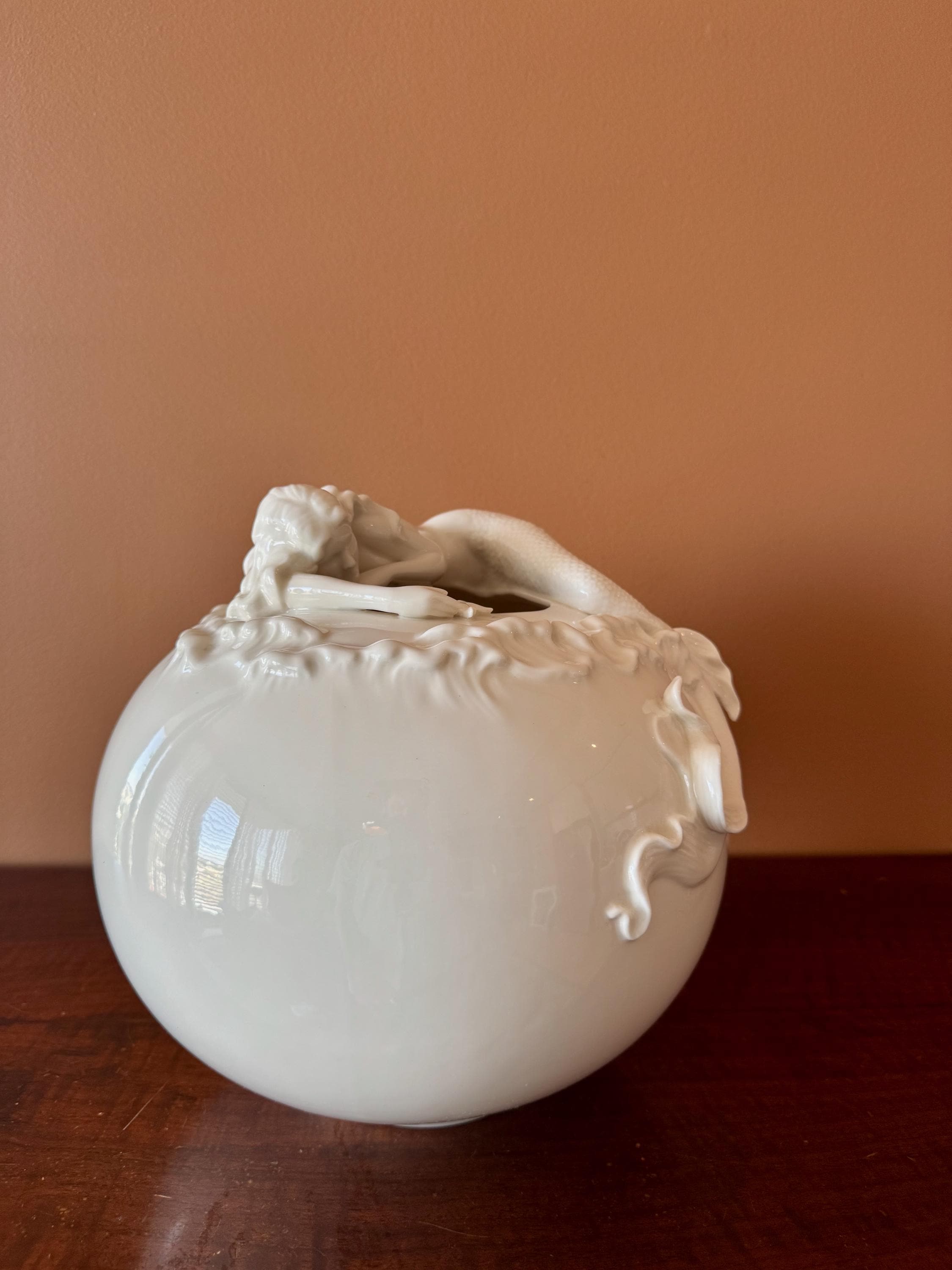 A large vintage Australian ceramic vase by Baymark Australia, featuring a sculptural mermaid draped across the rim.