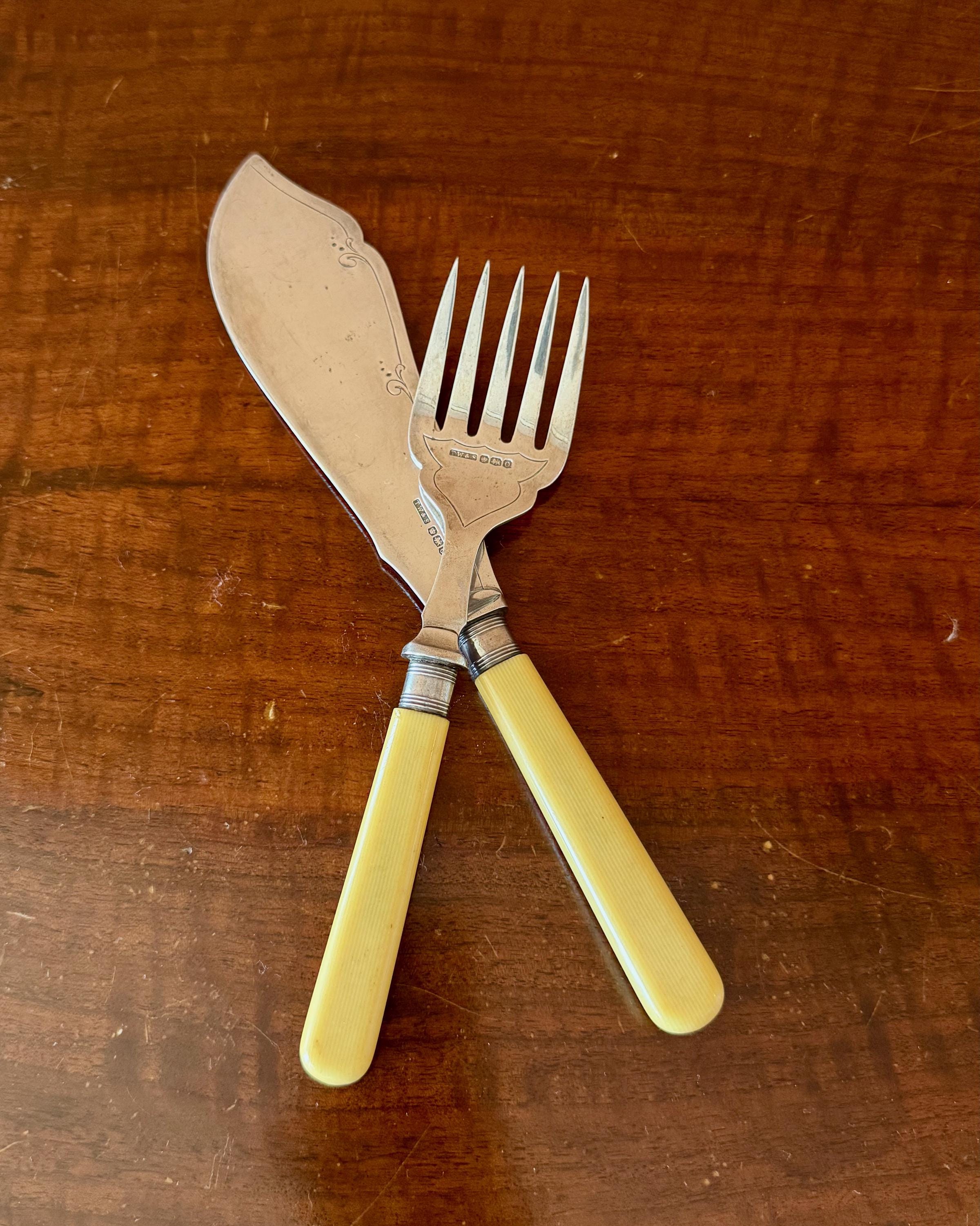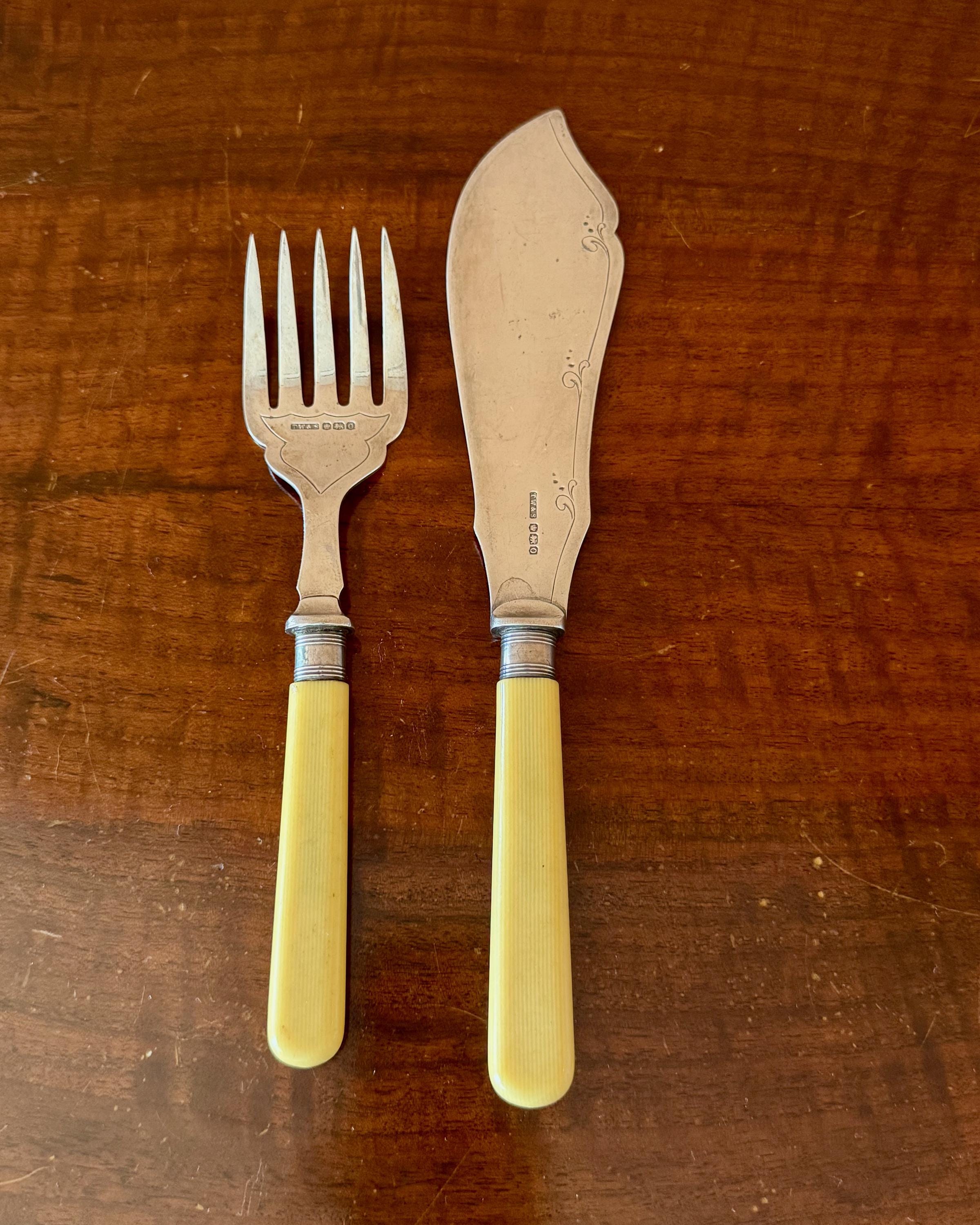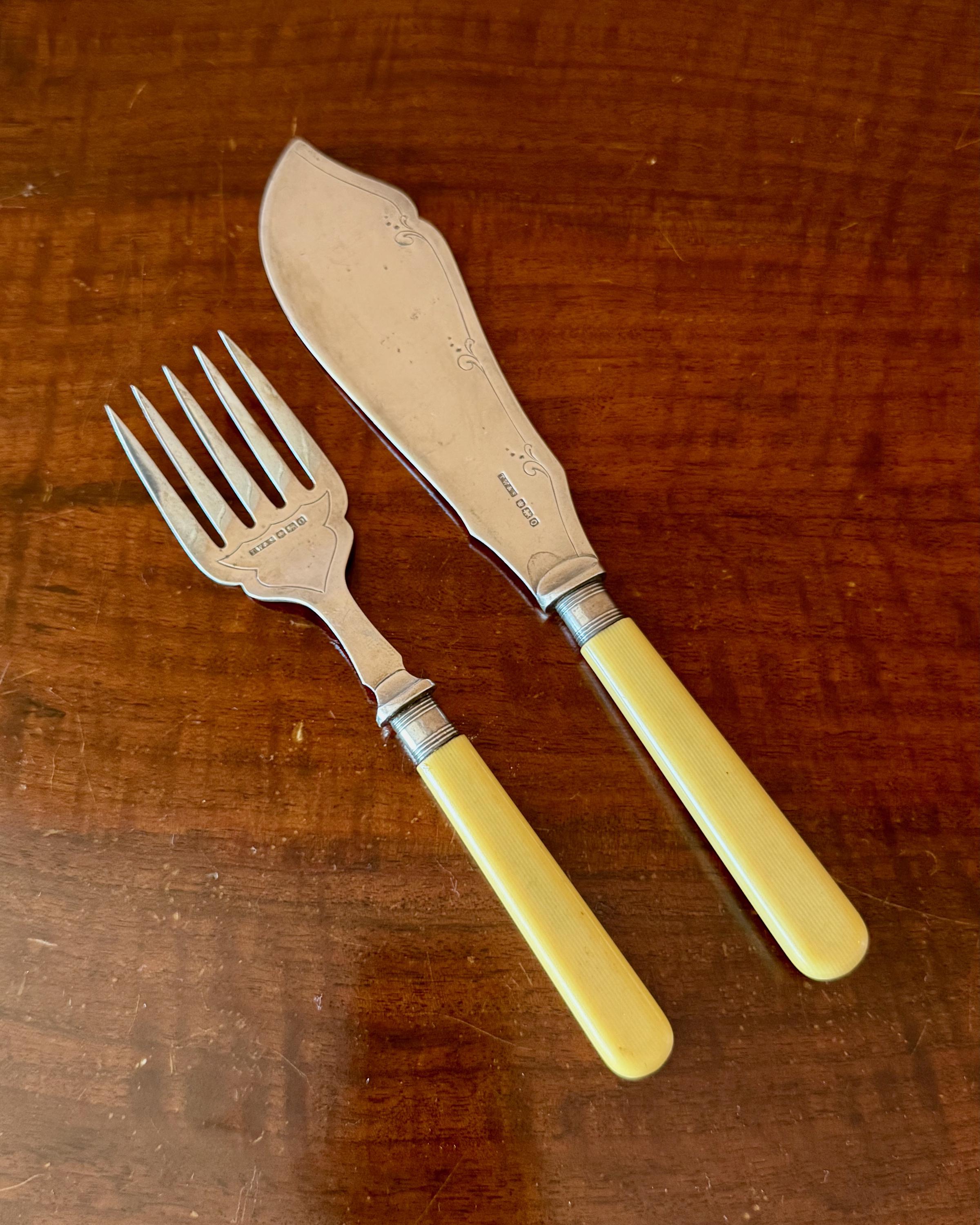 The silver surfaces feature delicate engraved detailing along the blade edges. The ribbed bone handles have developed a warm cream tone consistent with age.