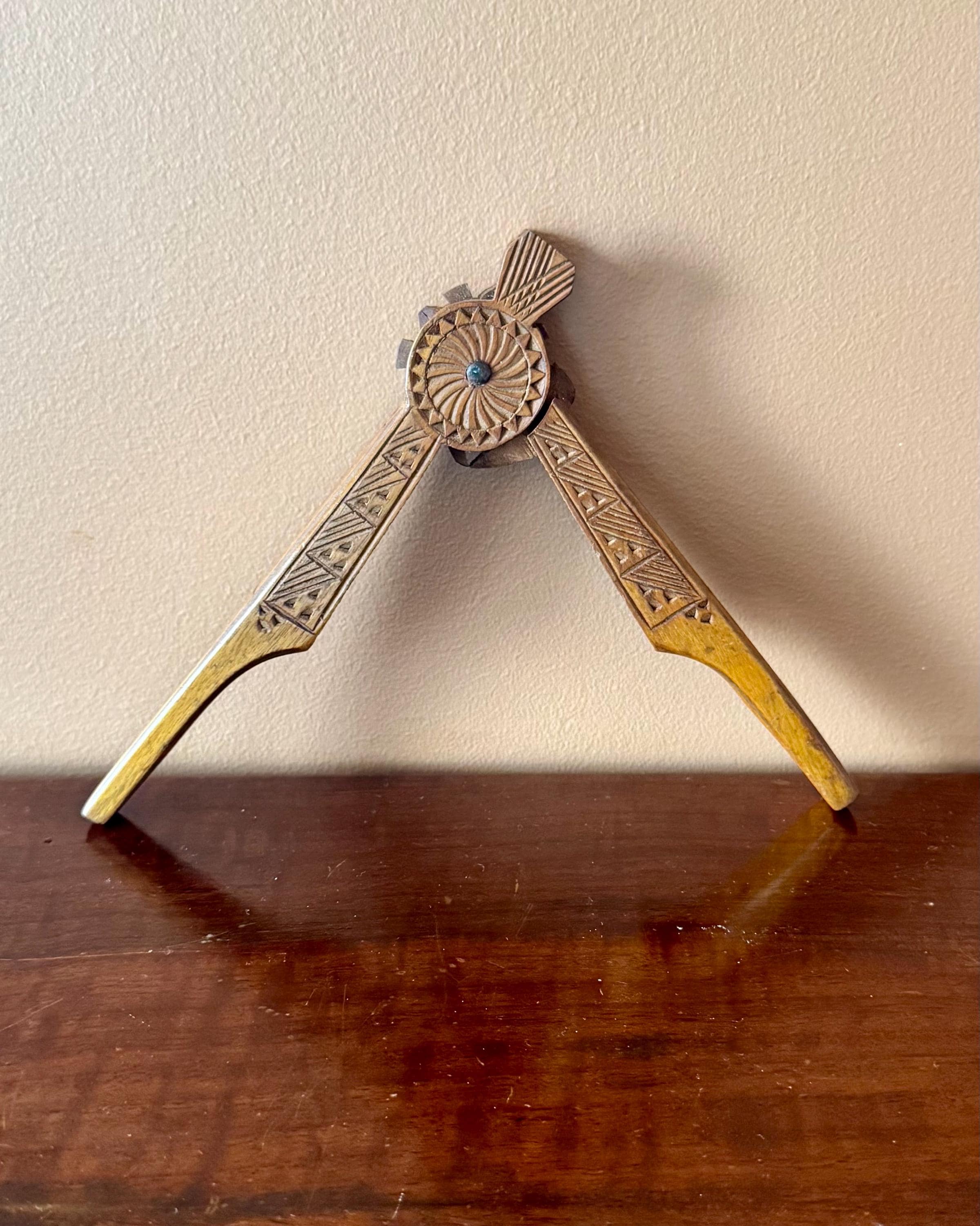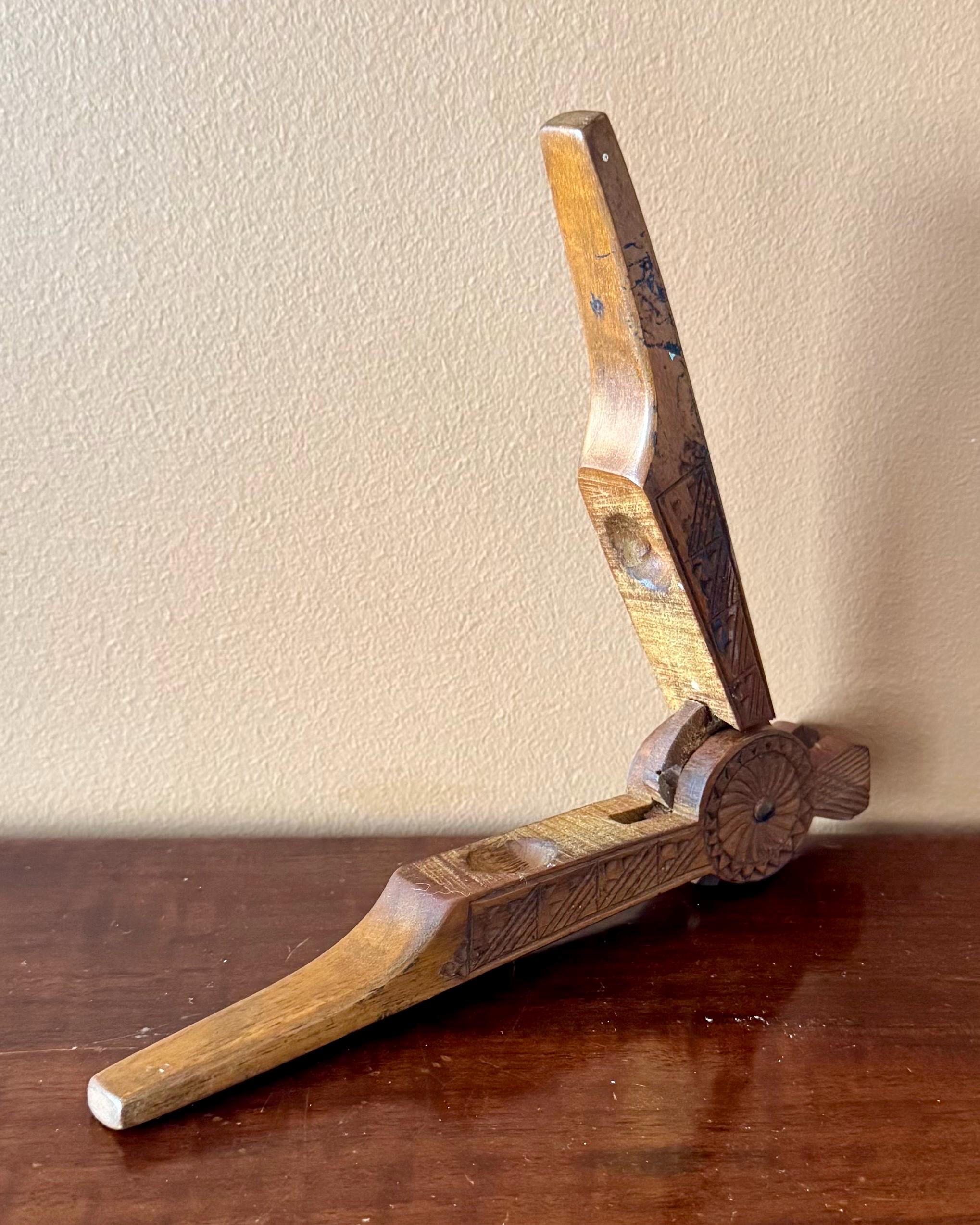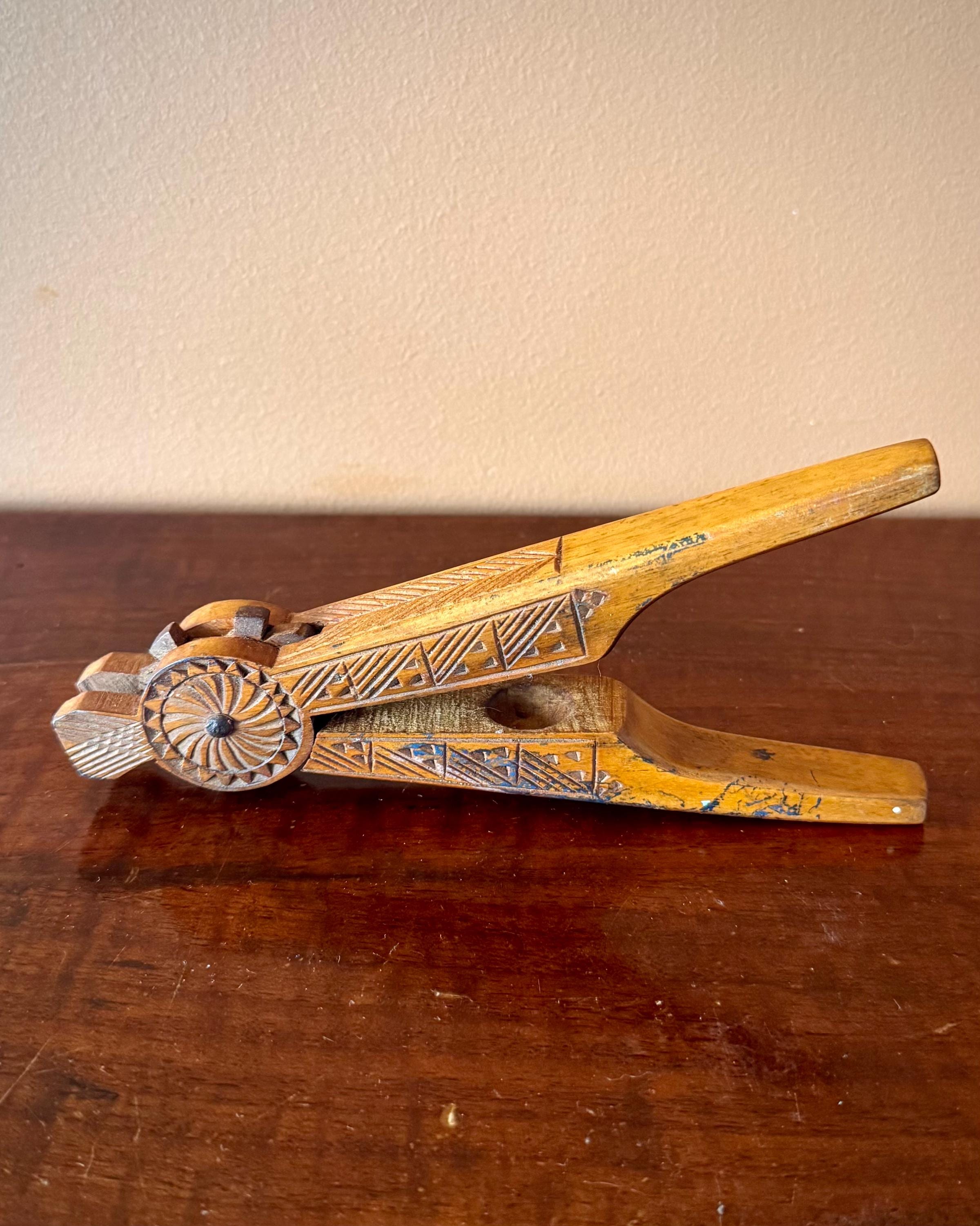 Beautiful rustic hand carved wooden nutcracker featuring traditional geometric chip carving and a carved rosette pivot detail.