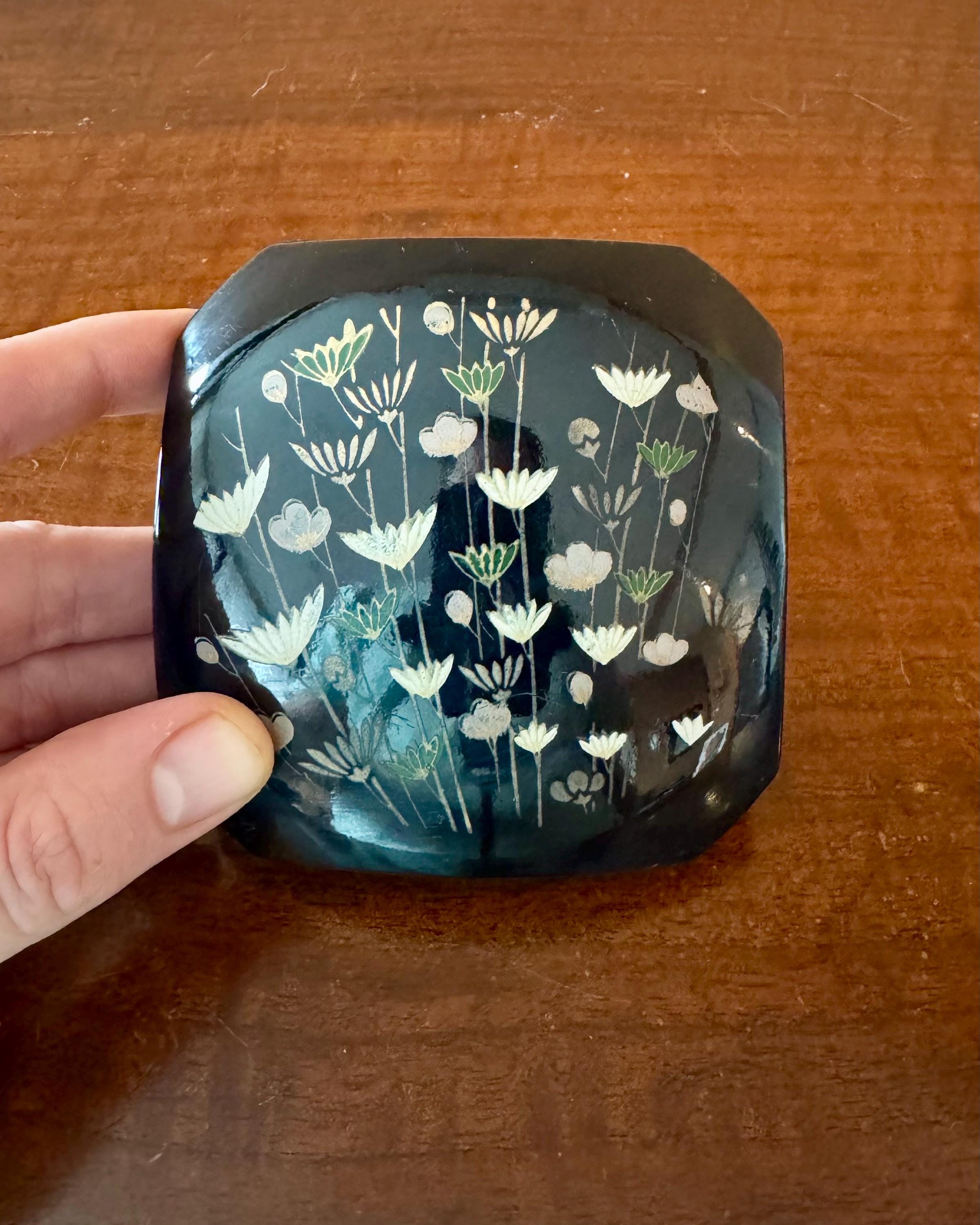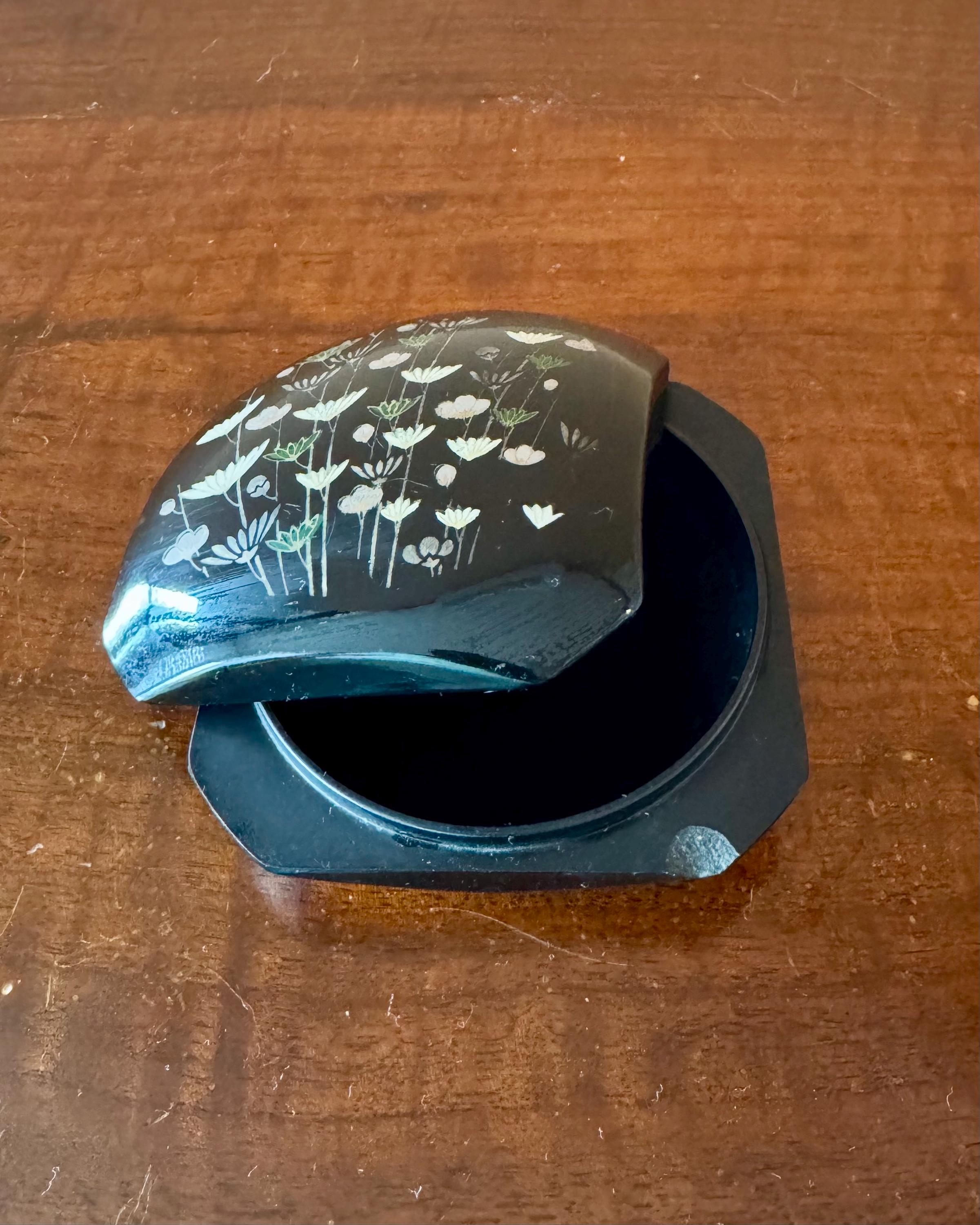 Charming vintage Japanese lacquer box featuring delicate metallic floral decoration on a glossy black ground.
