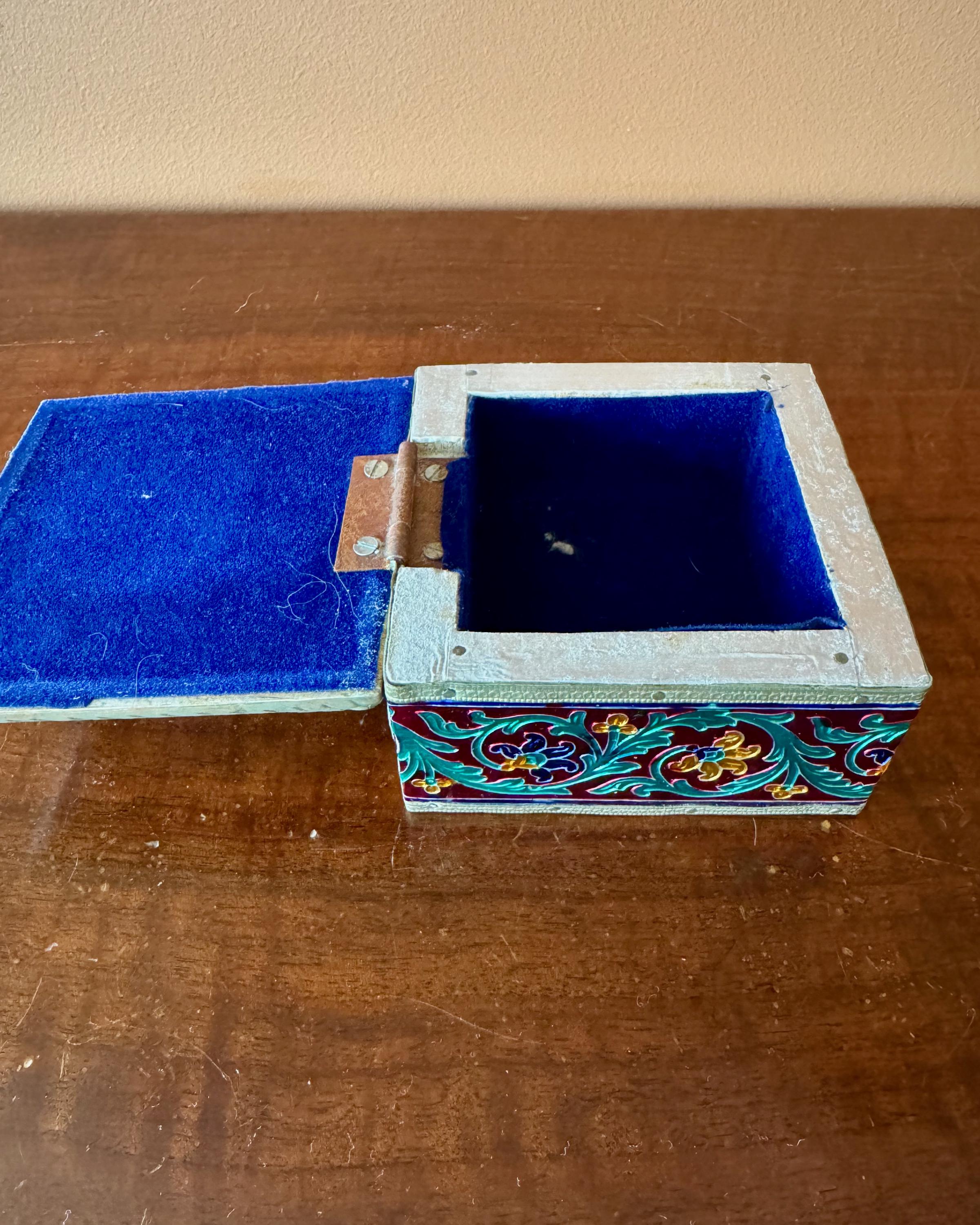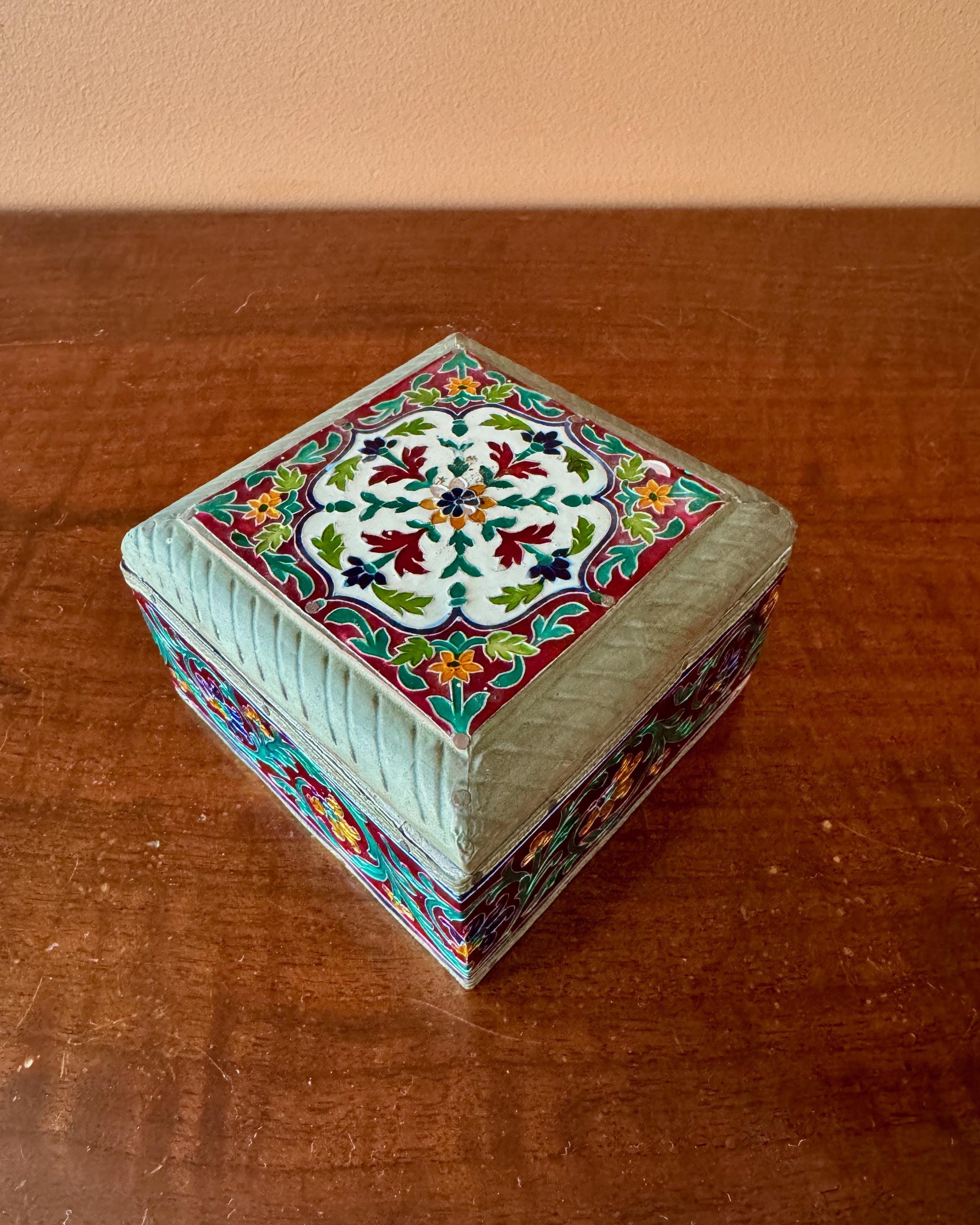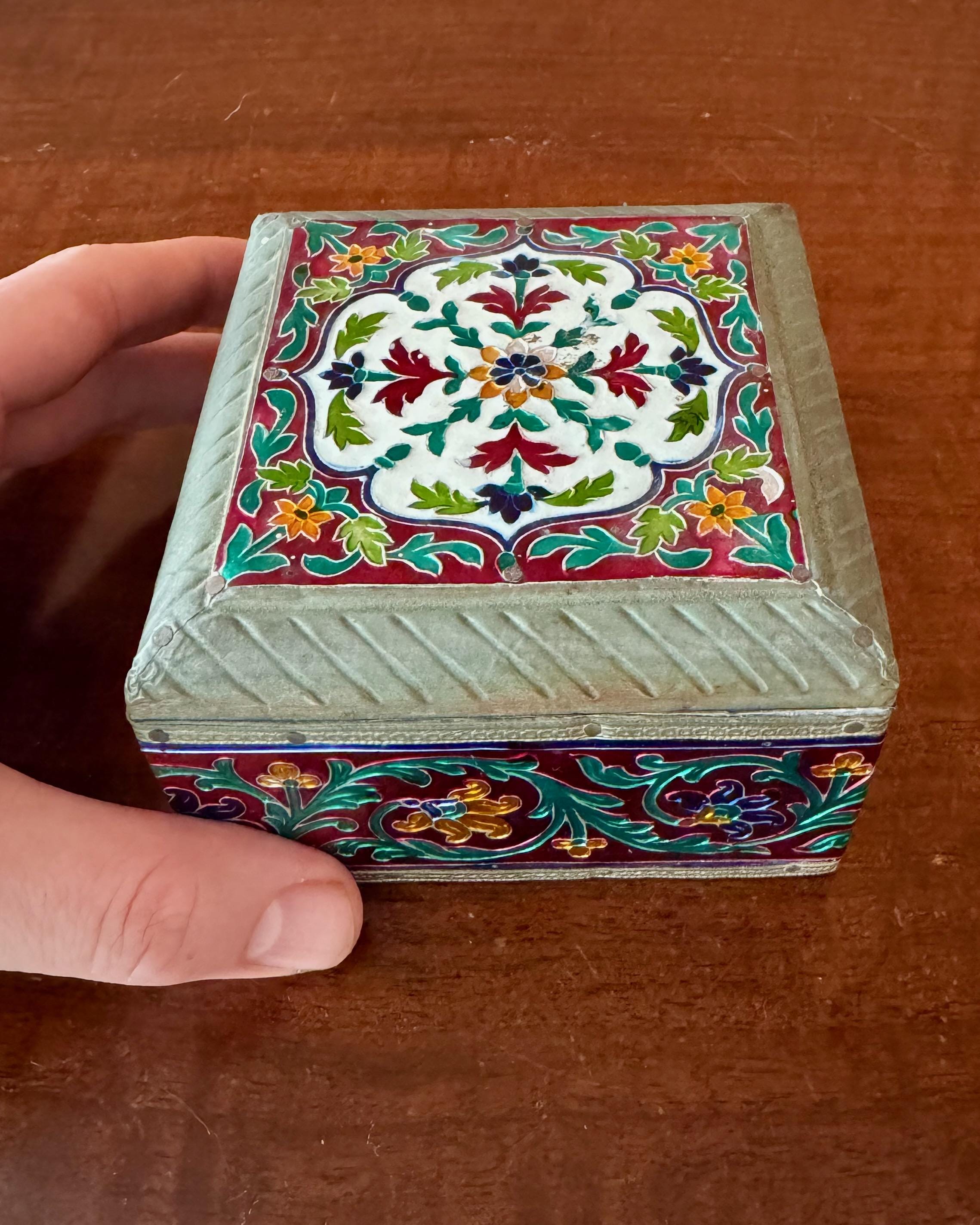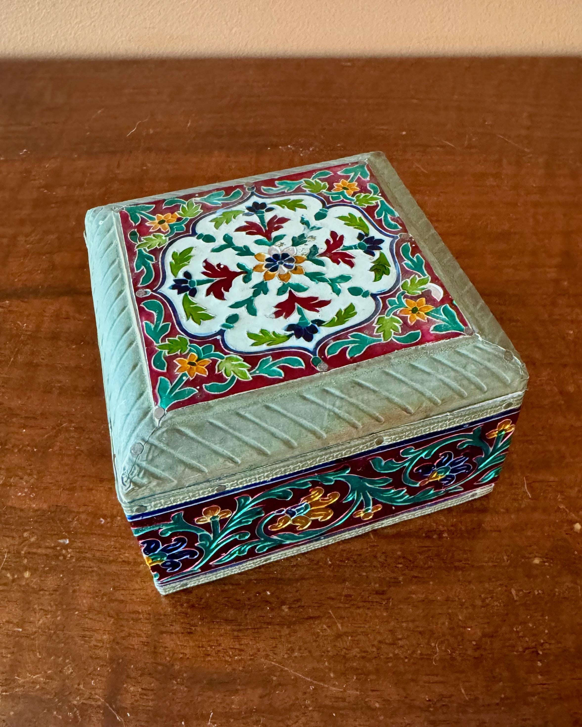 Beautiful vintage enamel decorated box featuring vibrant red, green, cobalt and gold floral panels framed with brass trim.